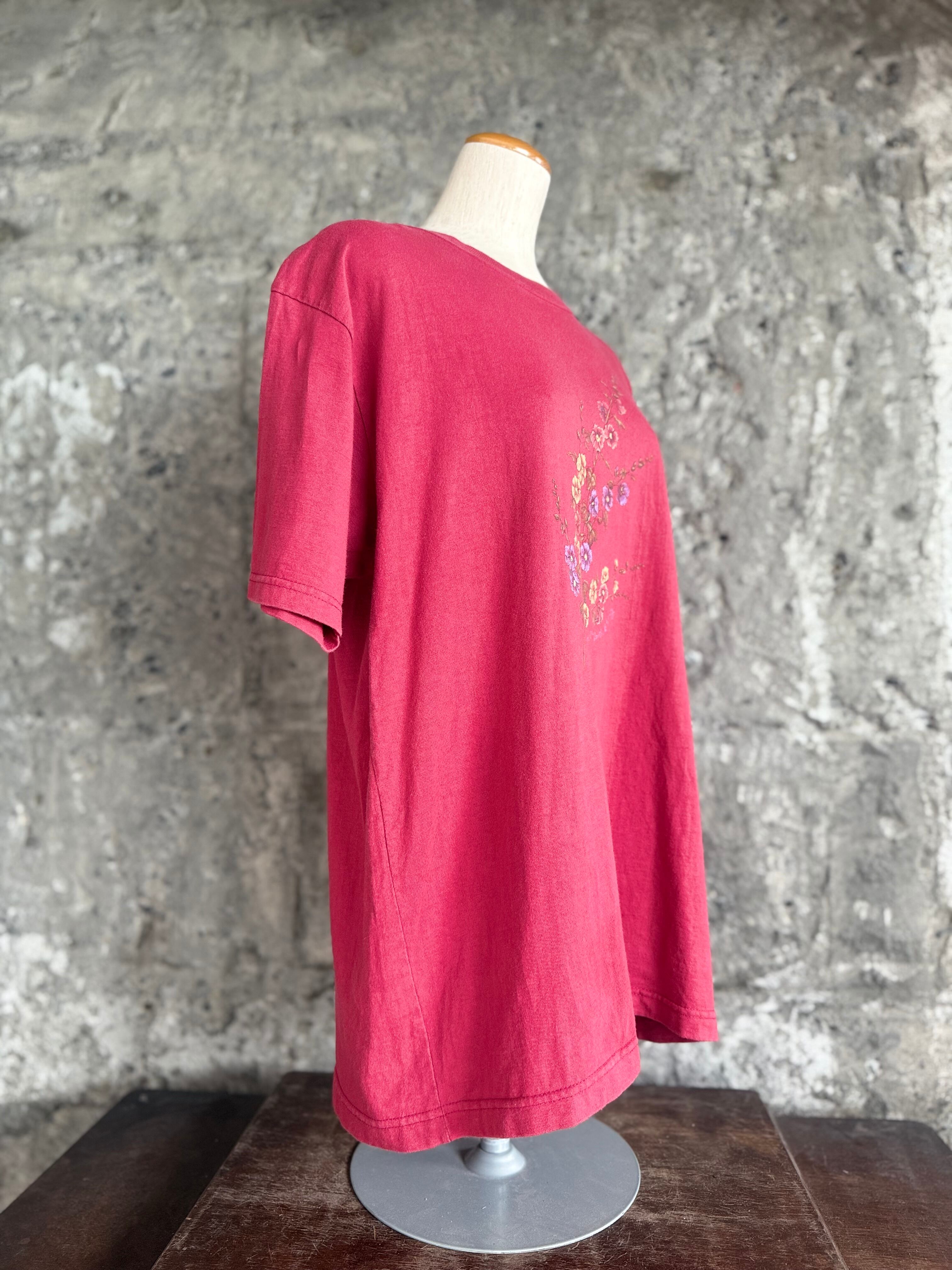 バックプリント 花柄Tシャツ|フラワープリント×くすみレッド
