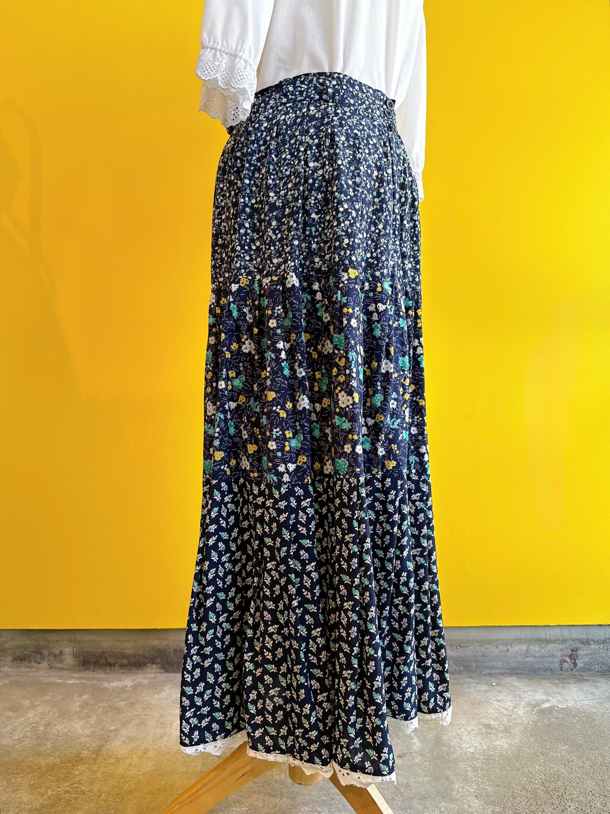 ヨーロッパ古着 ネイビー ブルー 花柄ティアードスカート