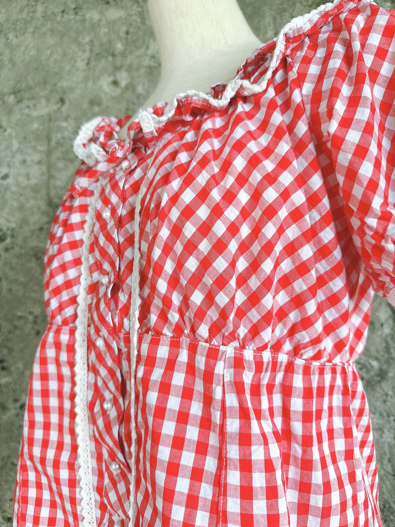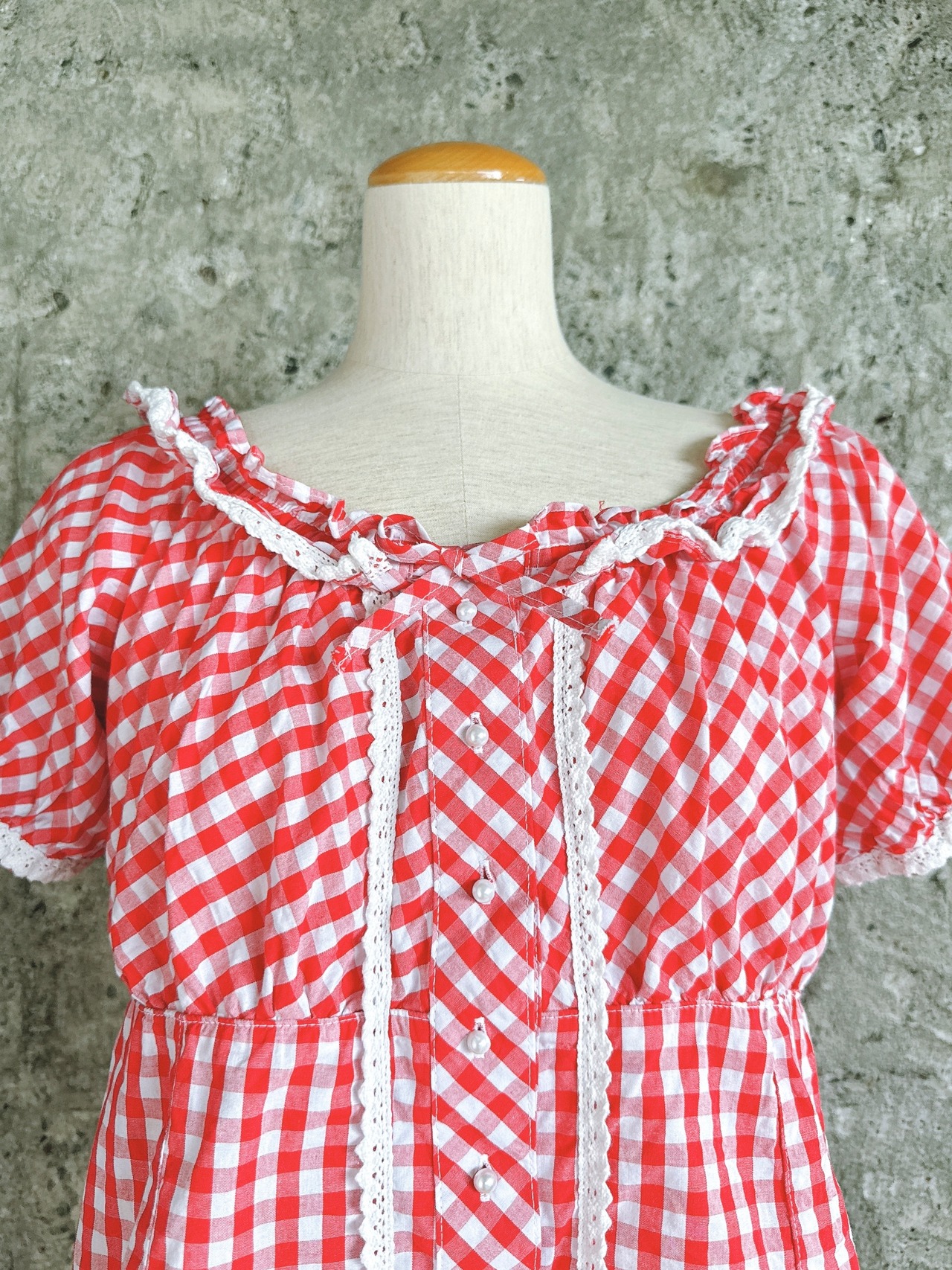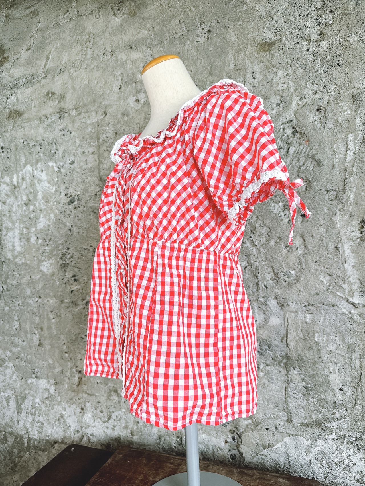 ギンガムとレースのヨーロピアンガーリーブラウス リボン レッド
