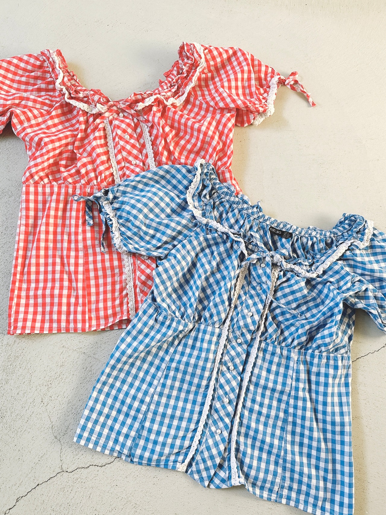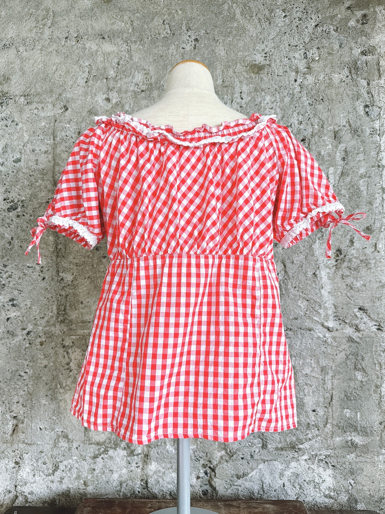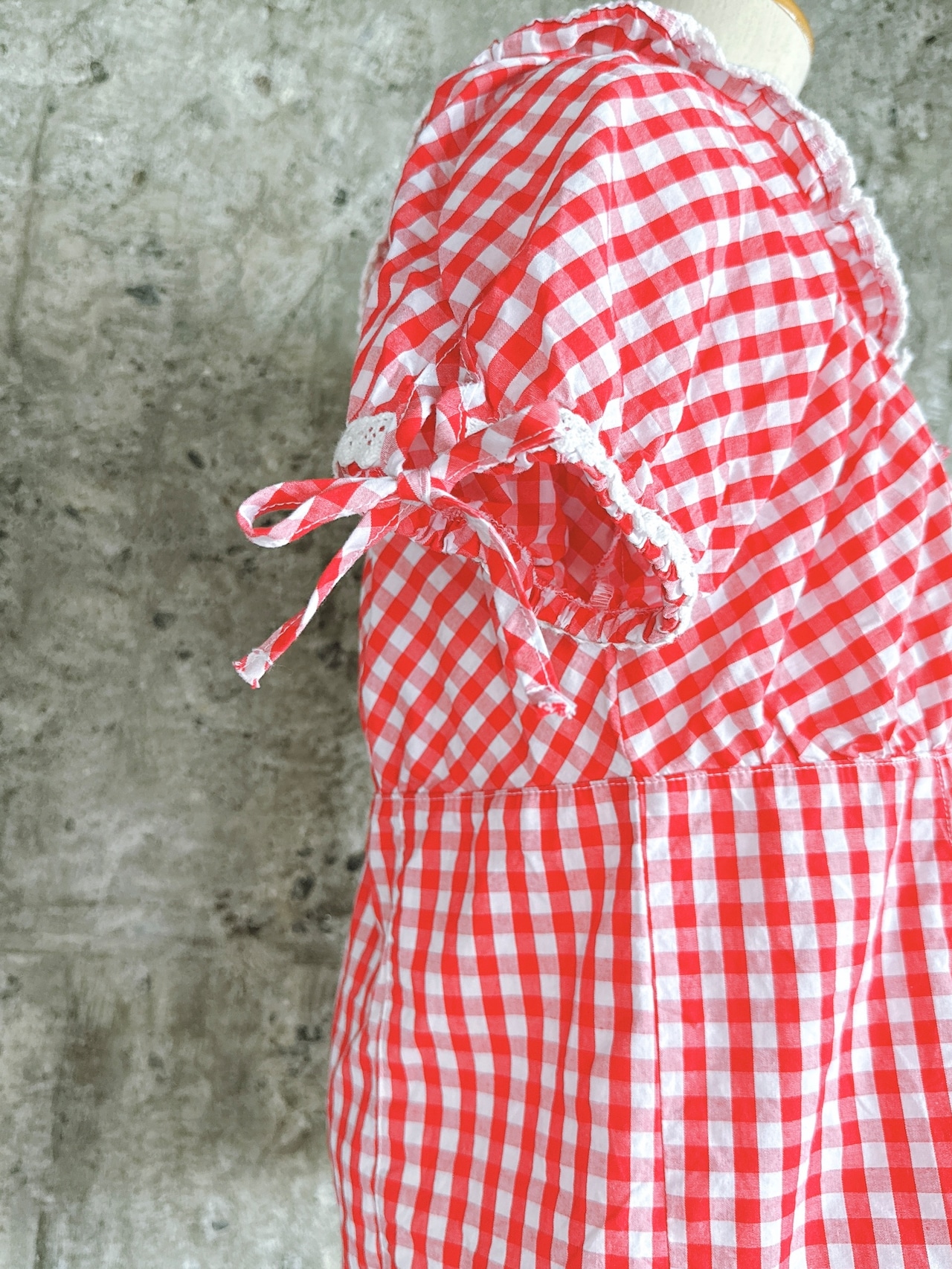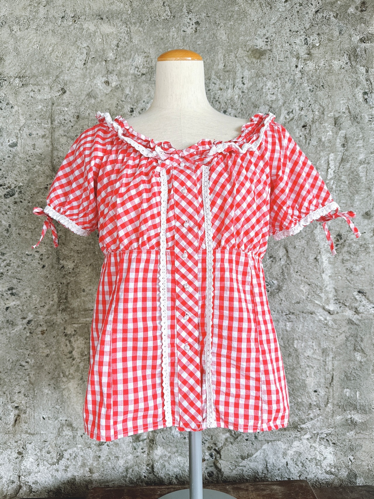 ギンガムとレースのヨーロピアンガーリーブラウス リボン レッド