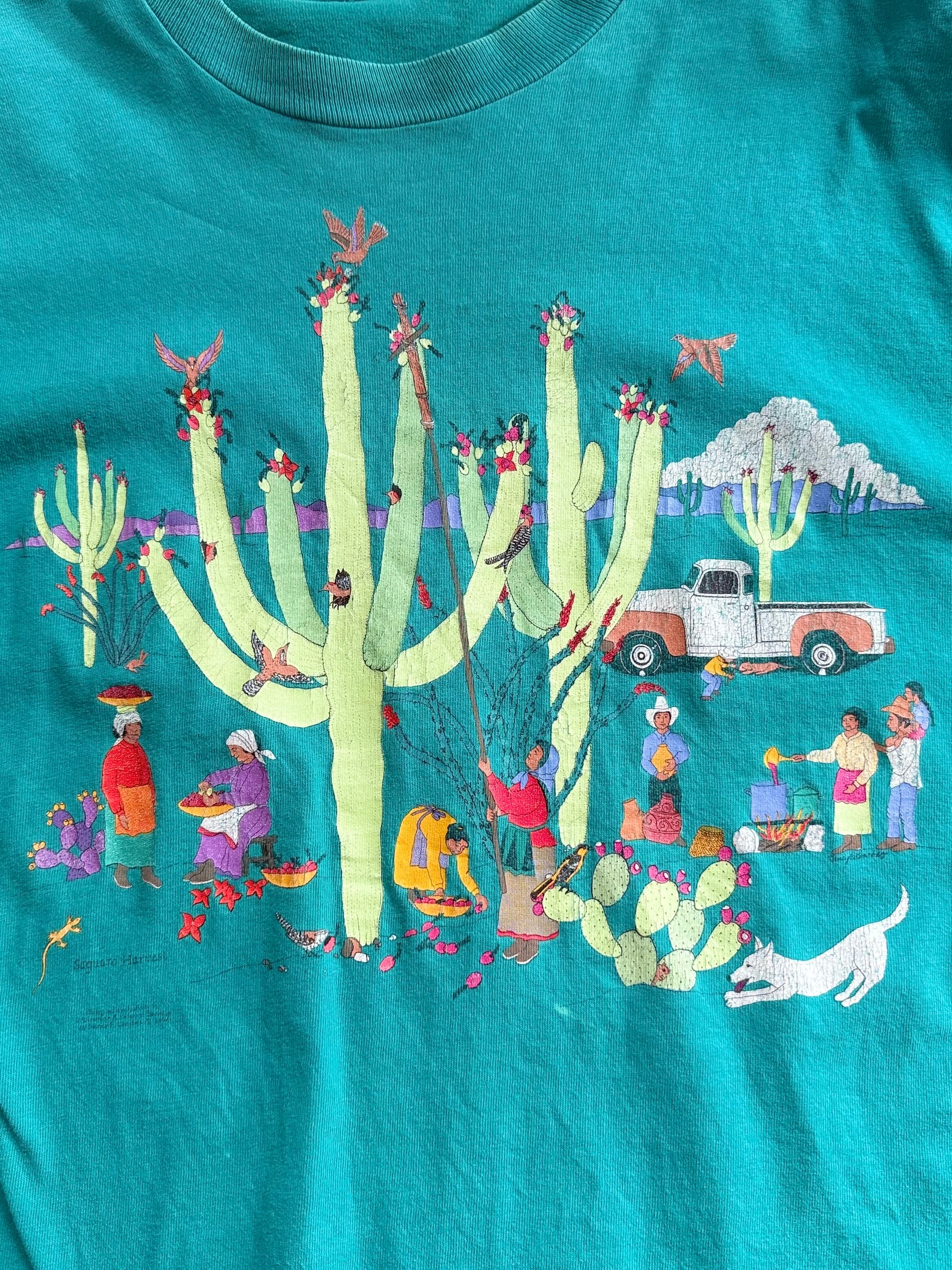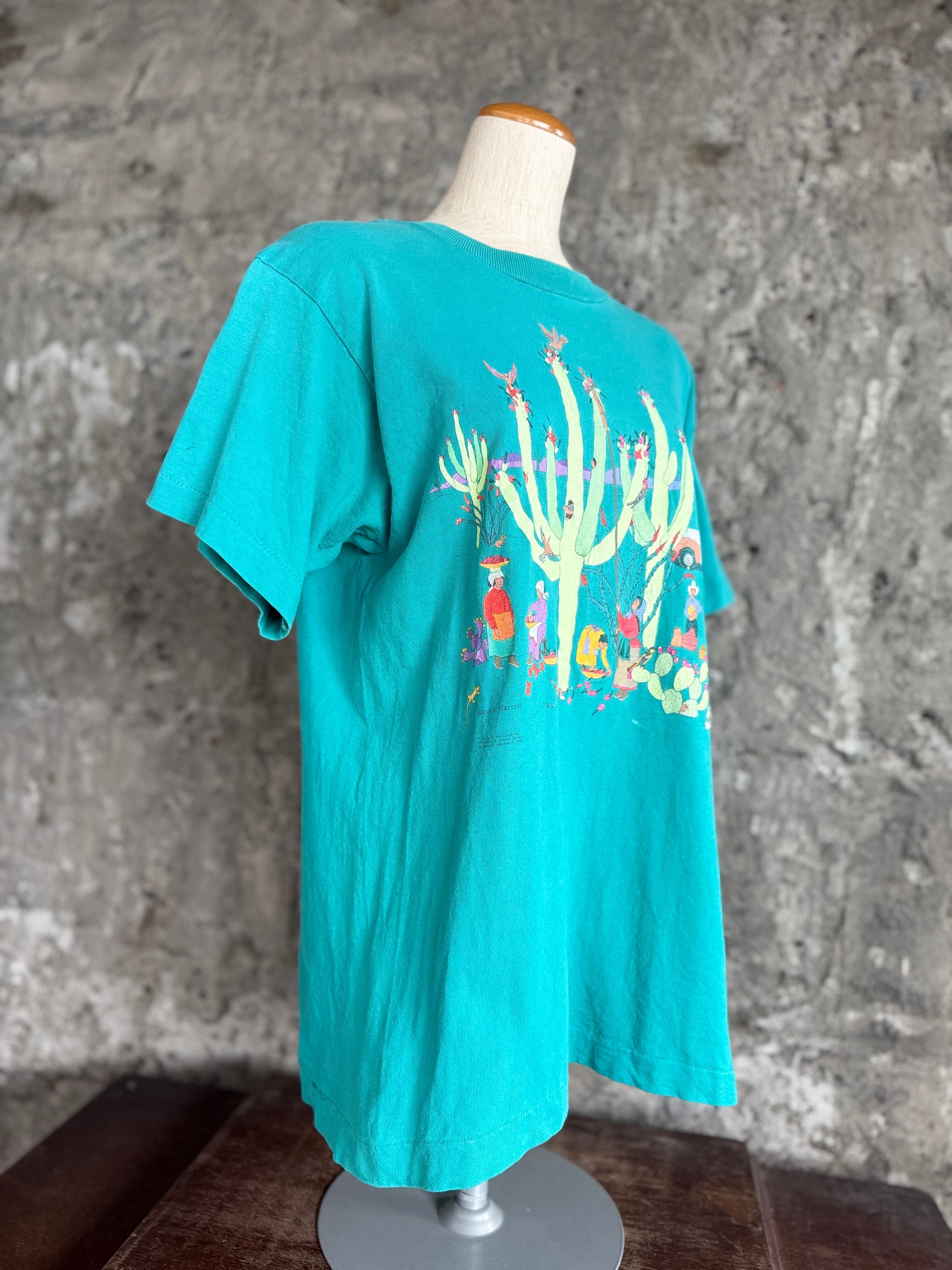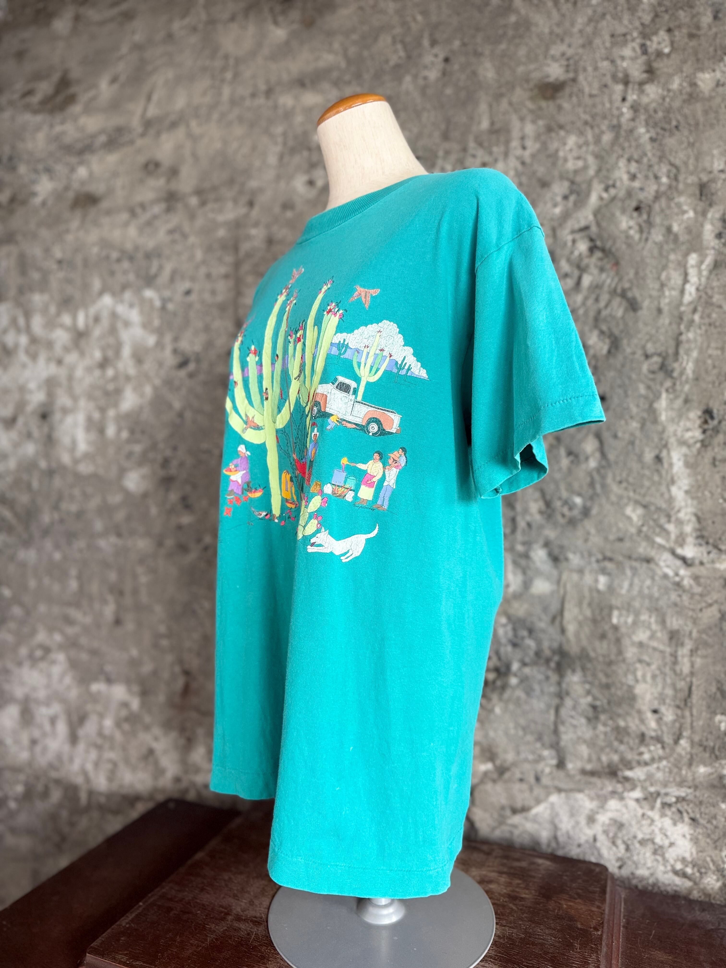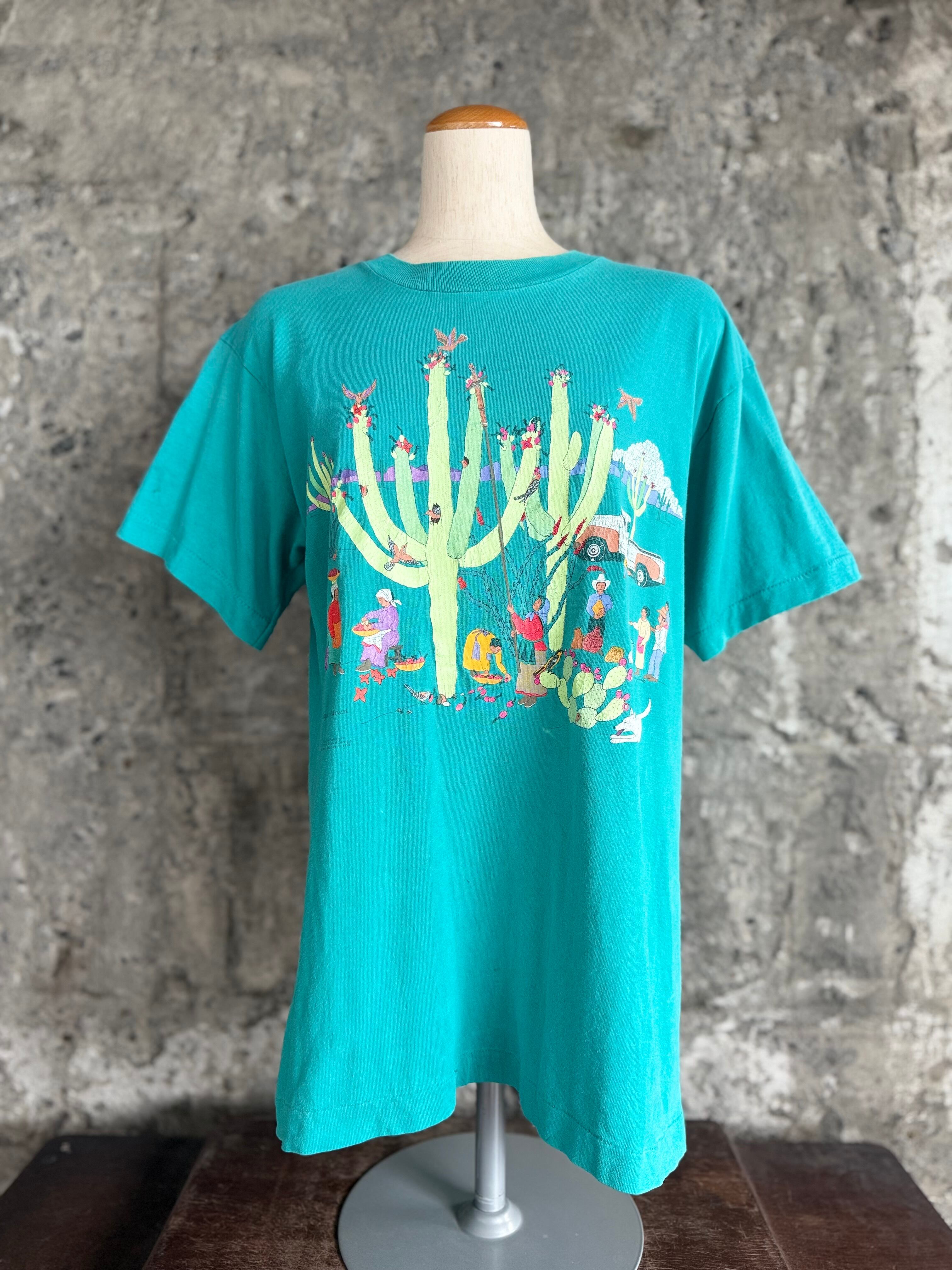 メキシカンアート サボテン収穫プリントTシャツ(グリーン)