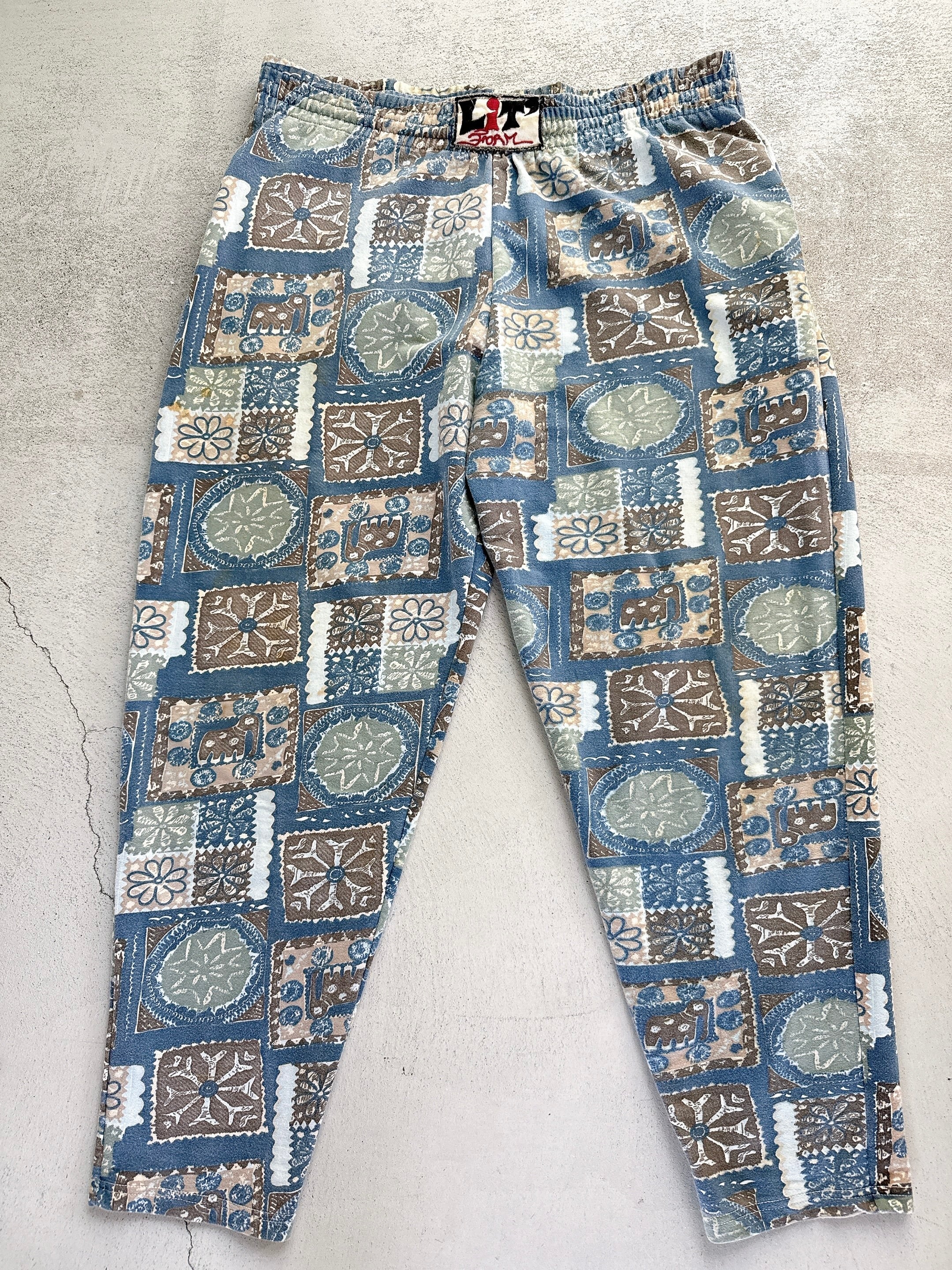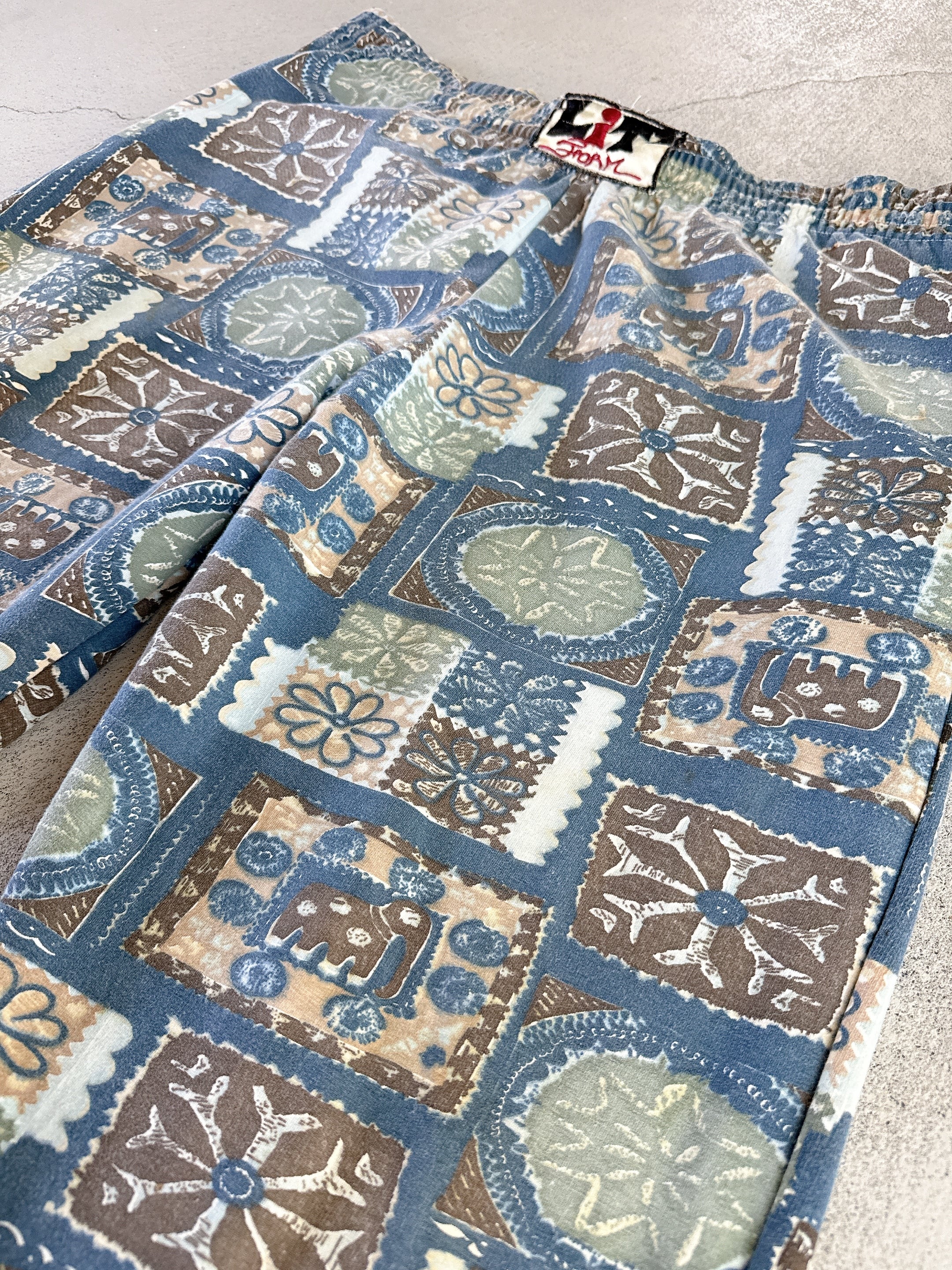落ち着いたブルートーンをベースに、フラワーやエレファントモチーフを散りばめた総柄パンツ。