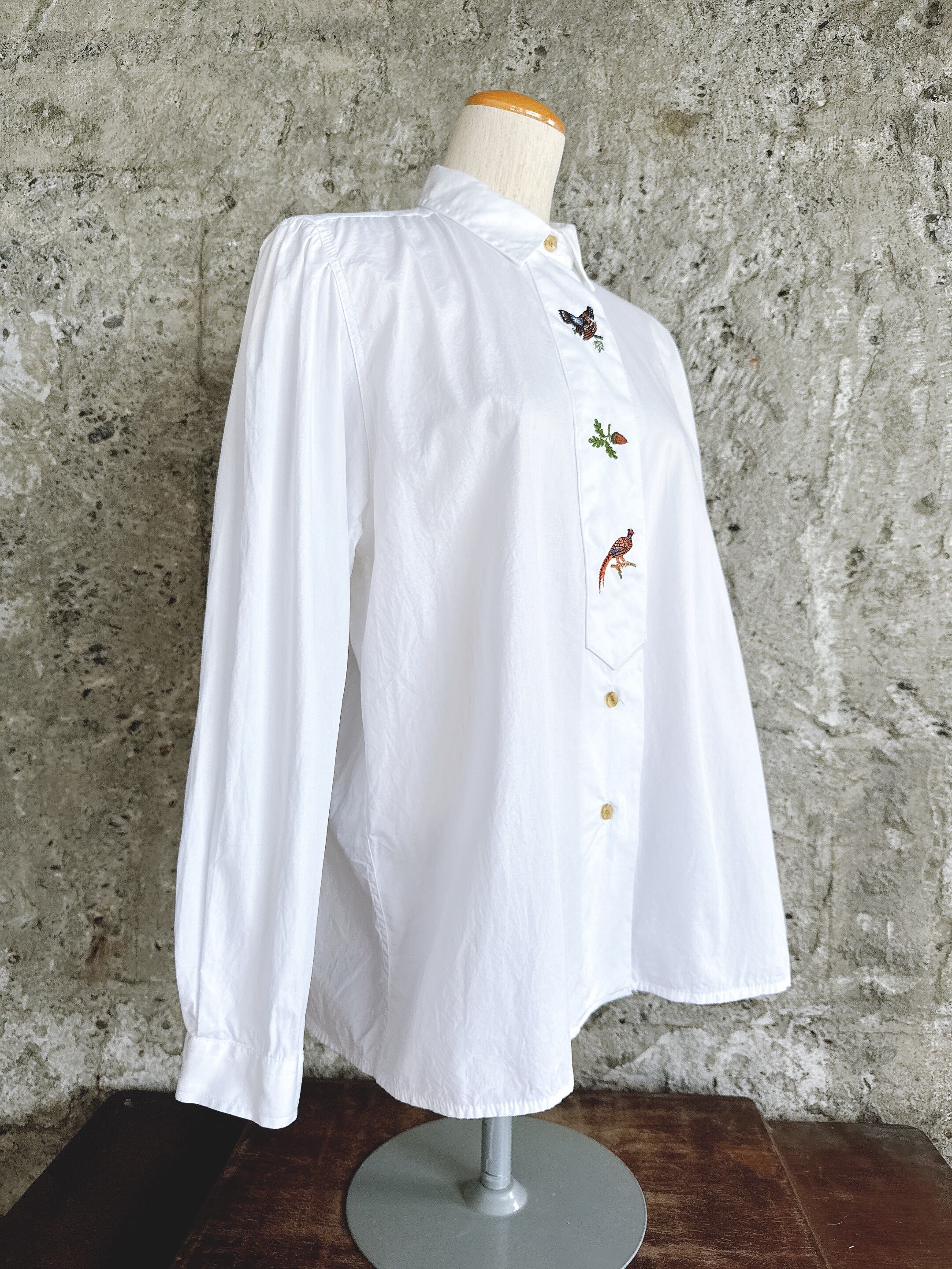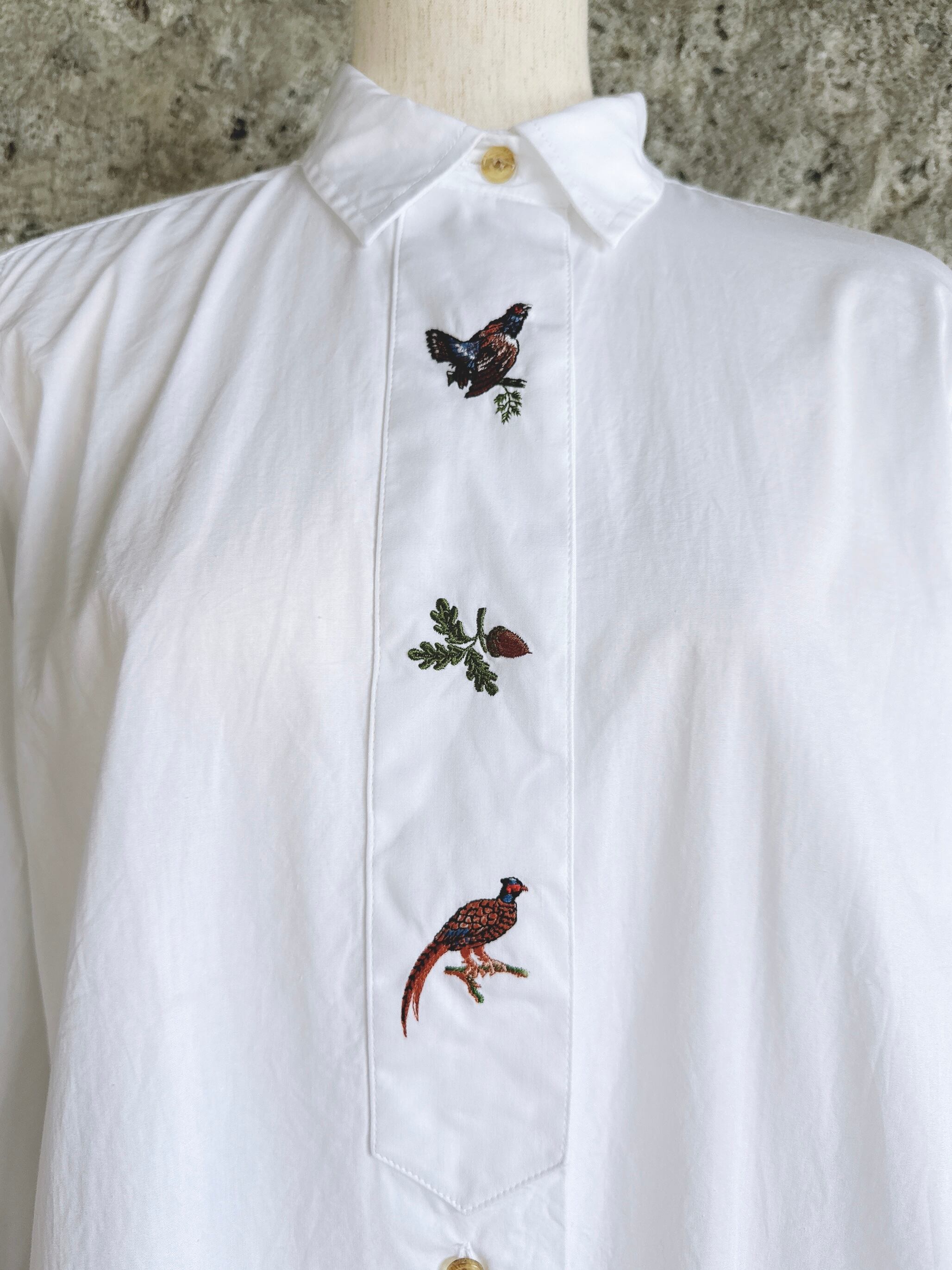 Aumühle 鳥と植物刺繍 ホワイトチロルシャツ コットンシャツ