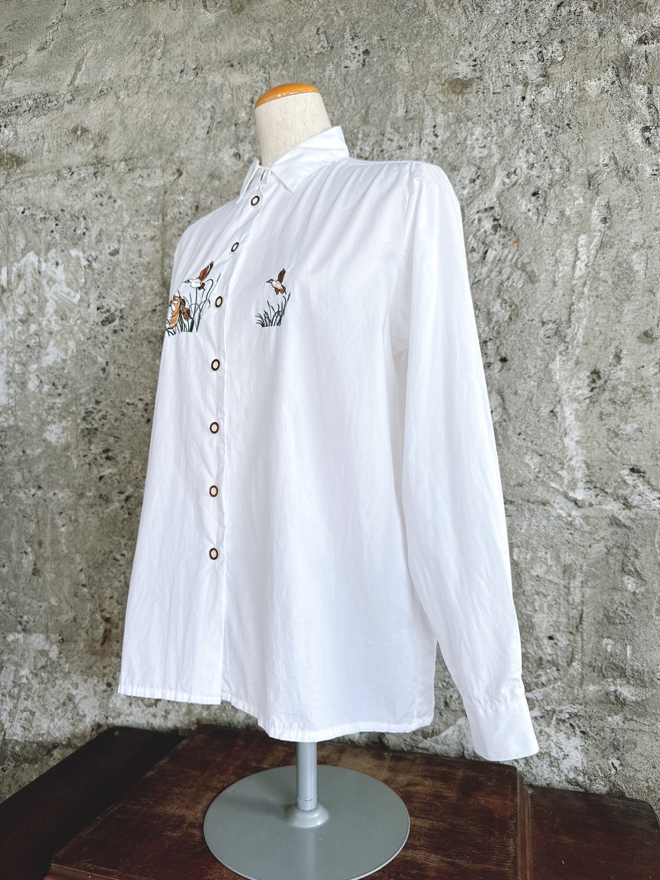 フロントに飛び立つ鳥と草原の刺繍が施されたホワイトシャツ。