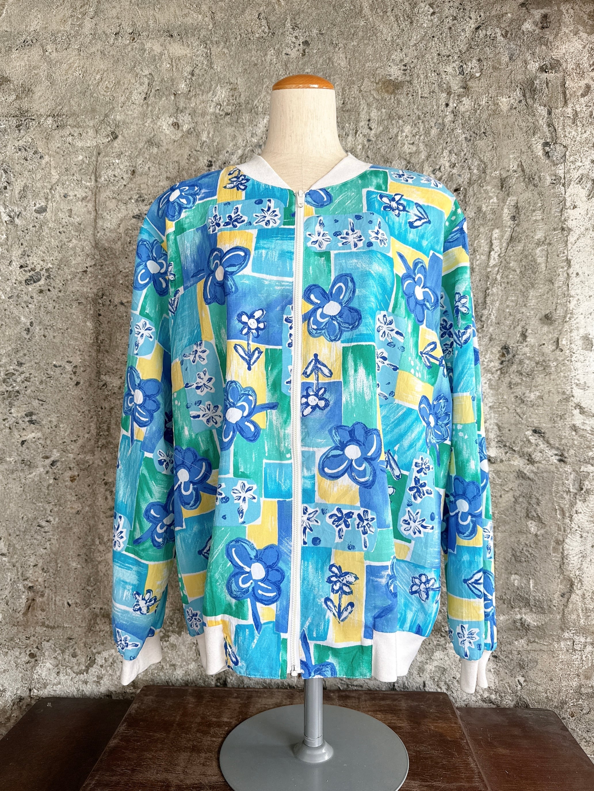 爽やかなブルーとイエローのブロック柄に、手描き風のお花プリント。