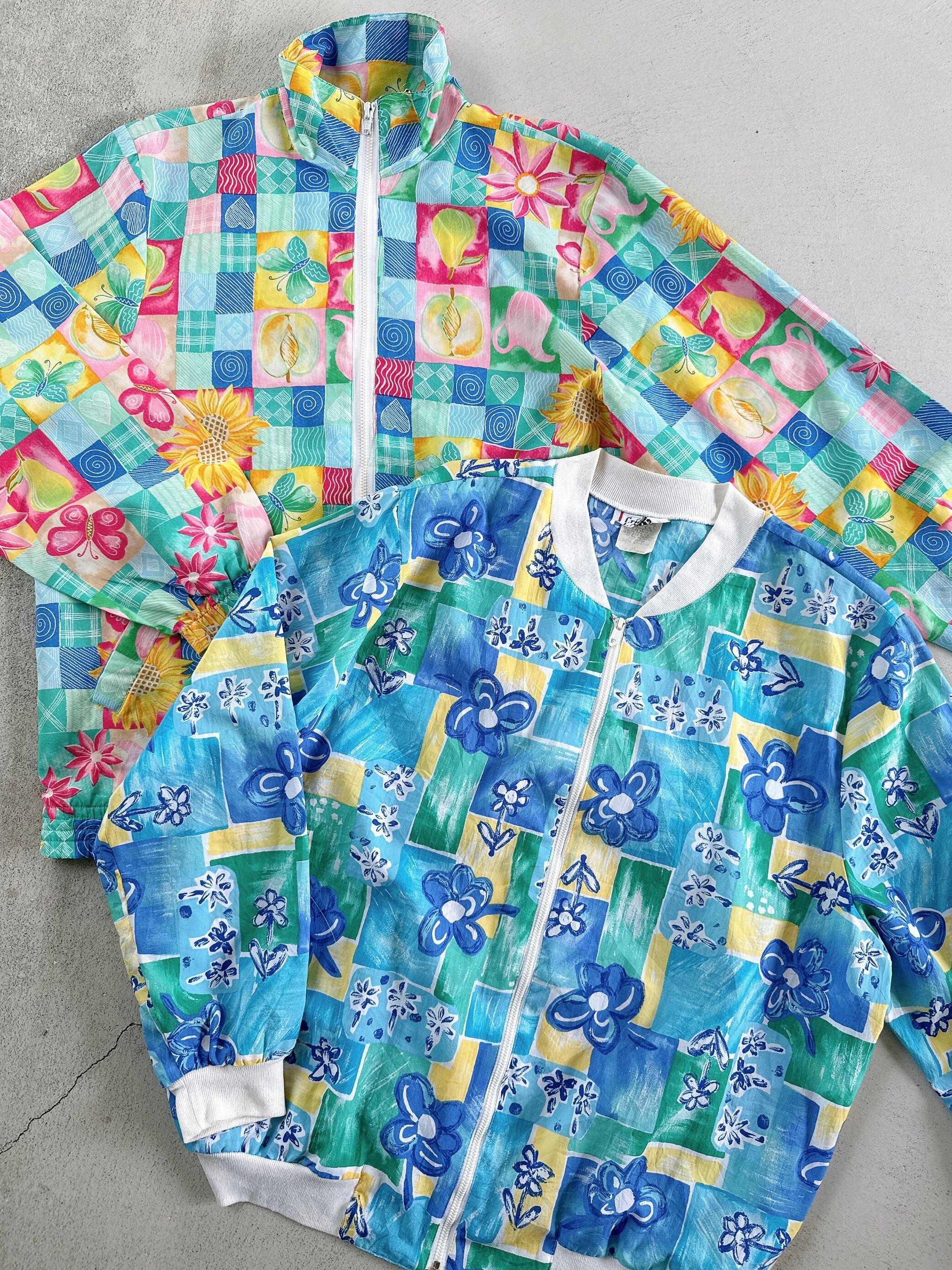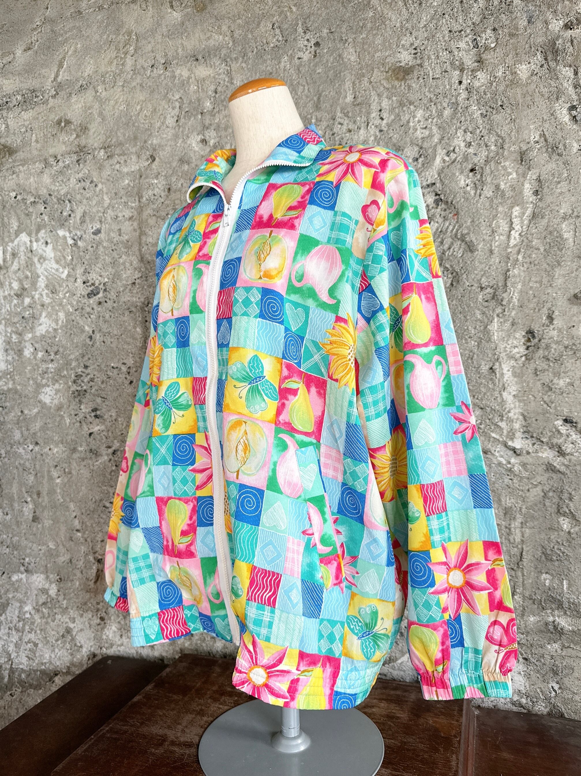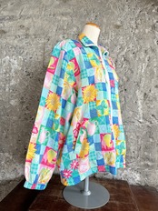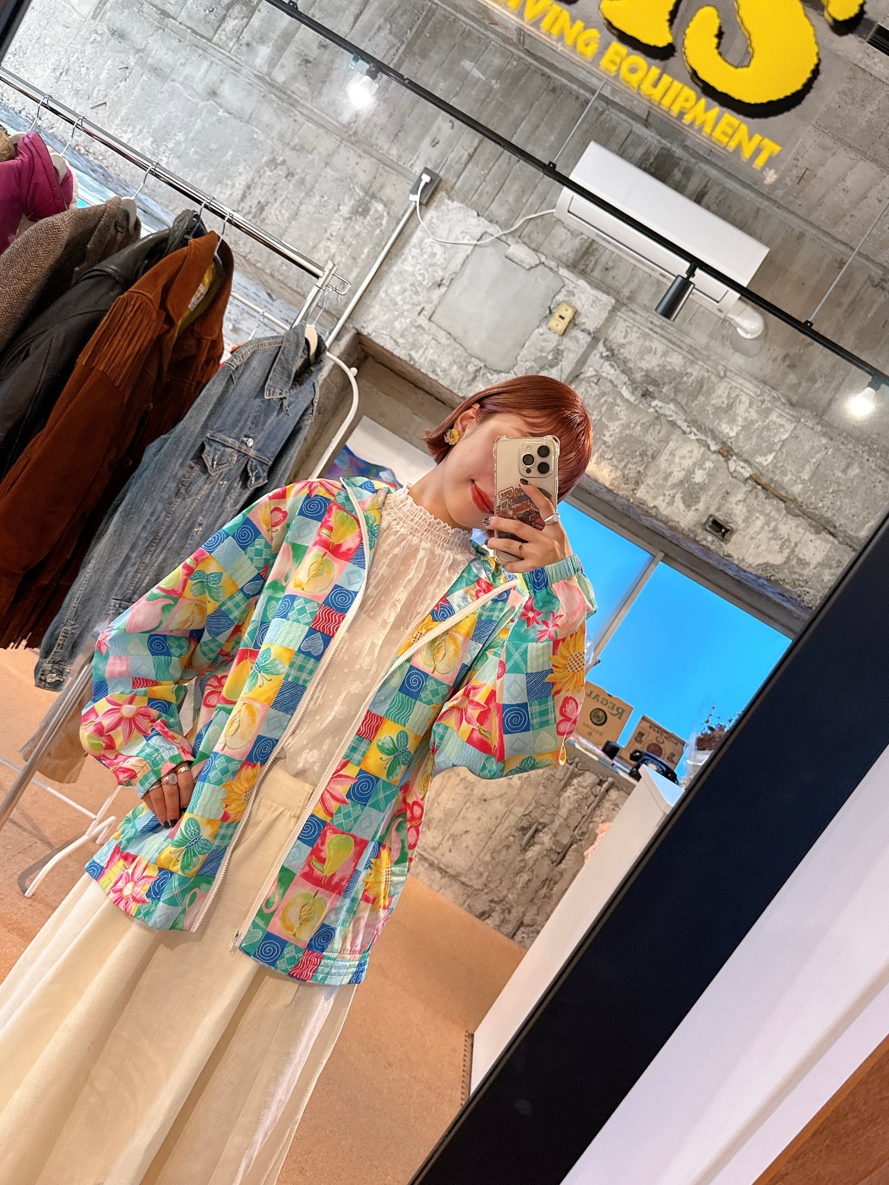 パッチワークみたいに色とりどりのプリントがぎゅっと詰まった、見ているだけで気分が上がるジップジャケット。