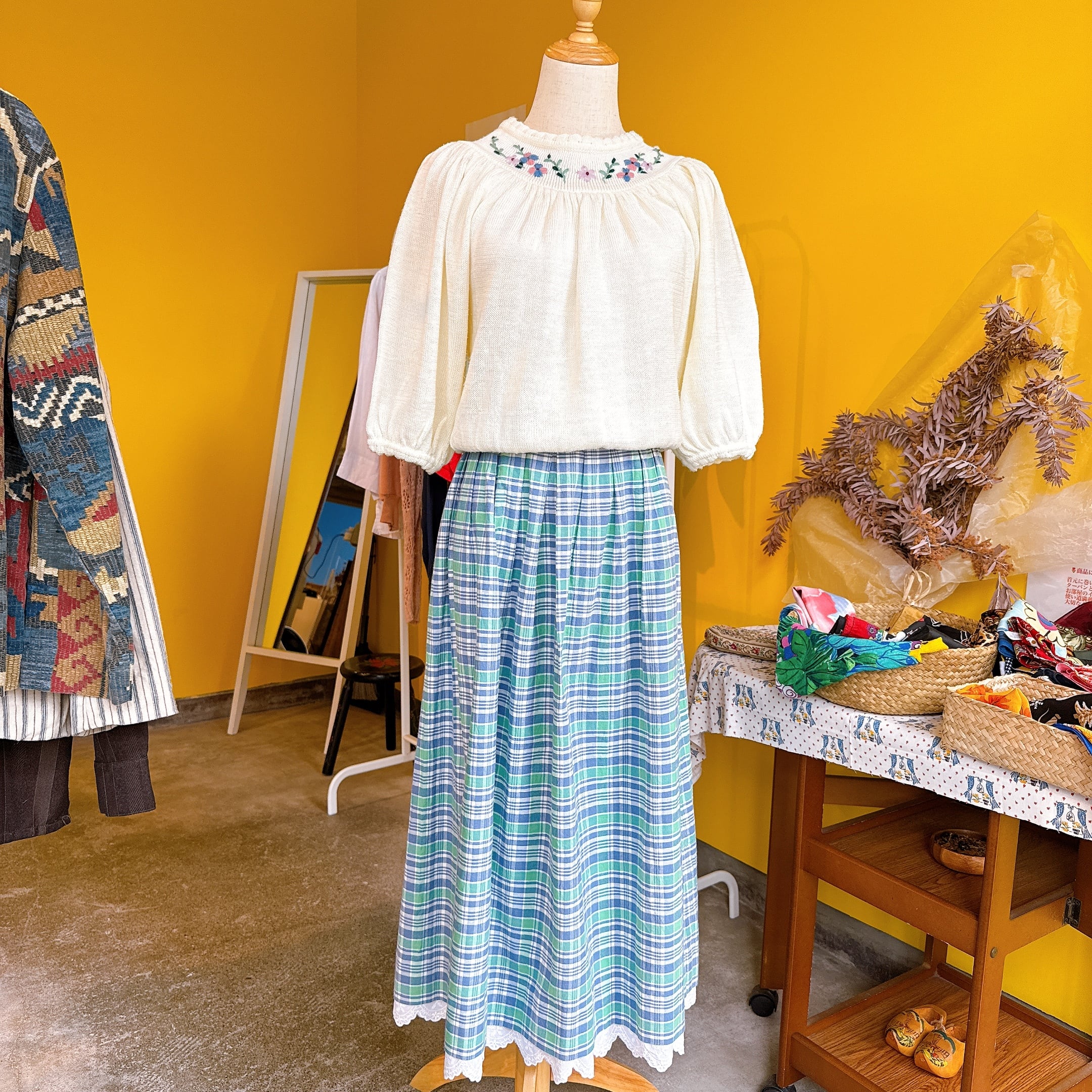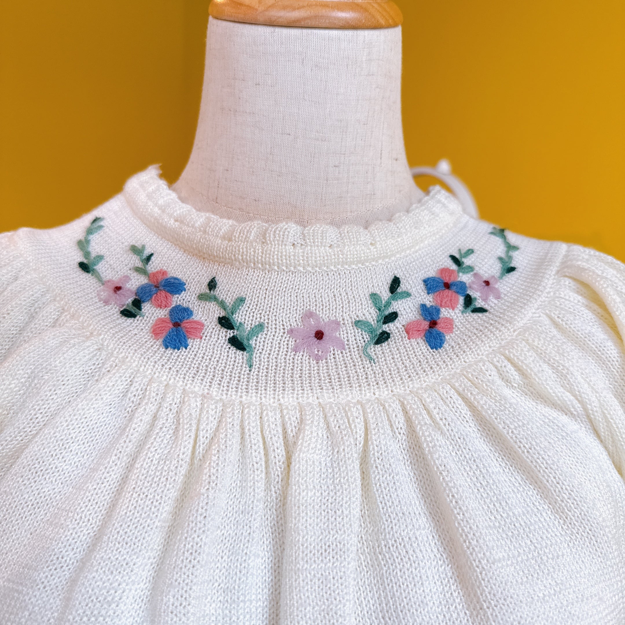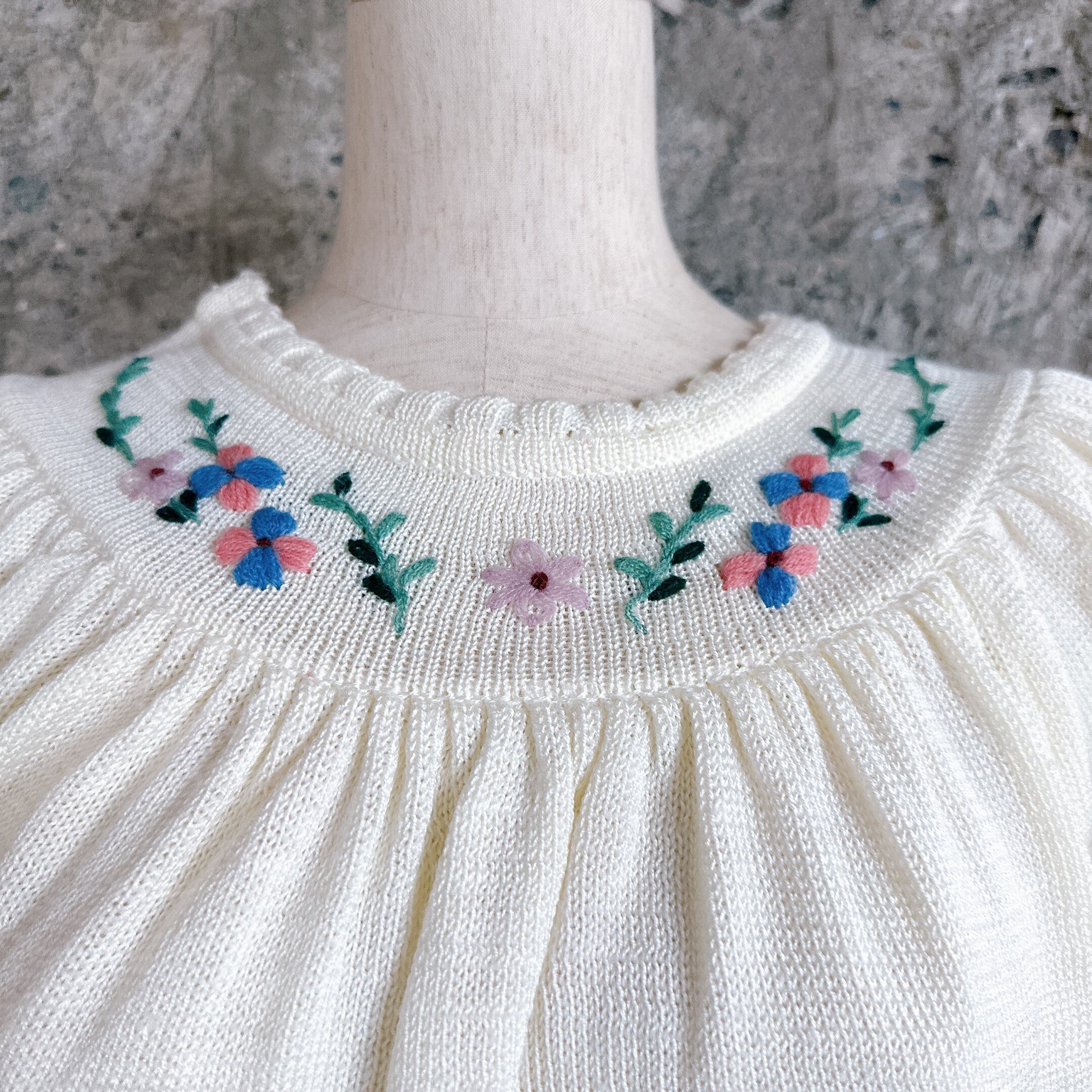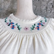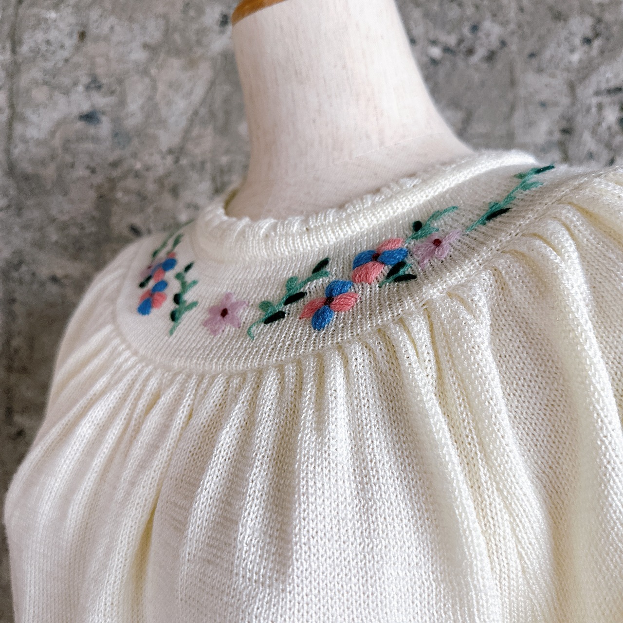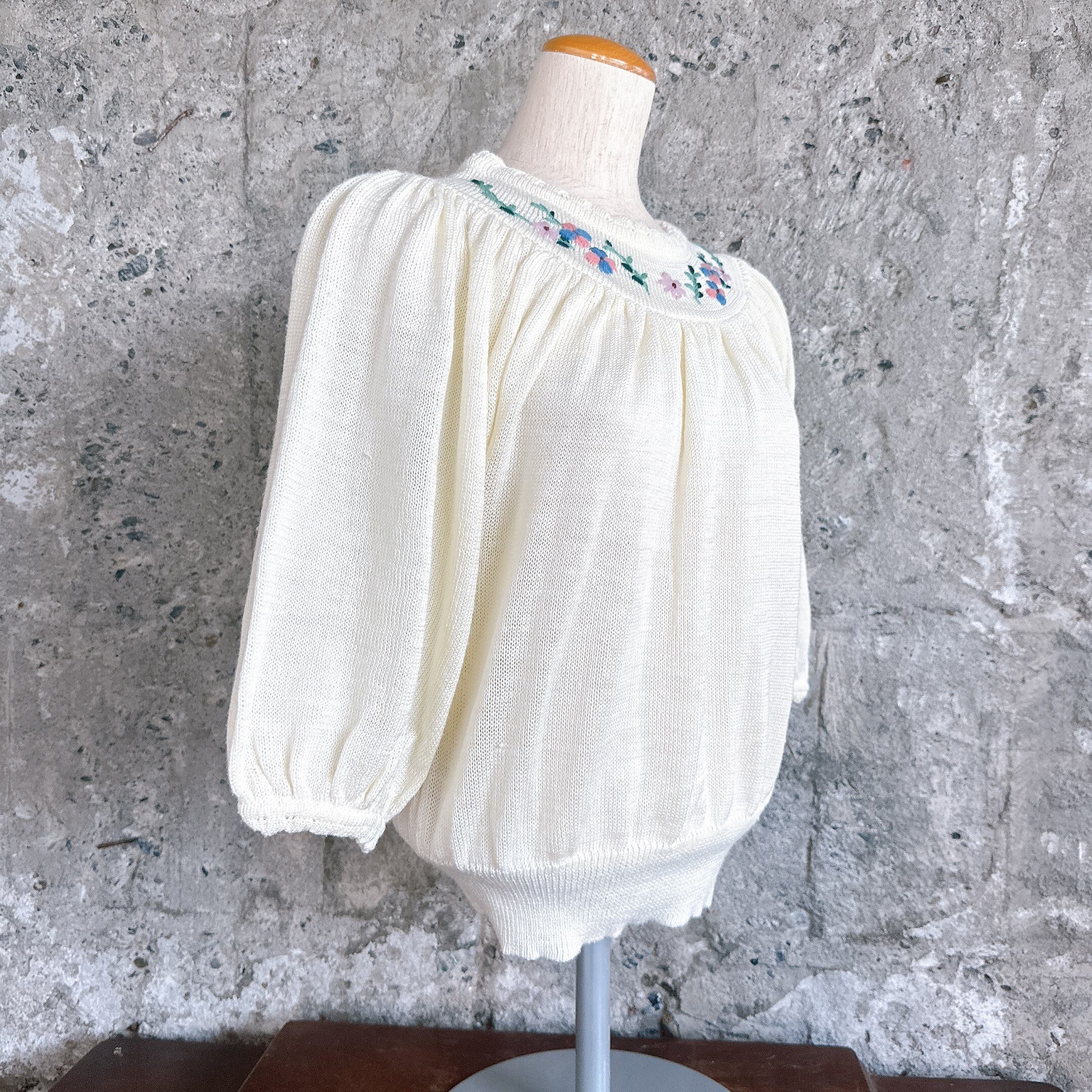 首元にカラフルな花刺繍があしらわれた、ヴィンテージのアクリルニットトップス。