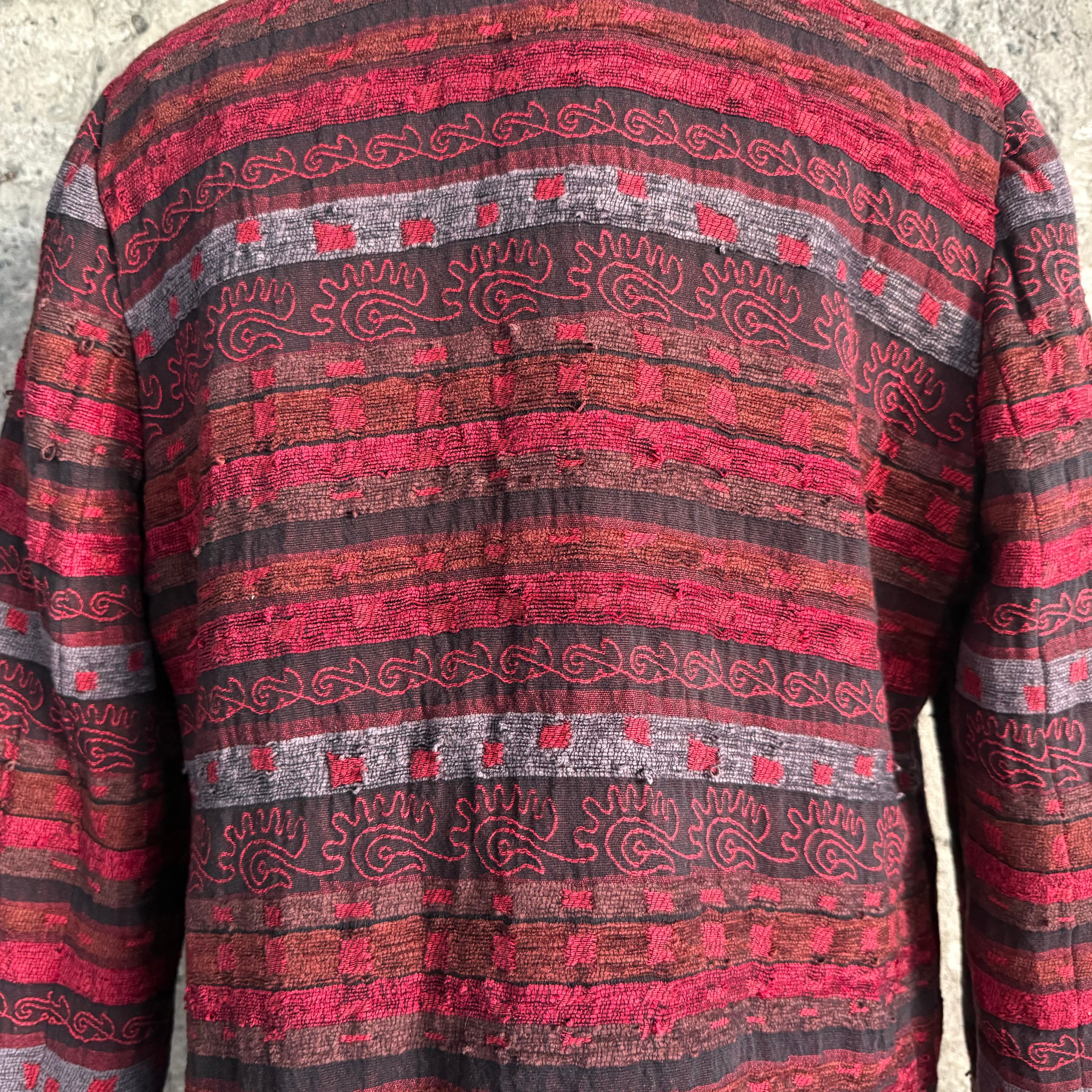 レッド×グレー×ブラックの深みある配色と、織り模様の立体感が目を引く一着。