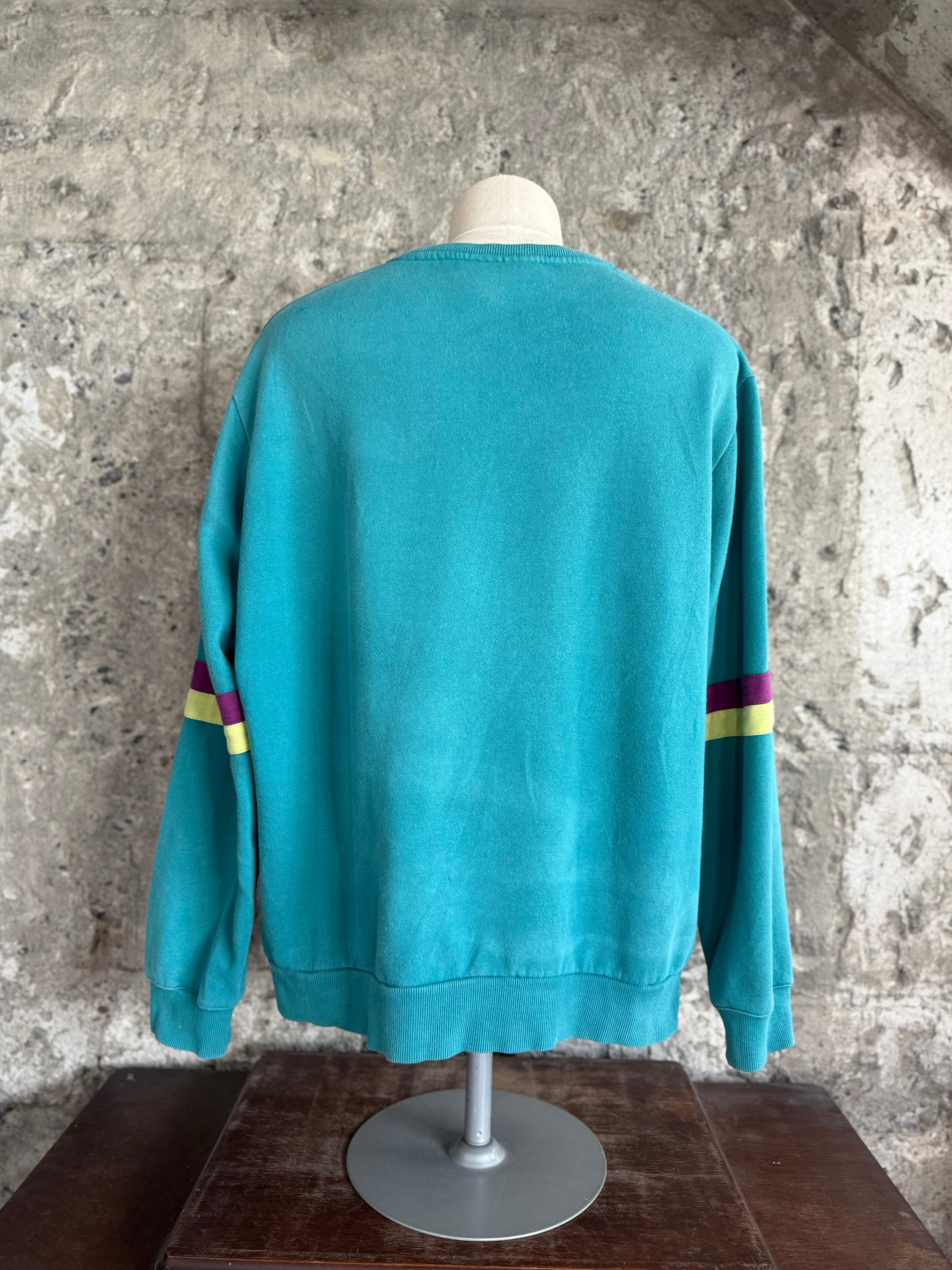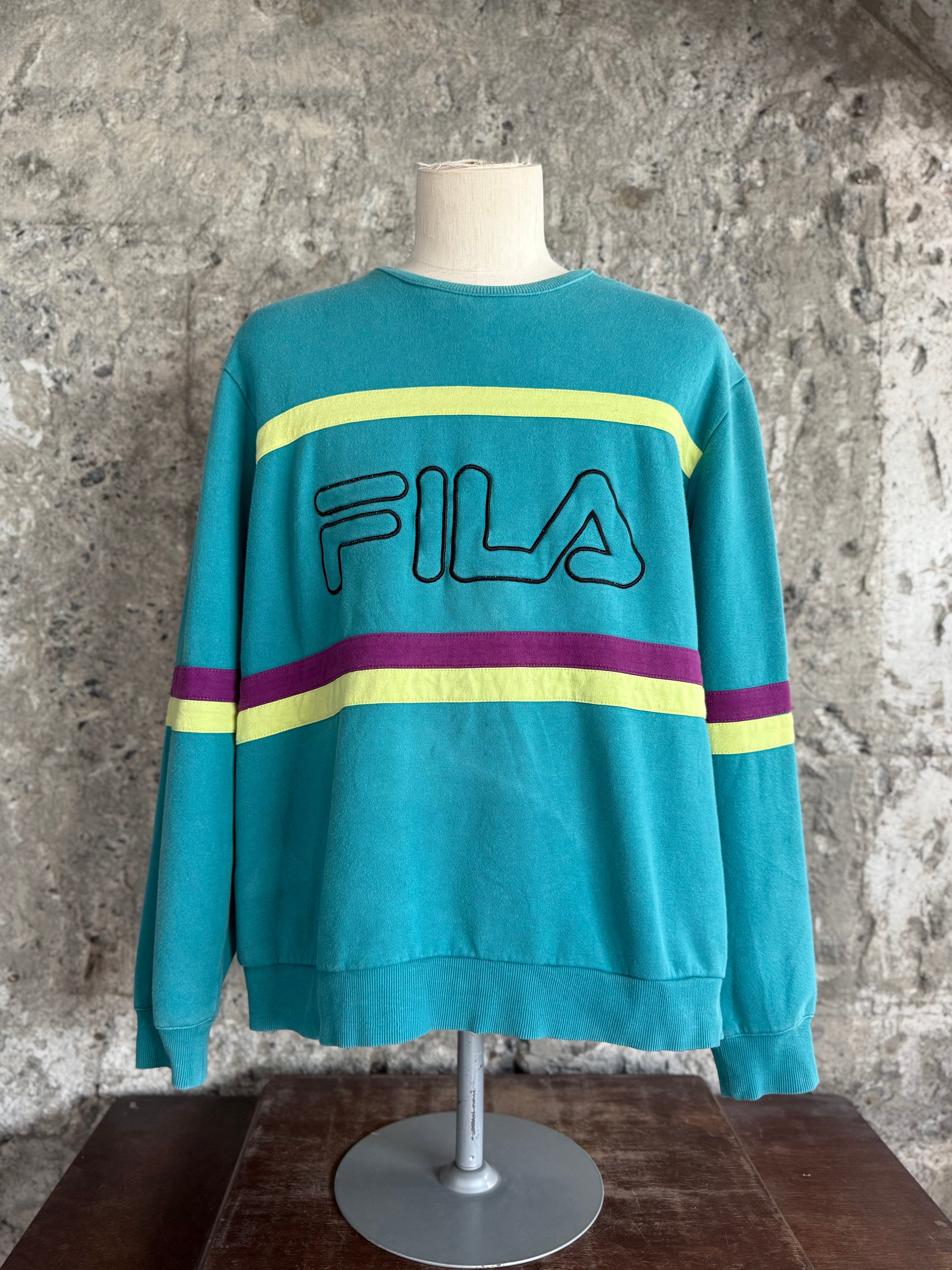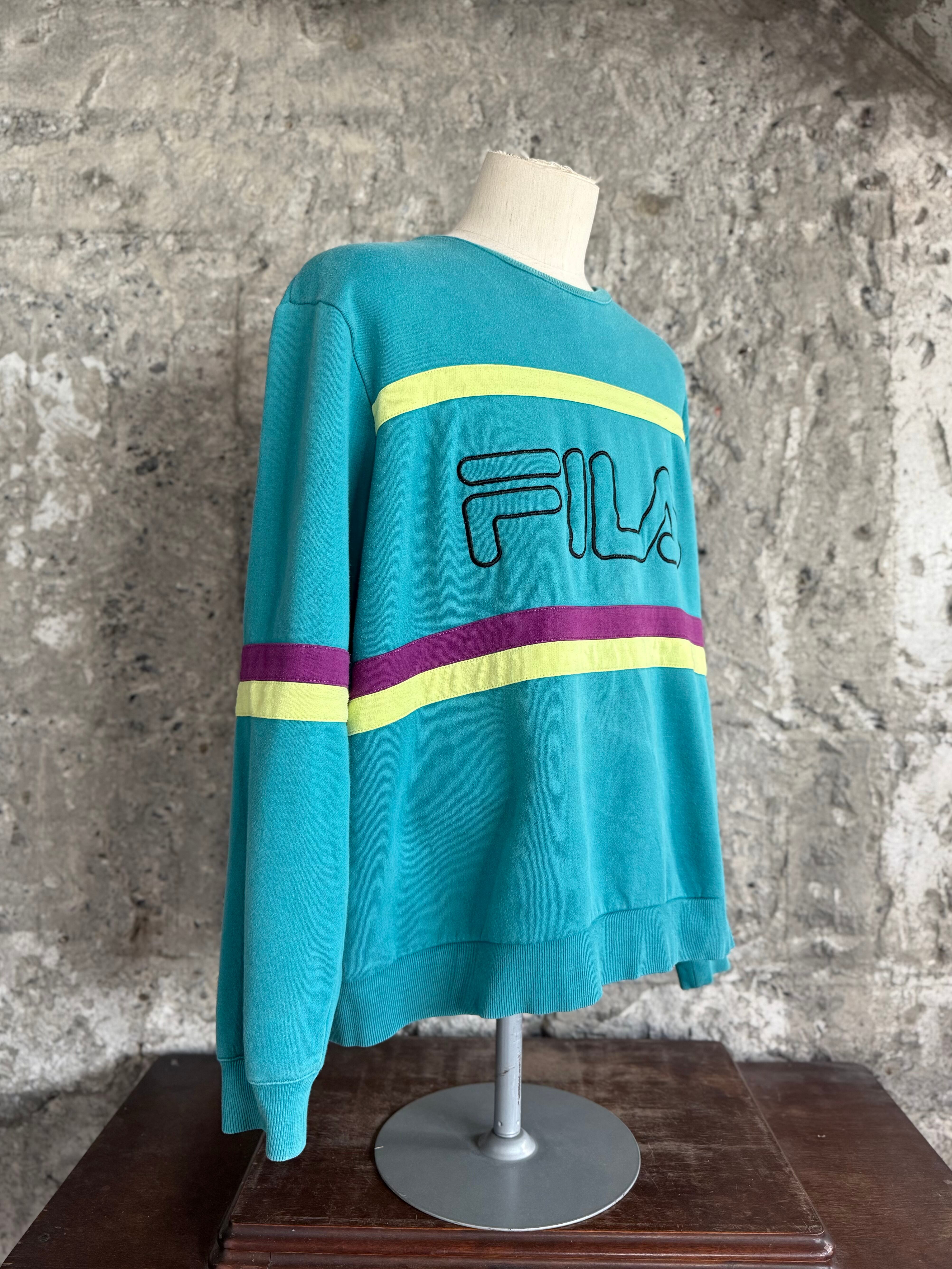 鮮やかなティールブルーに、イエローとパープルの切り替えラインが映えるFILAロゴスウェット。