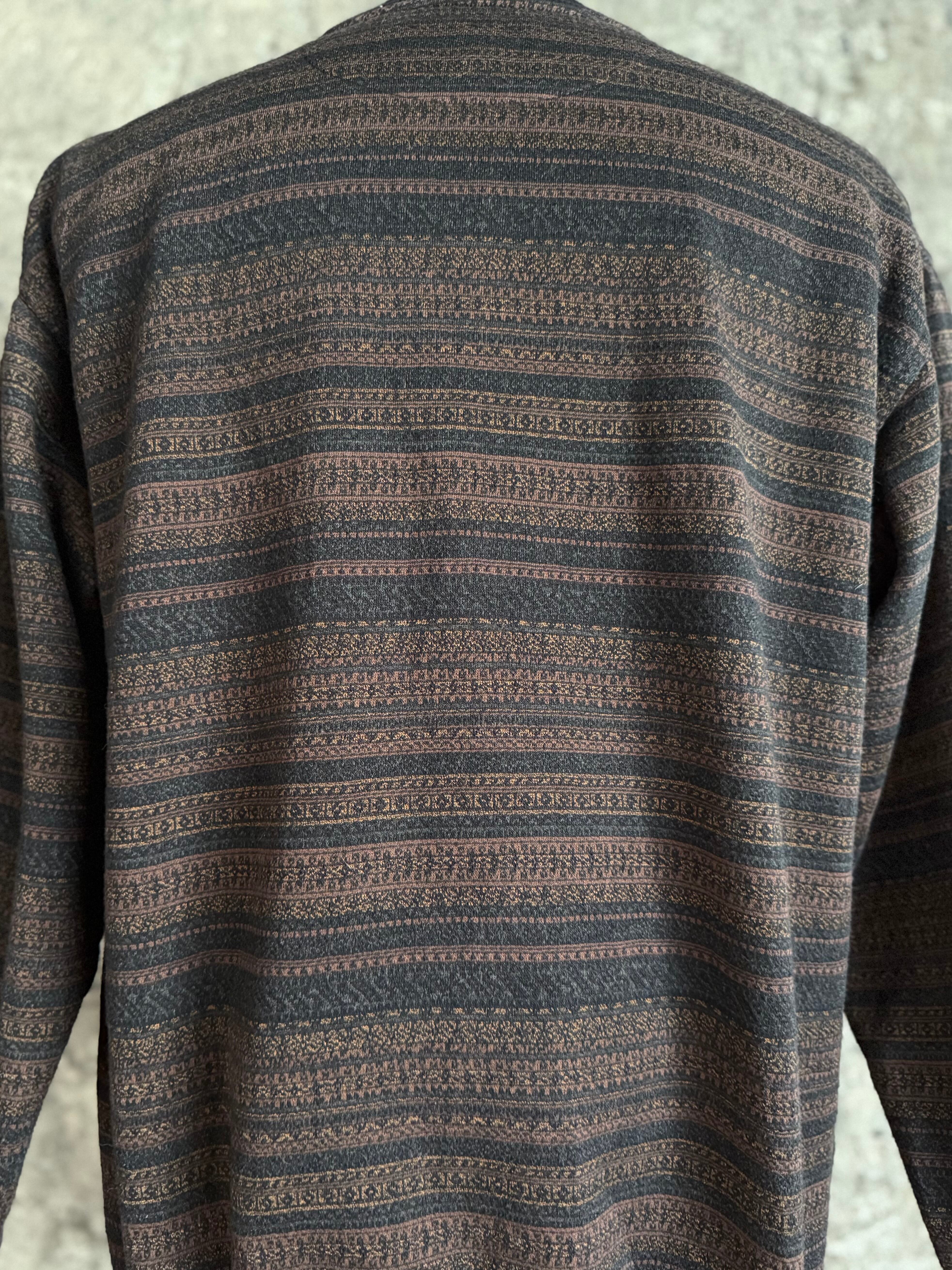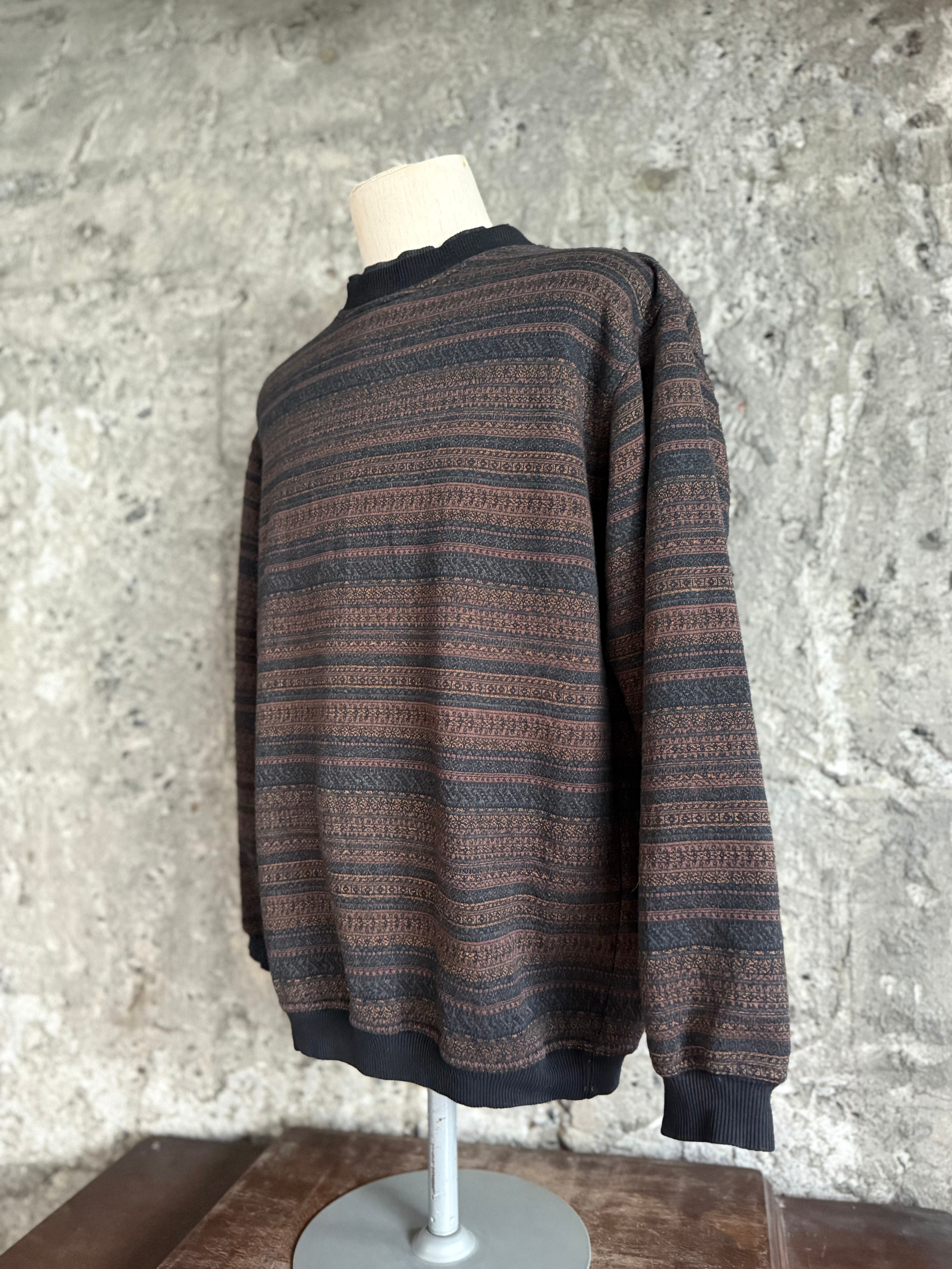 落ち着いたブラウン×ブラックのノルディック調ボーダー柄が魅力のスウェットトップス。