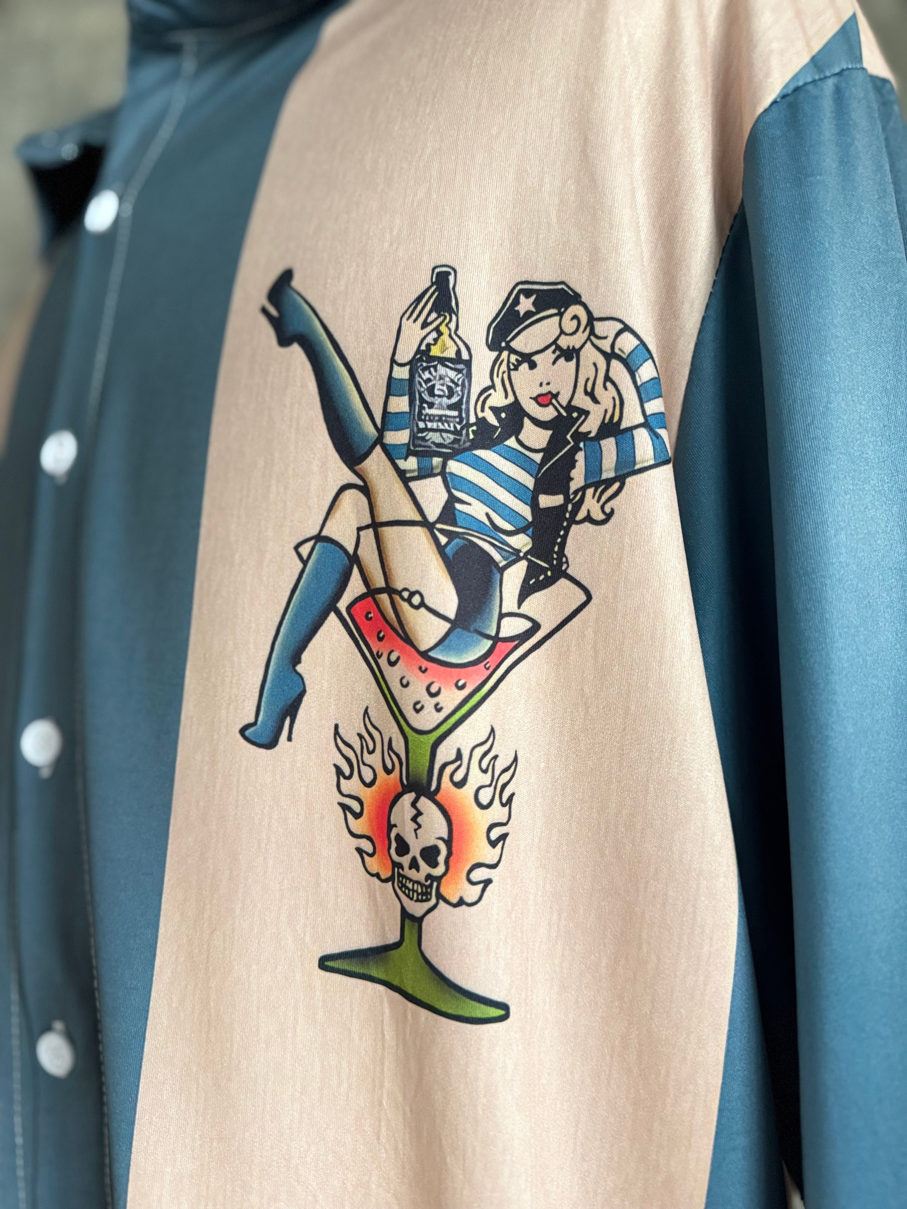 胸元にはピンナップガールのような遊び心あるプリントがワンポイント。