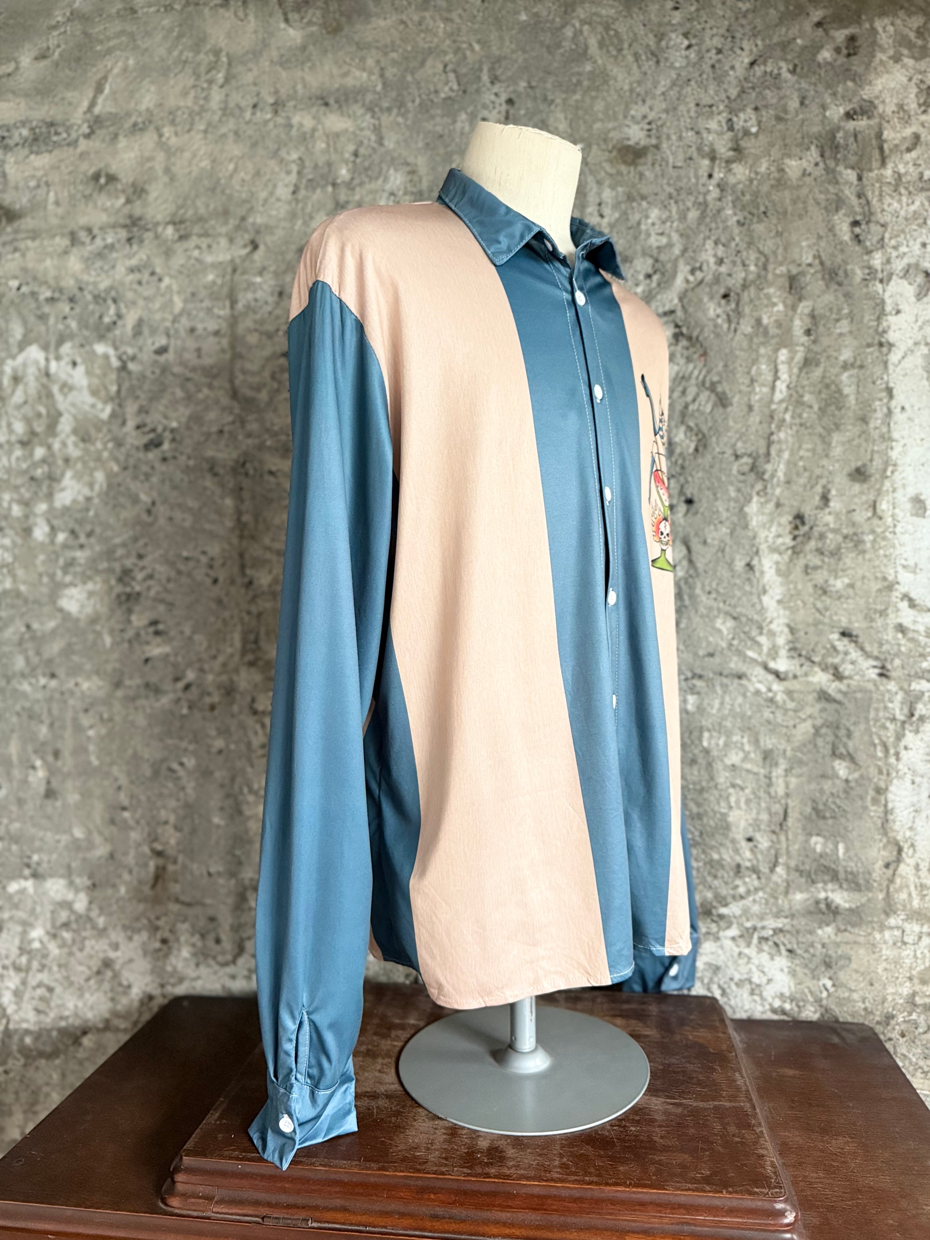 ベージュ×スモーキーブルーの配色が洒落感たっぷりなバイカラーストライプシャツ。