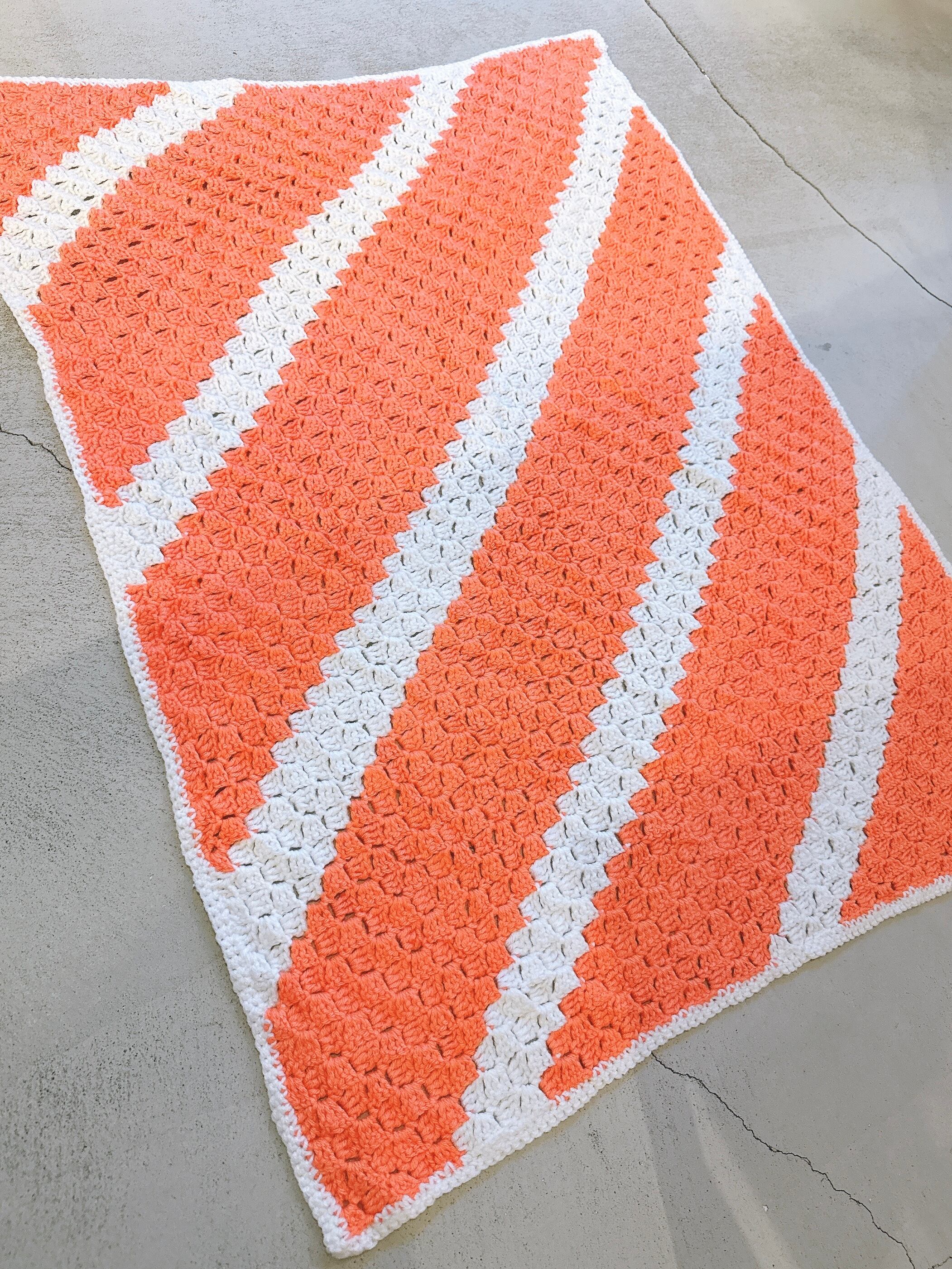 柔らかなオレンジとホワイトの糸で丁寧に編み上げられた、ハンドメイドのクロシェブランケット。