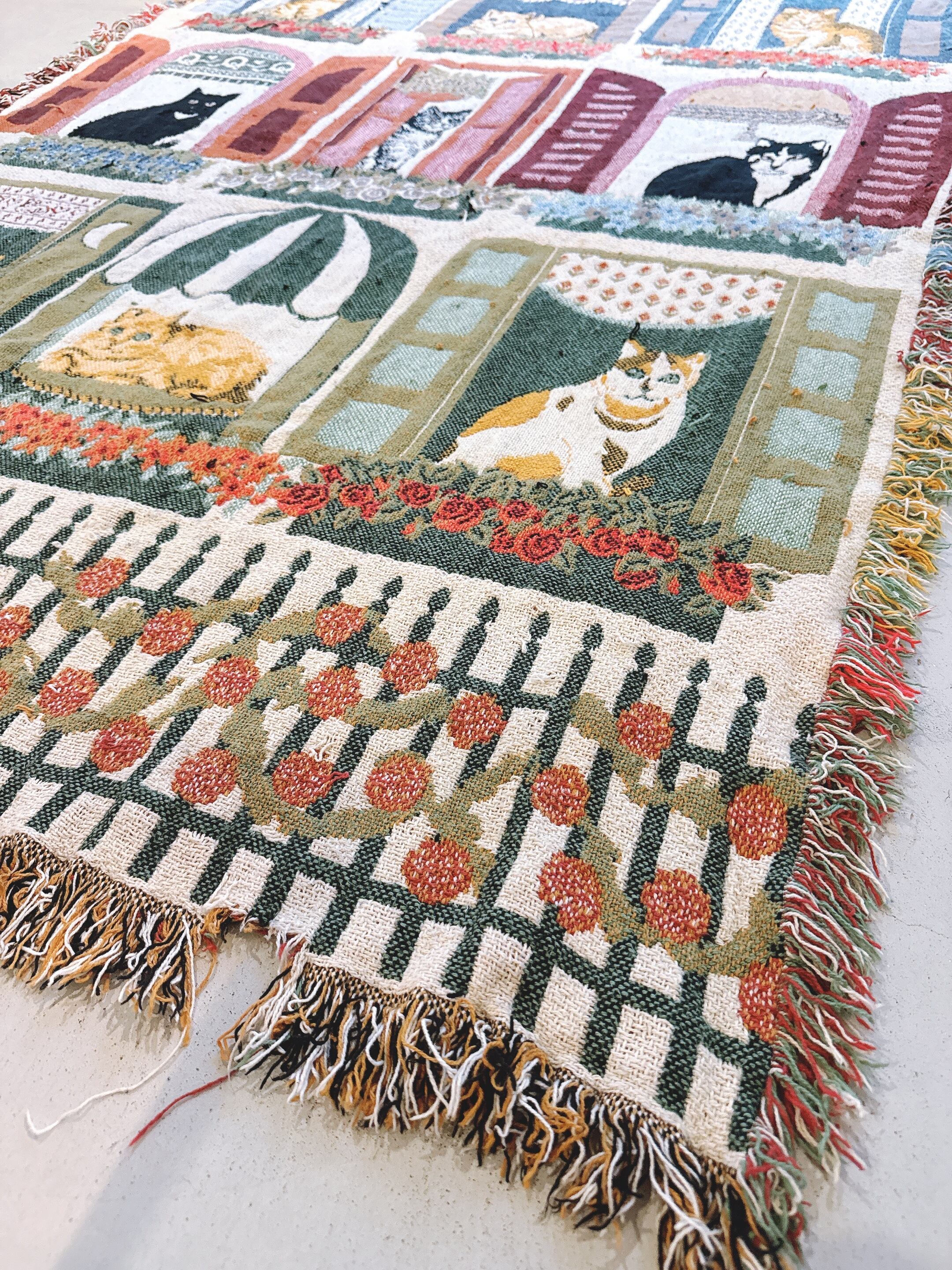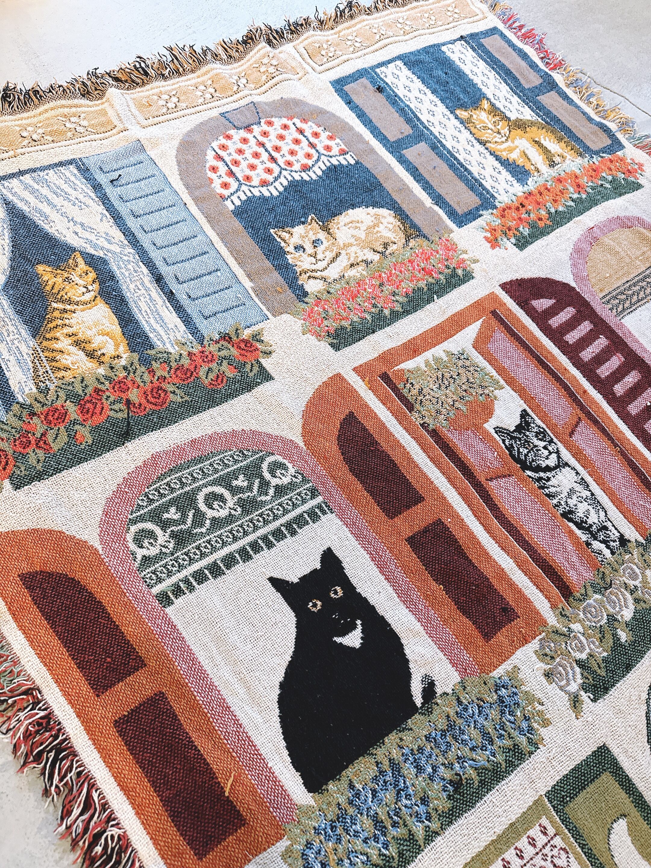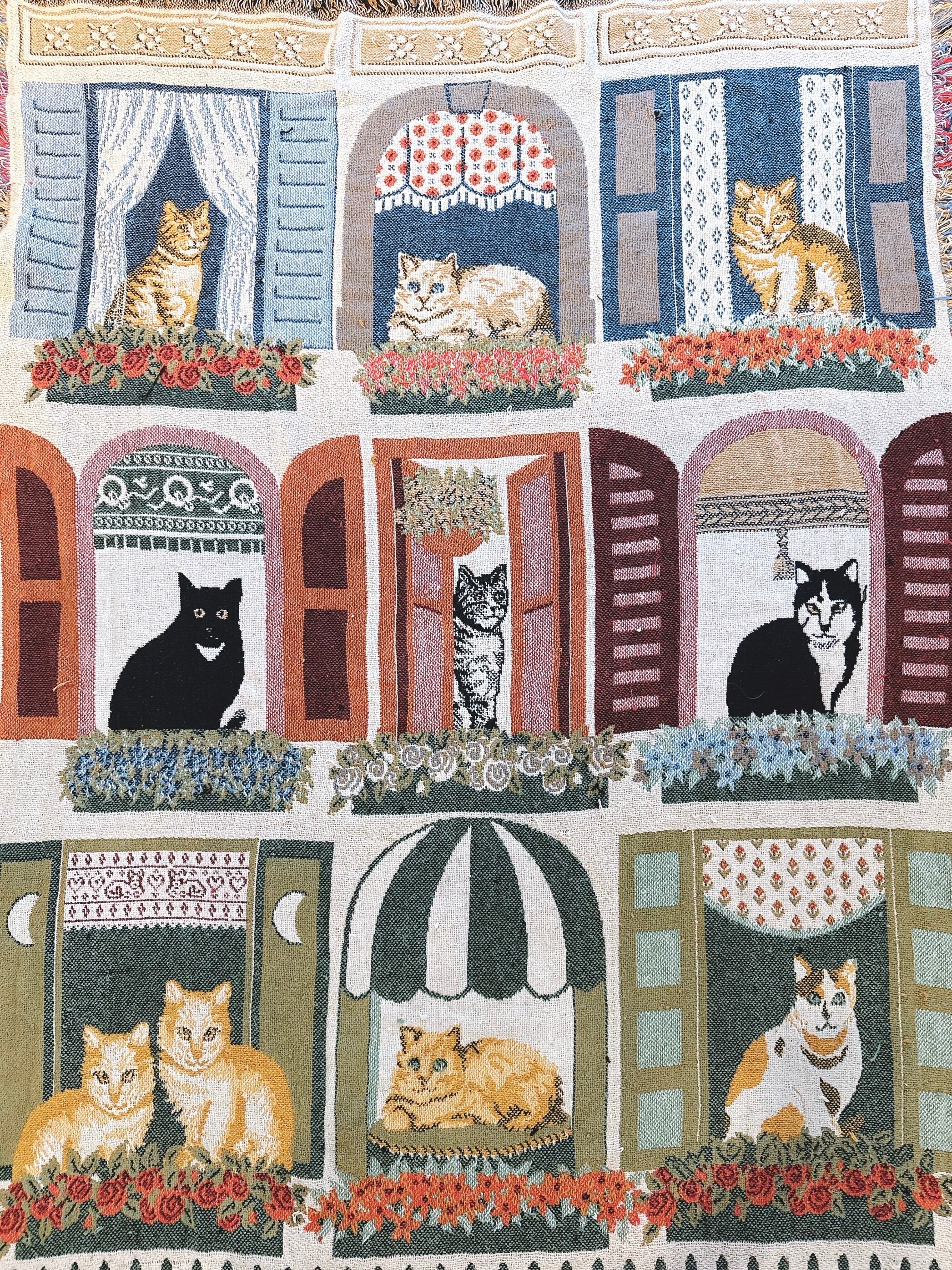窓辺に佇む猫たちが描かれた、愛らしいタペストリーラグ。