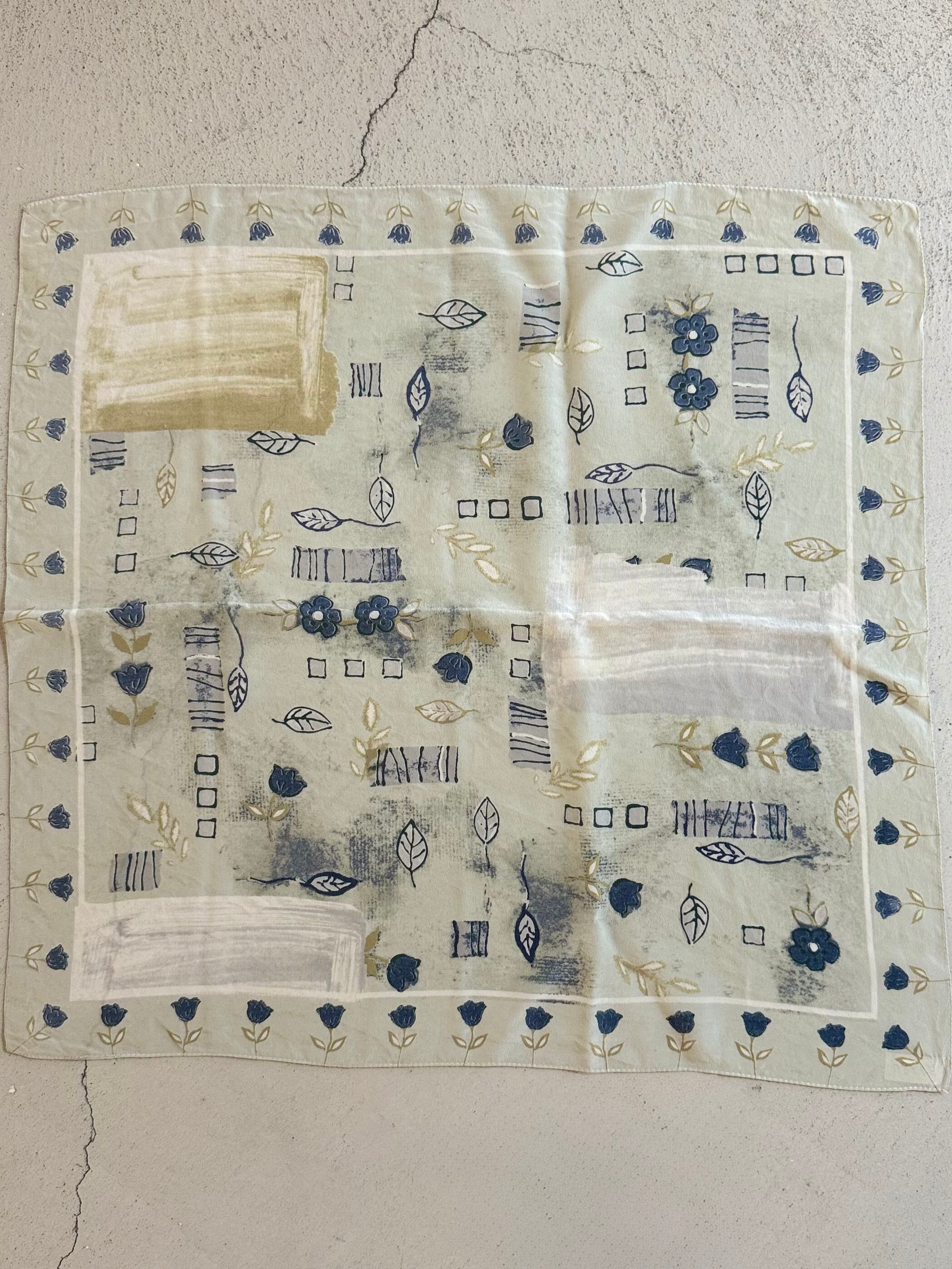 淡いベージュをベースに、ネイビーの花や葉っぱのモチーフが描かれたアート調のスカーフ。