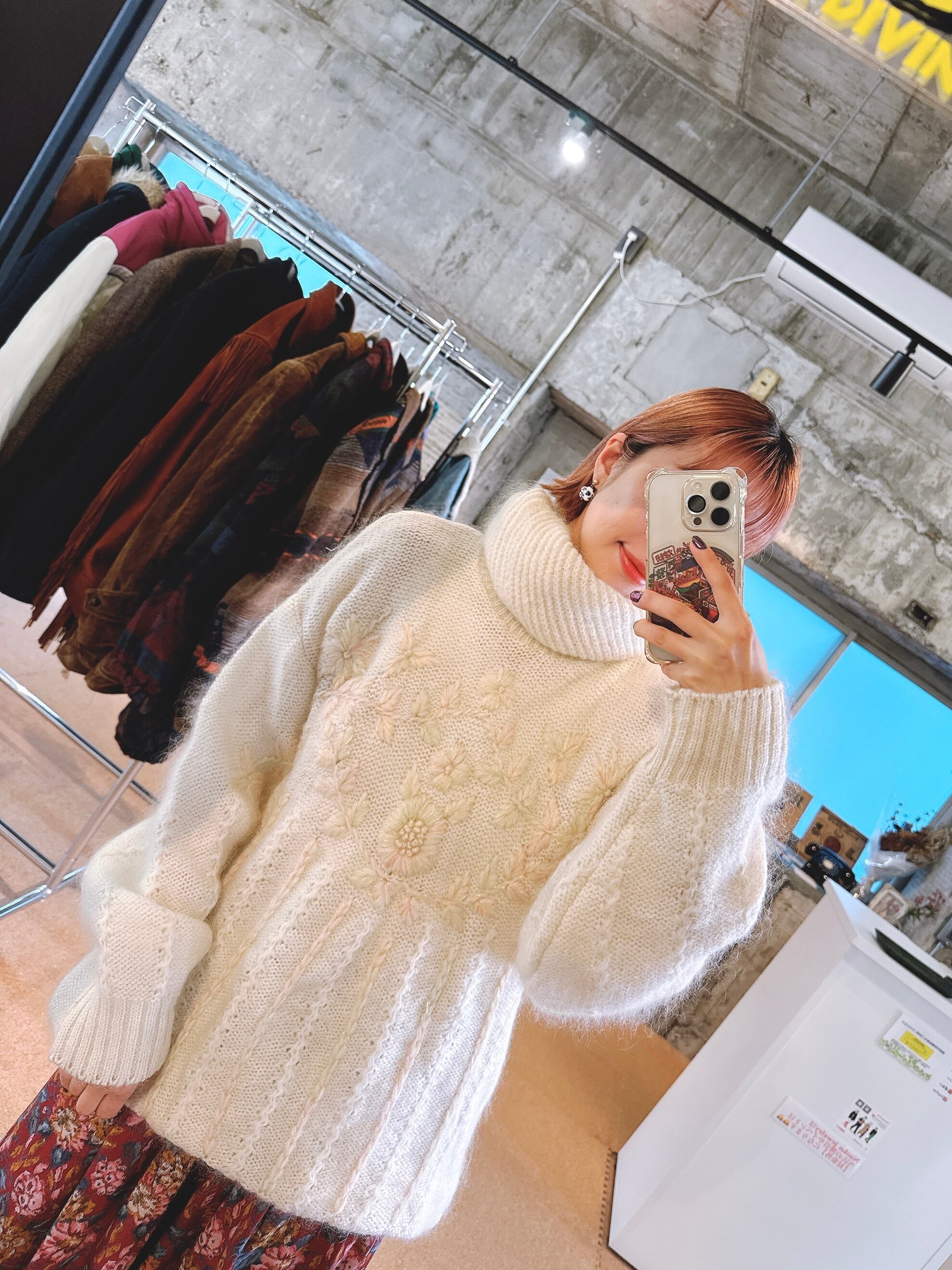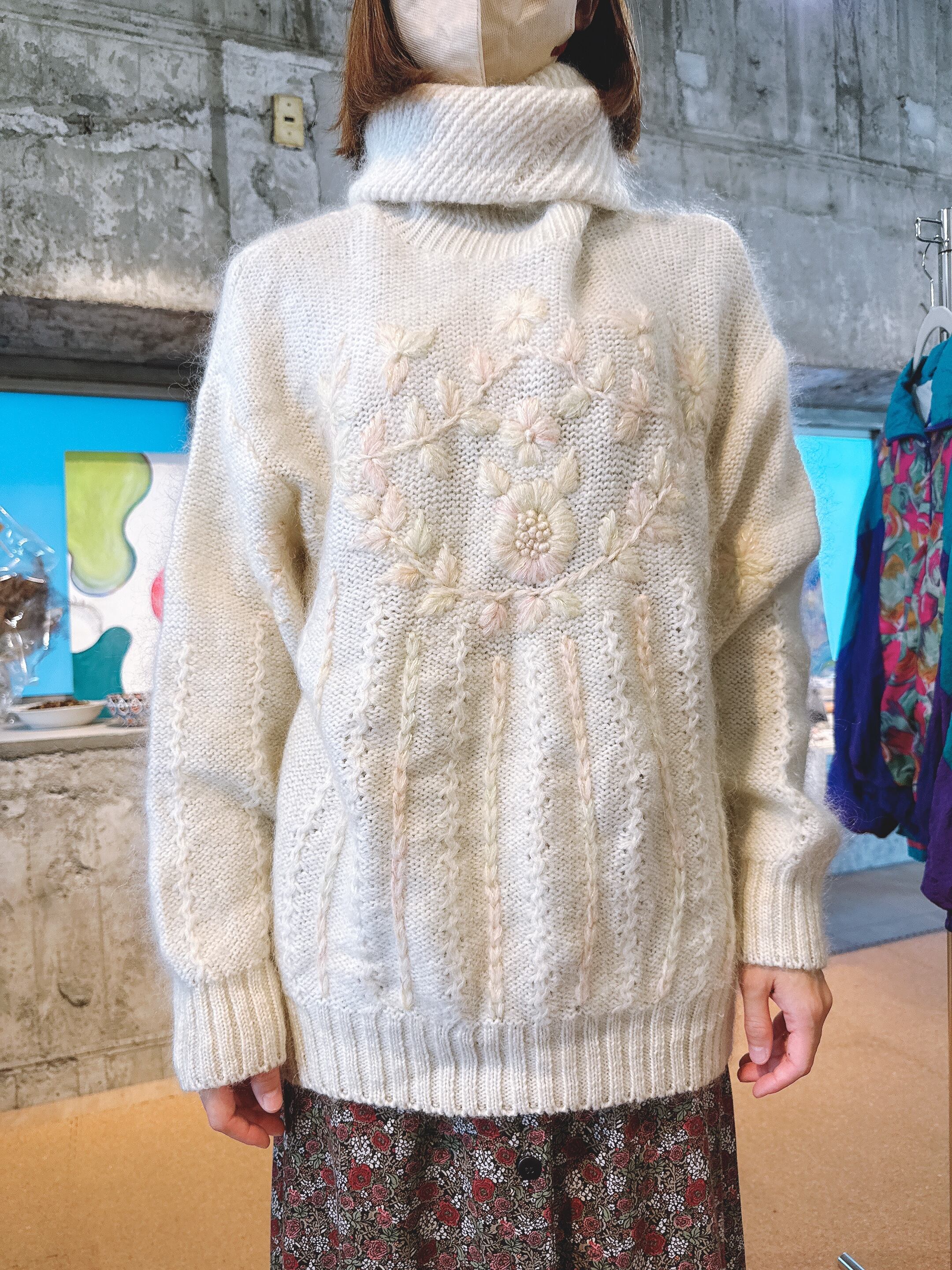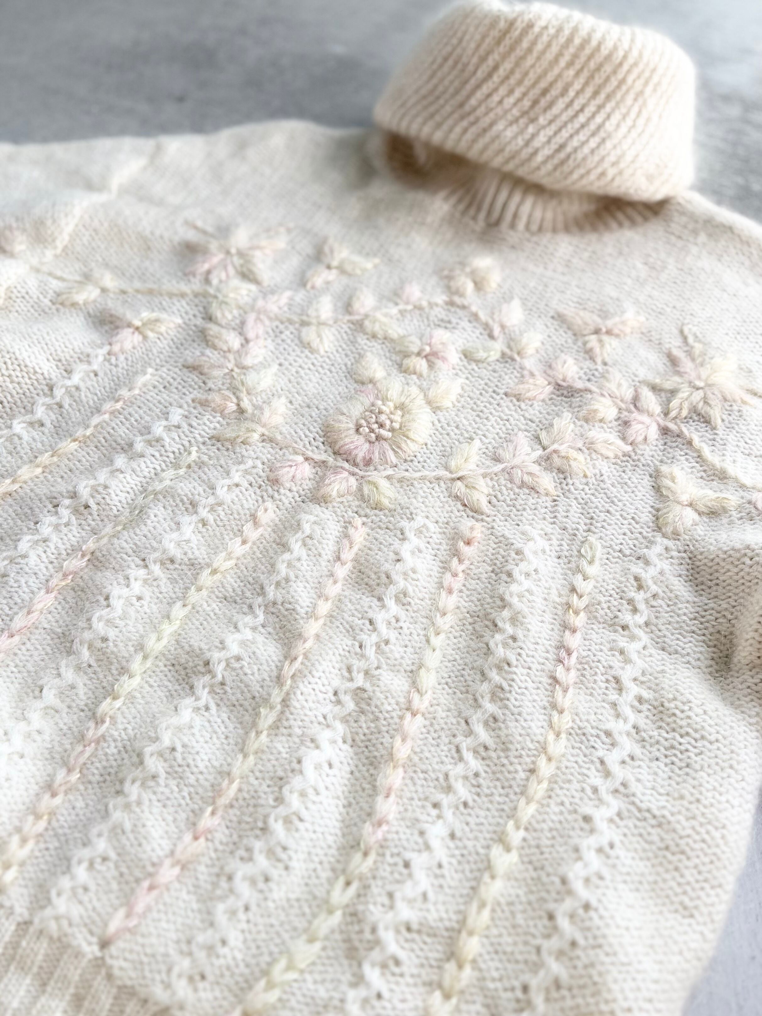 ふんわりとした質感に、やさしい色合いの花刺繍が施されたモヘアタートルニット