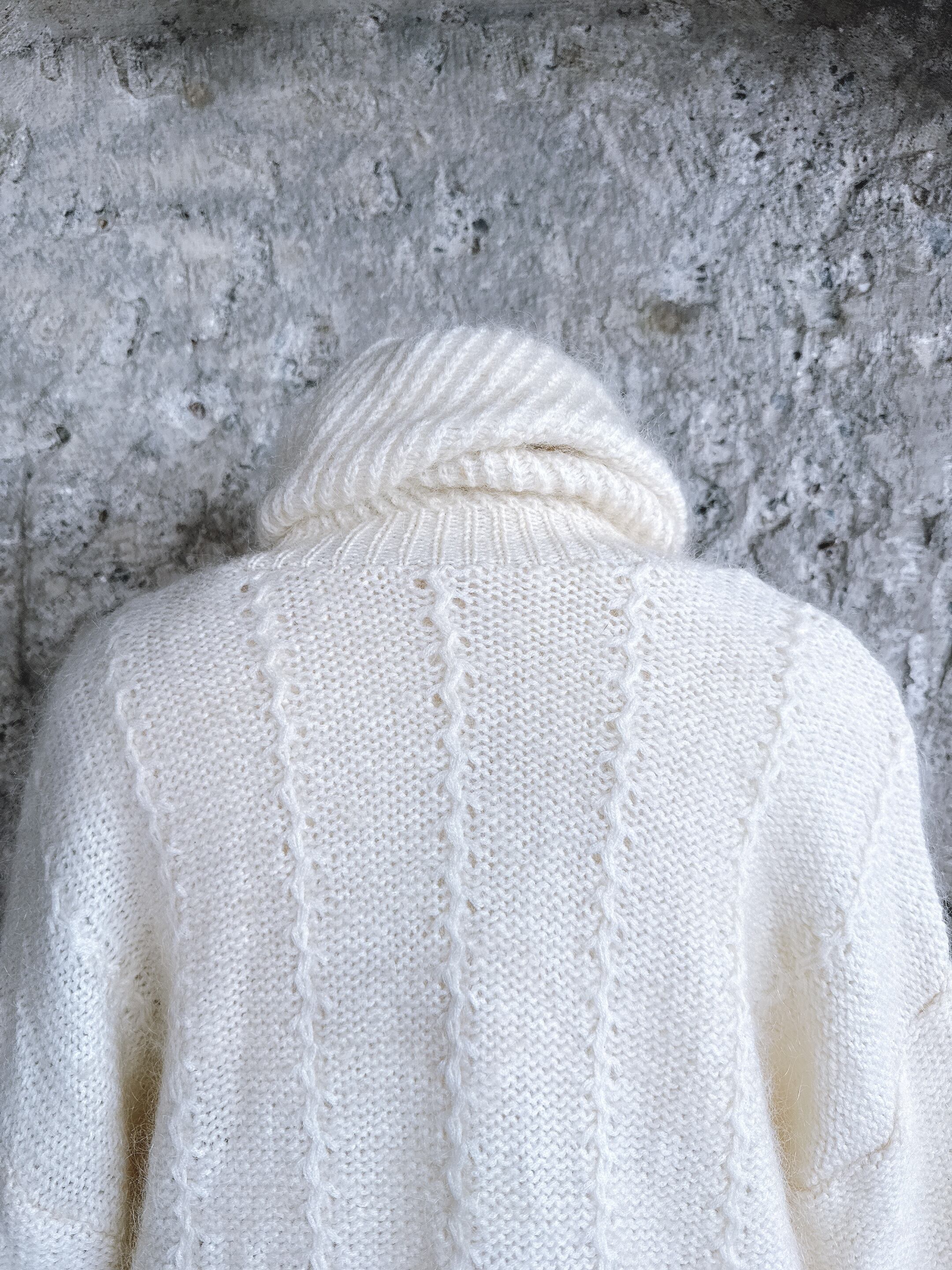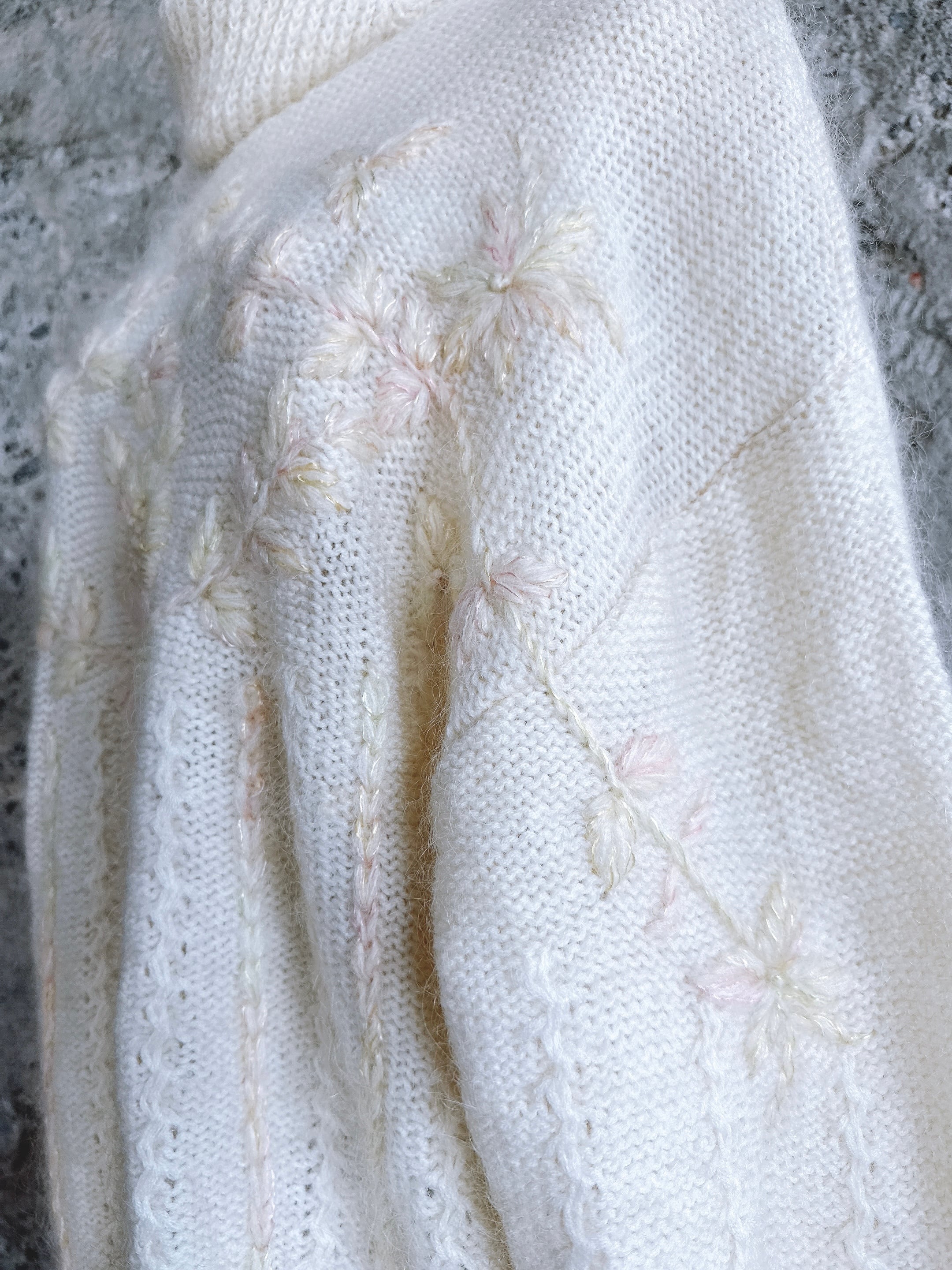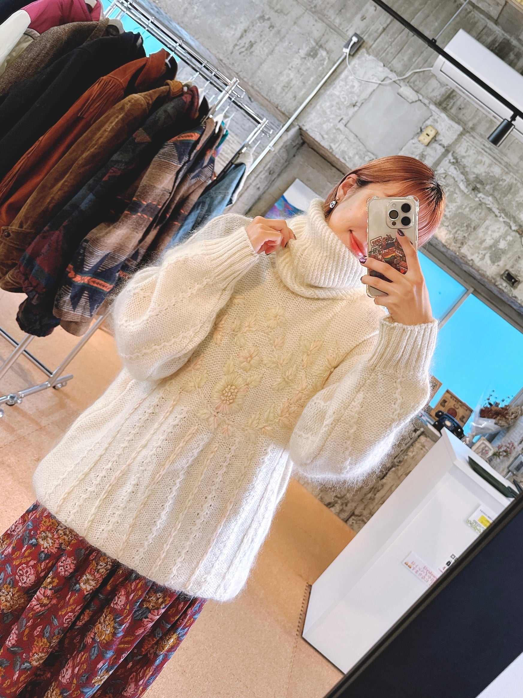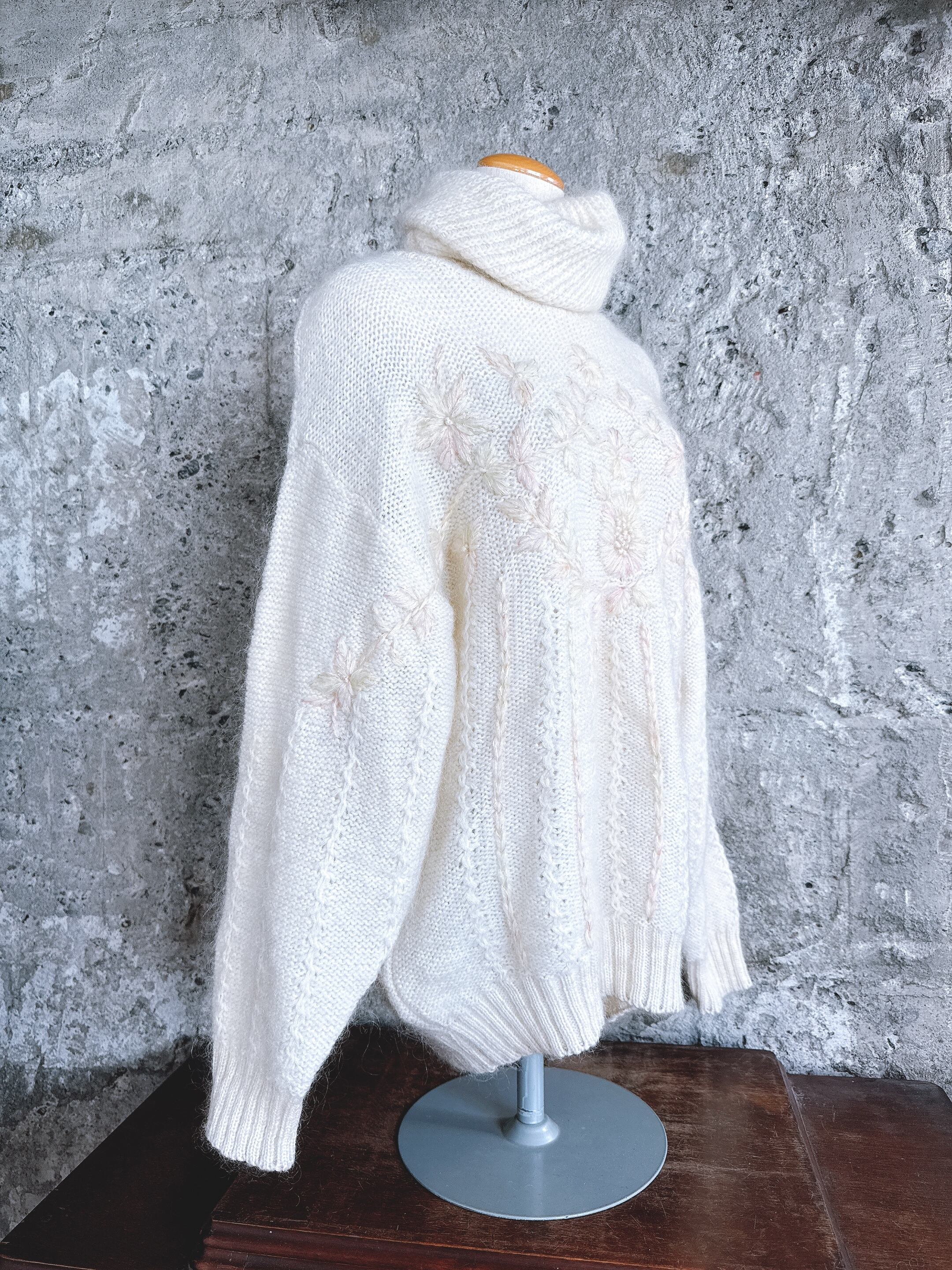 ふんわりとした質感に、やさしい色合いの花刺繍が施されたモヘアタートルニット