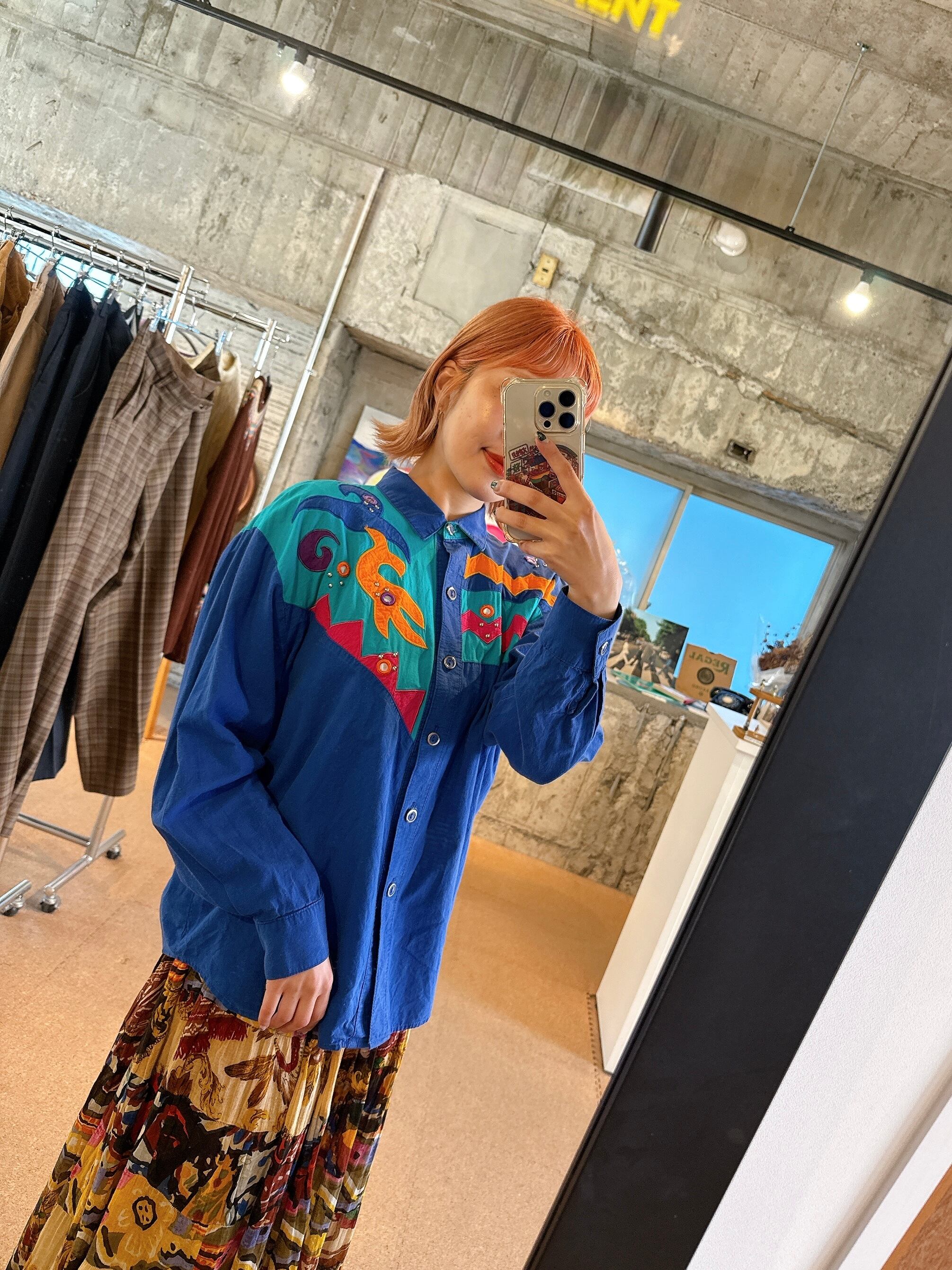 ブルー×ターコイズをベースに、ビビッドなアップリケ刺繍が施された