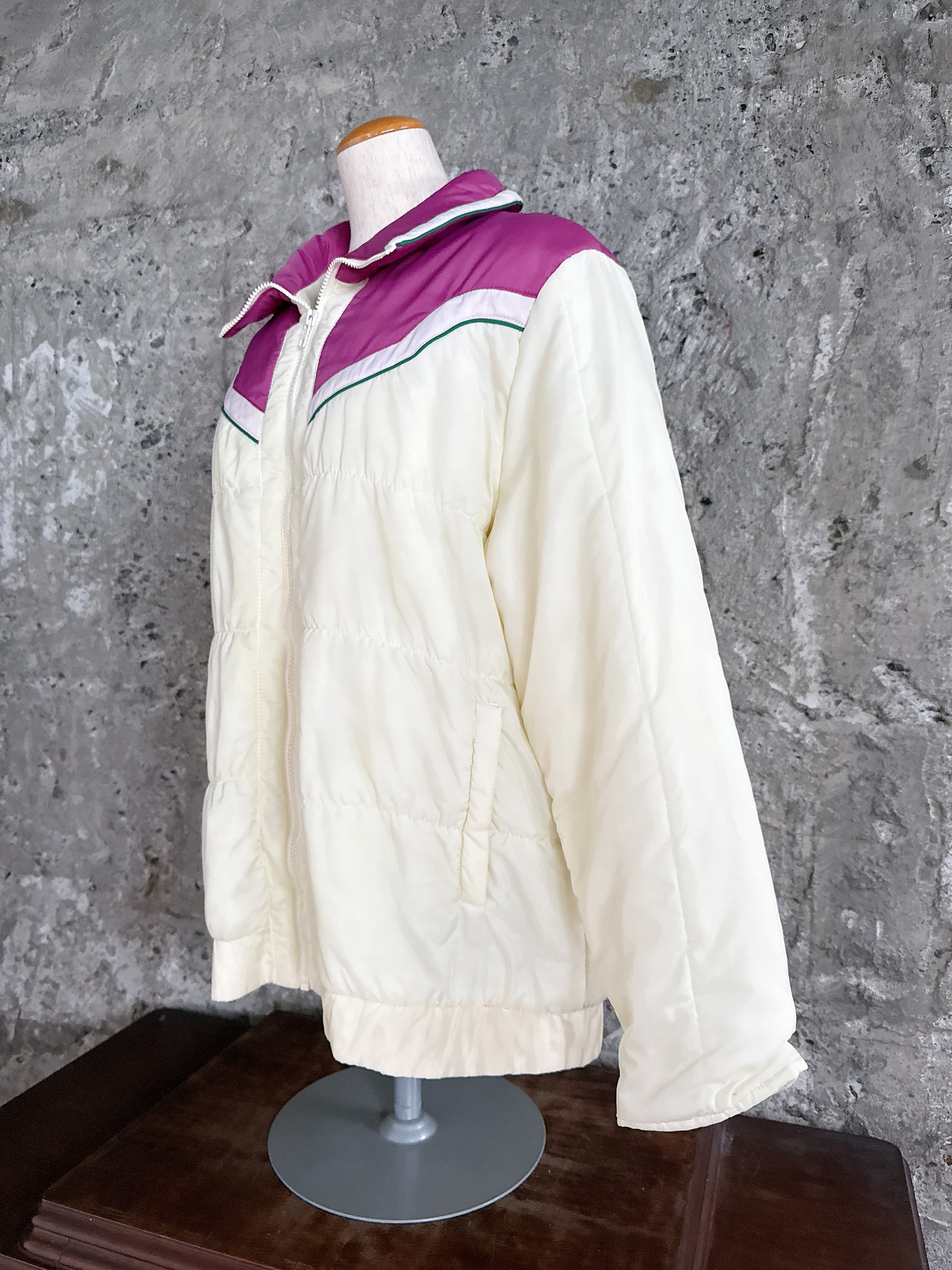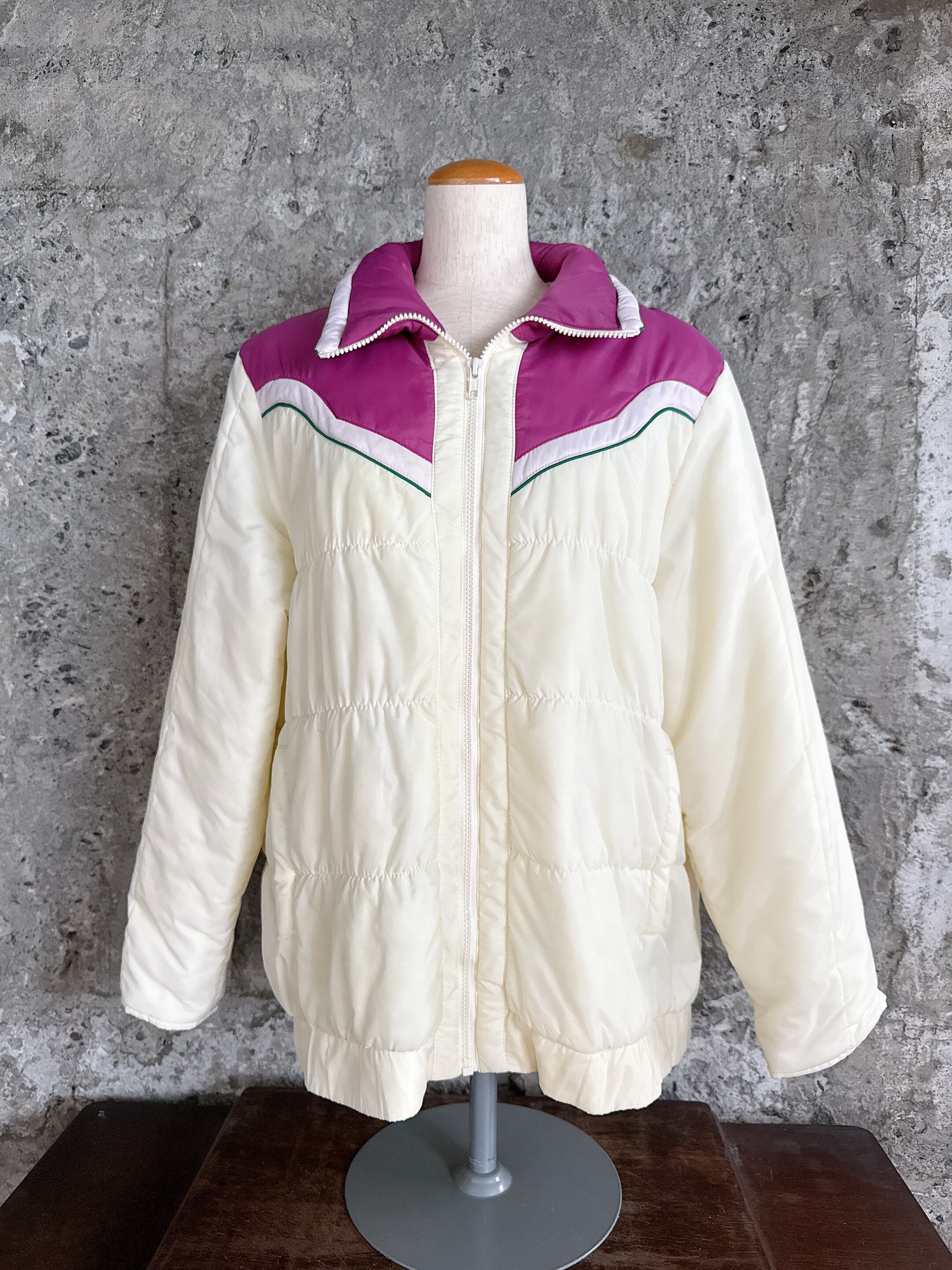 クリームをベースに、マゼンタ&グリーンラインの配色が目を惹く90’sらしい一着。