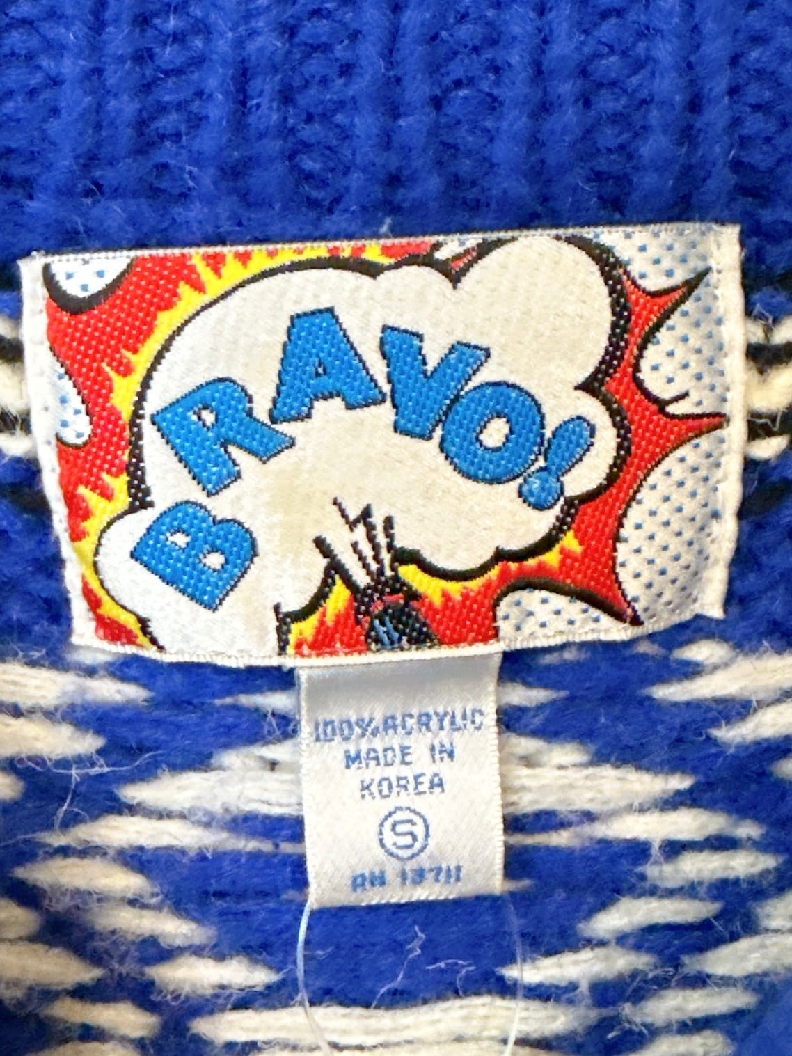 鮮やかなブルーをベースに、カラフルなジオメトリック柄を組み合わせた存在感抜群のニット。