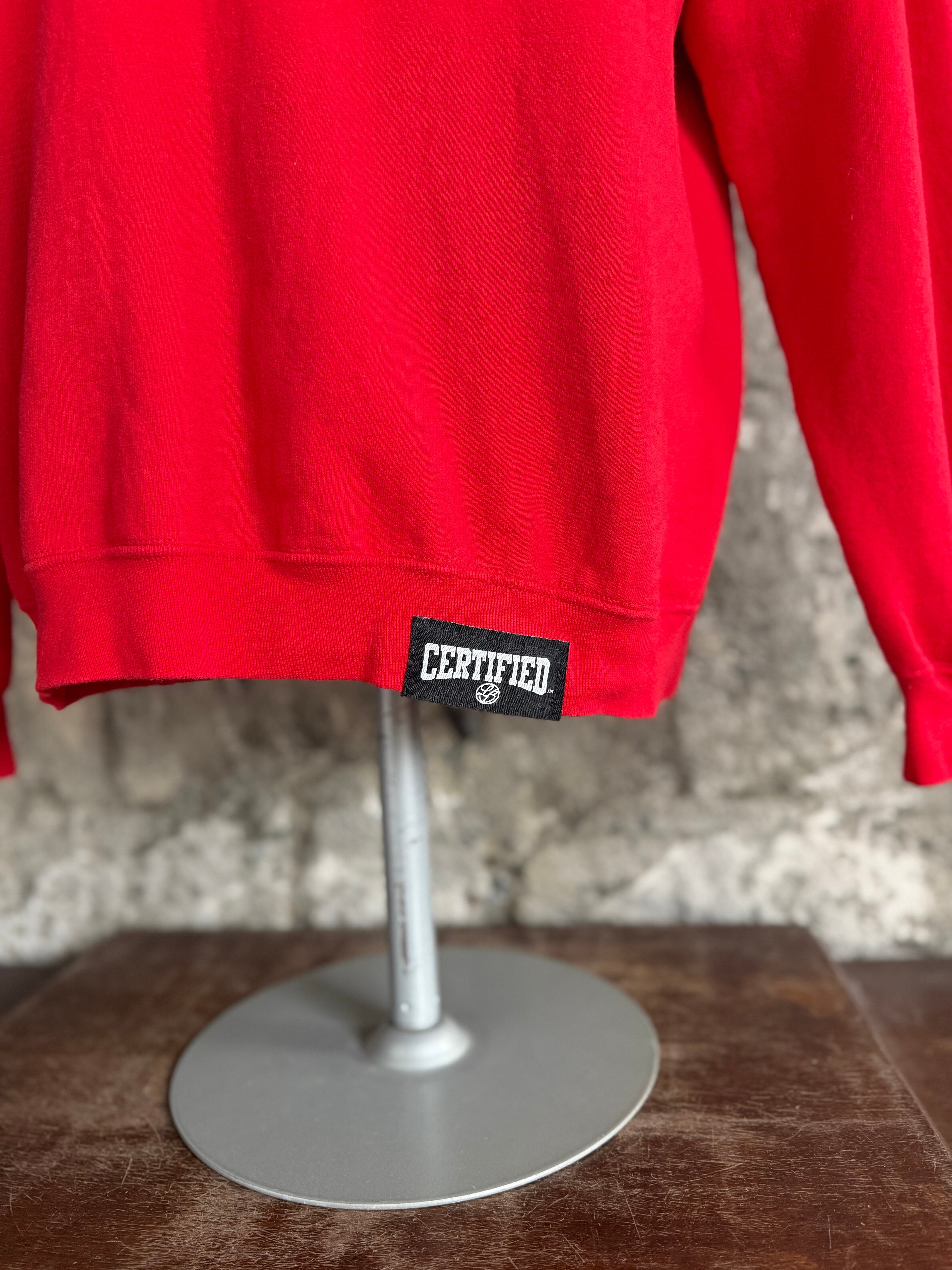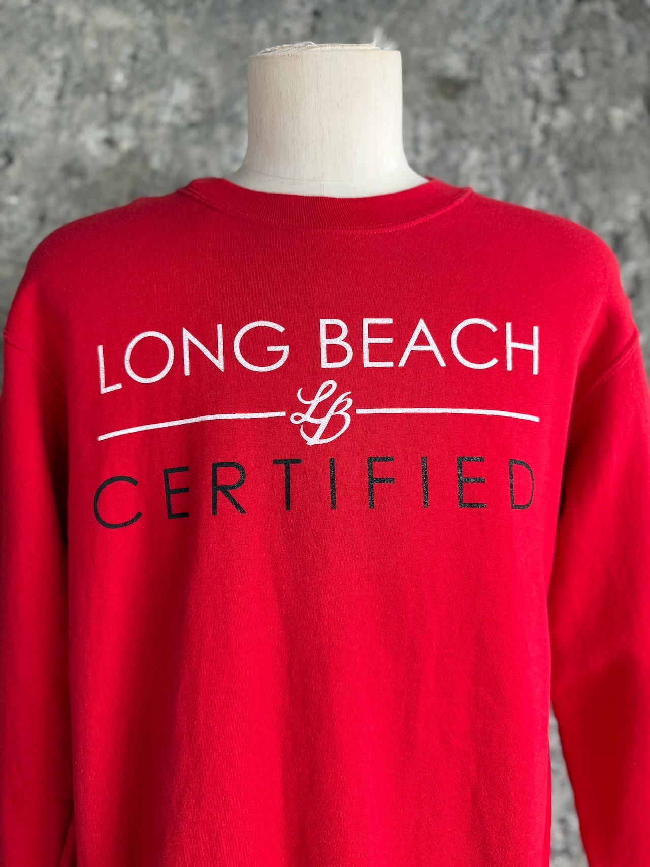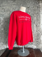 鮮やかなレッドに、LONG BEACHのロゴが映えるUSA製スウェット。