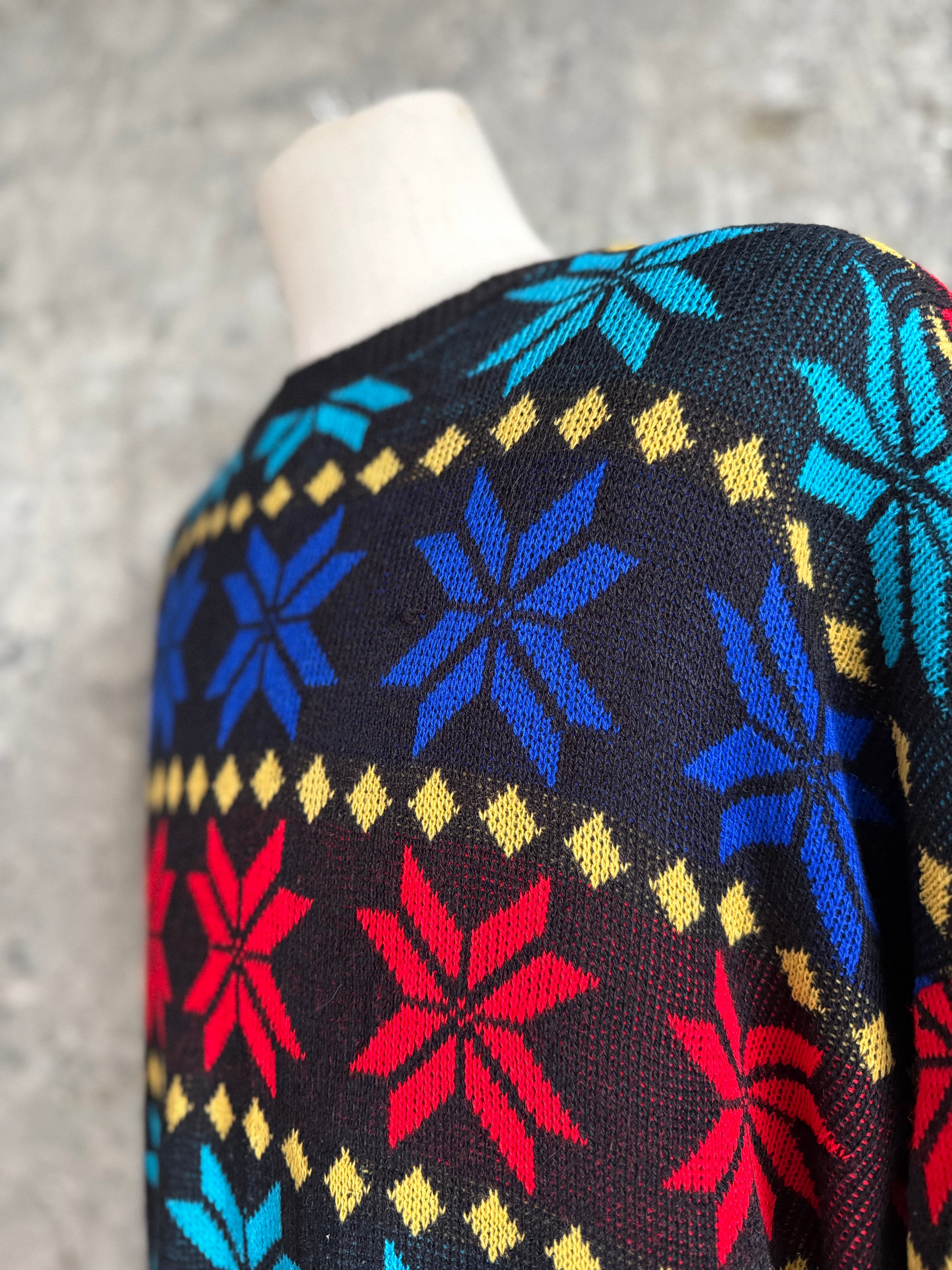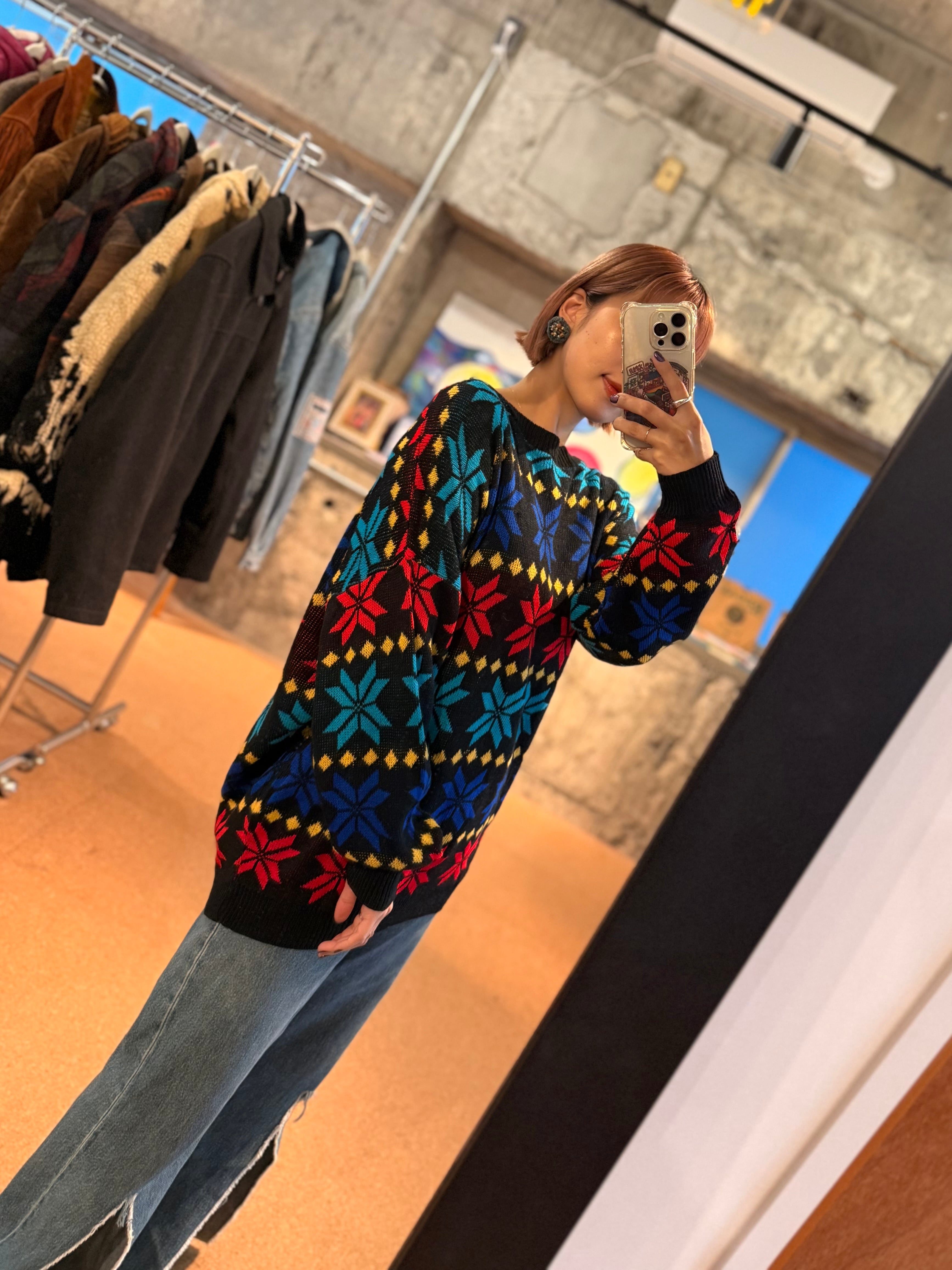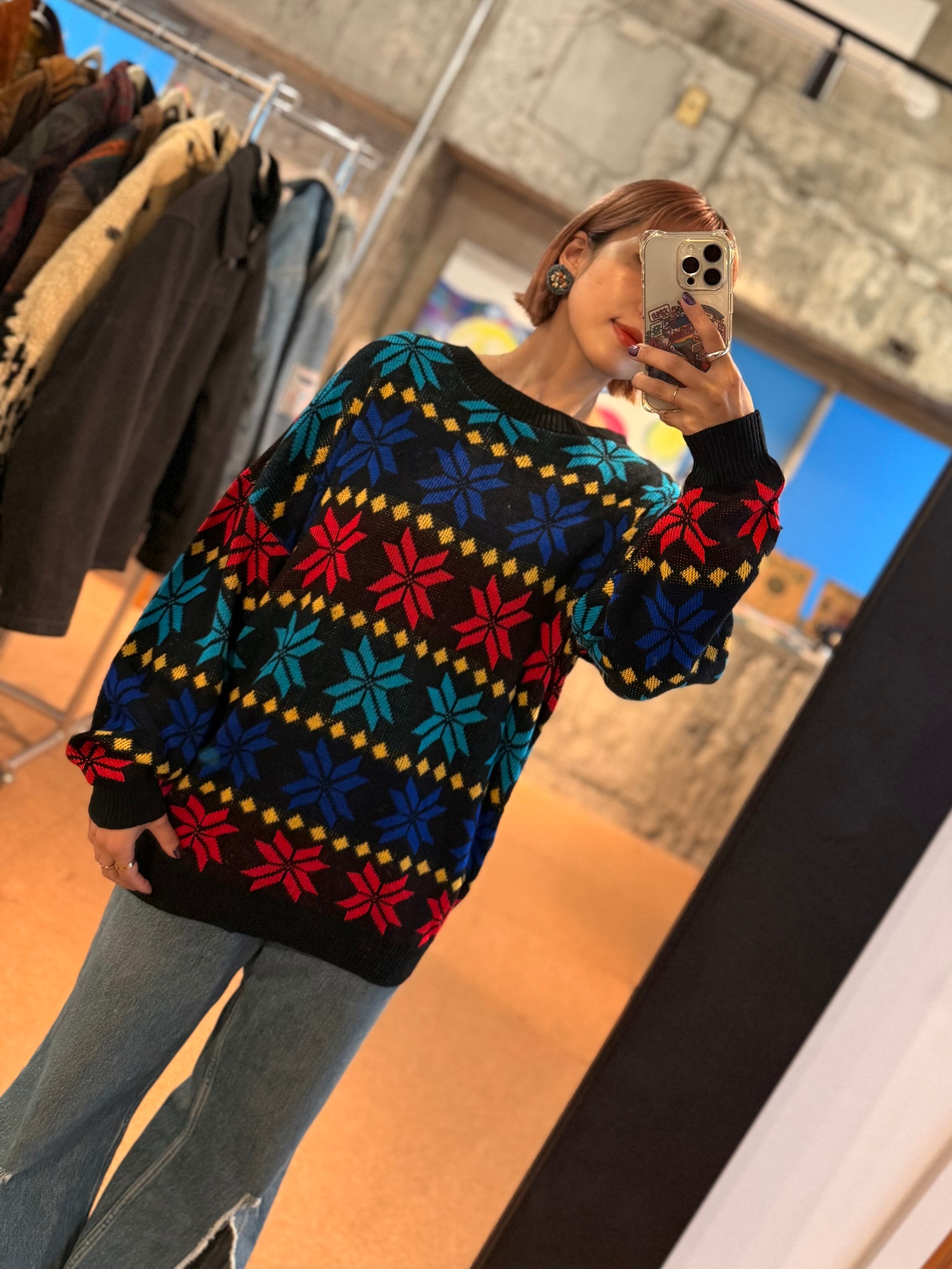 アメリカ製らしいビビットな色使いが主役の総柄ニット。