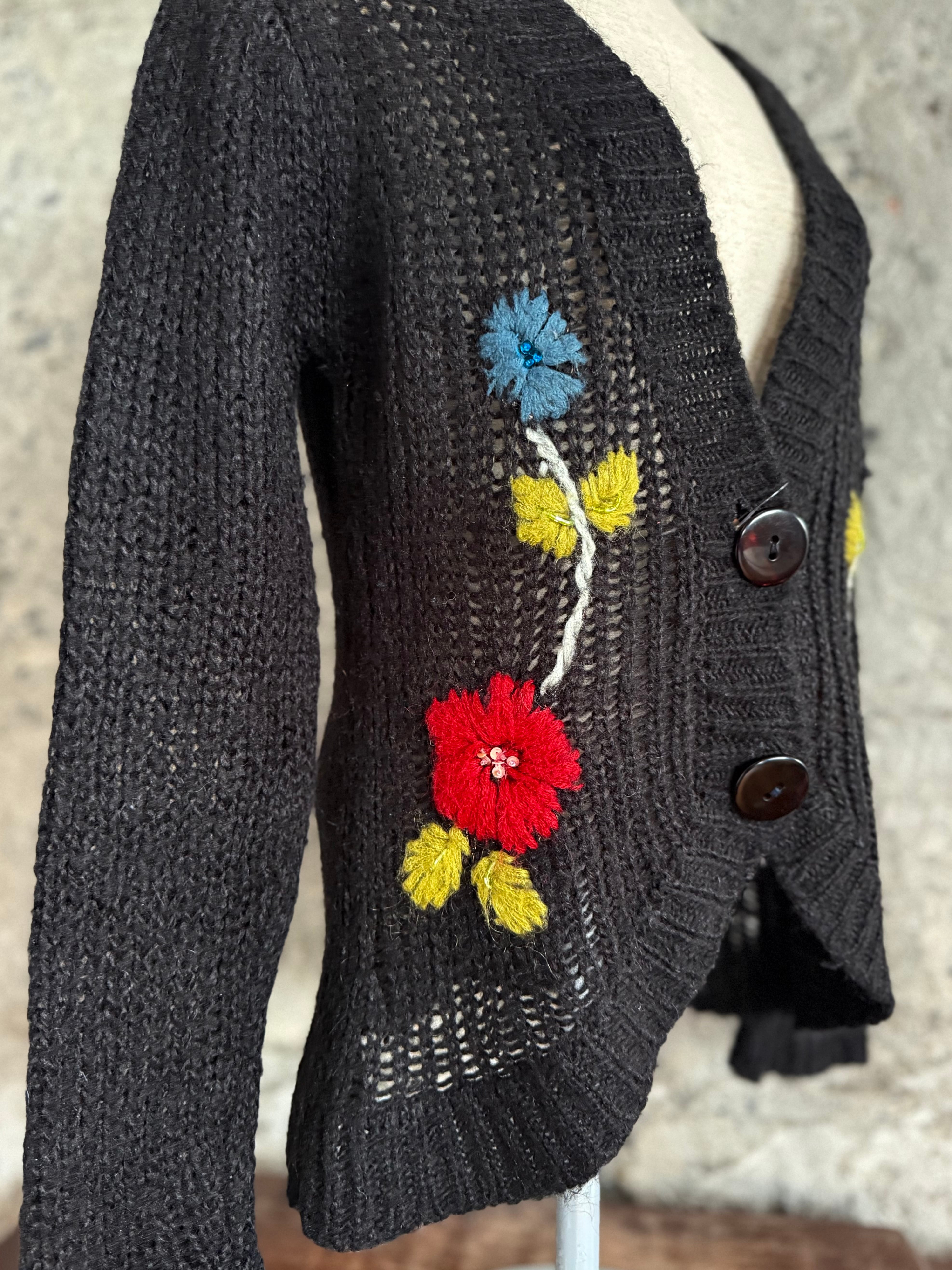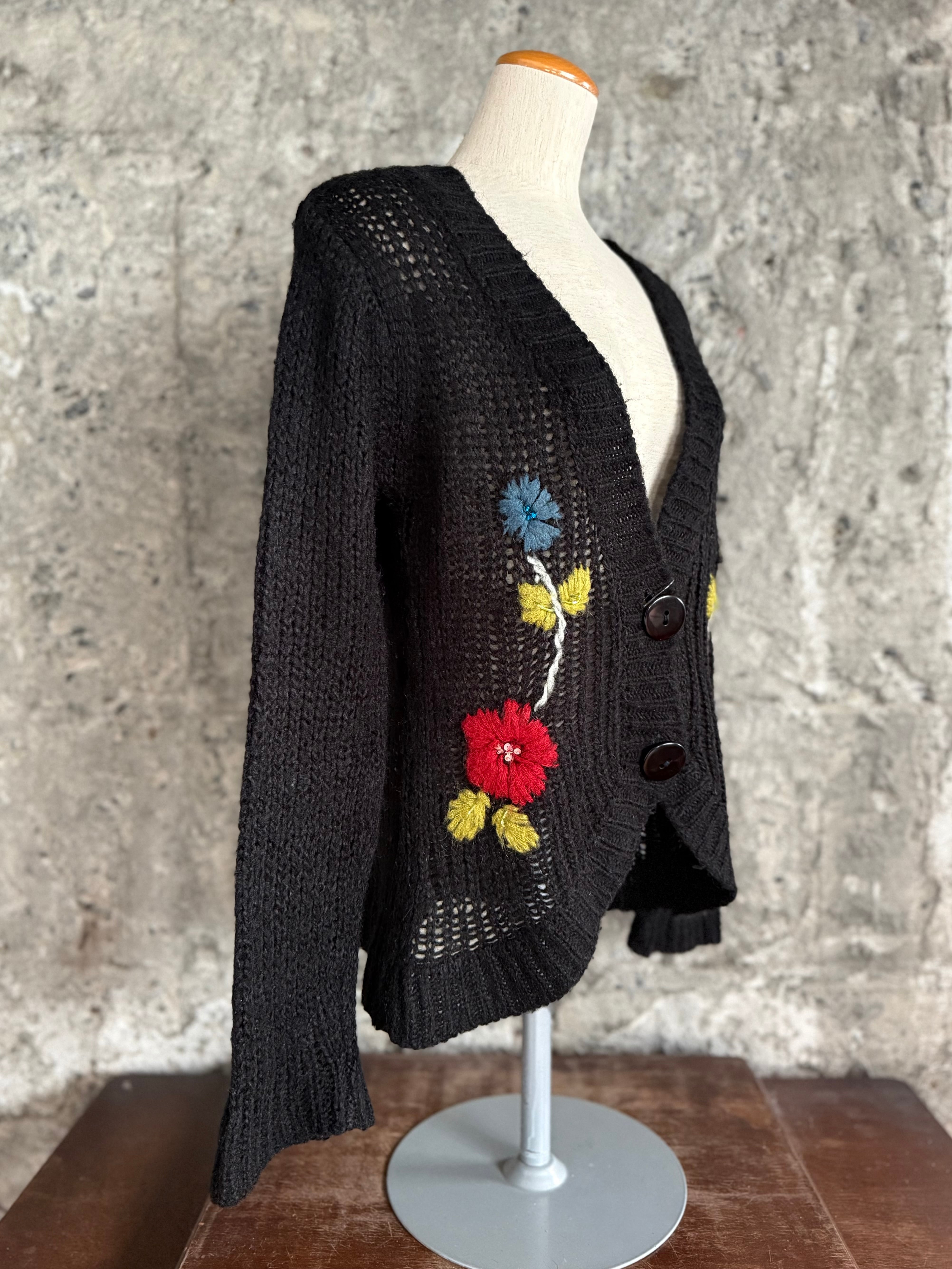 フロントに咲くフラワー刺繍が目を惹く、ブラックのニットカーディガン。