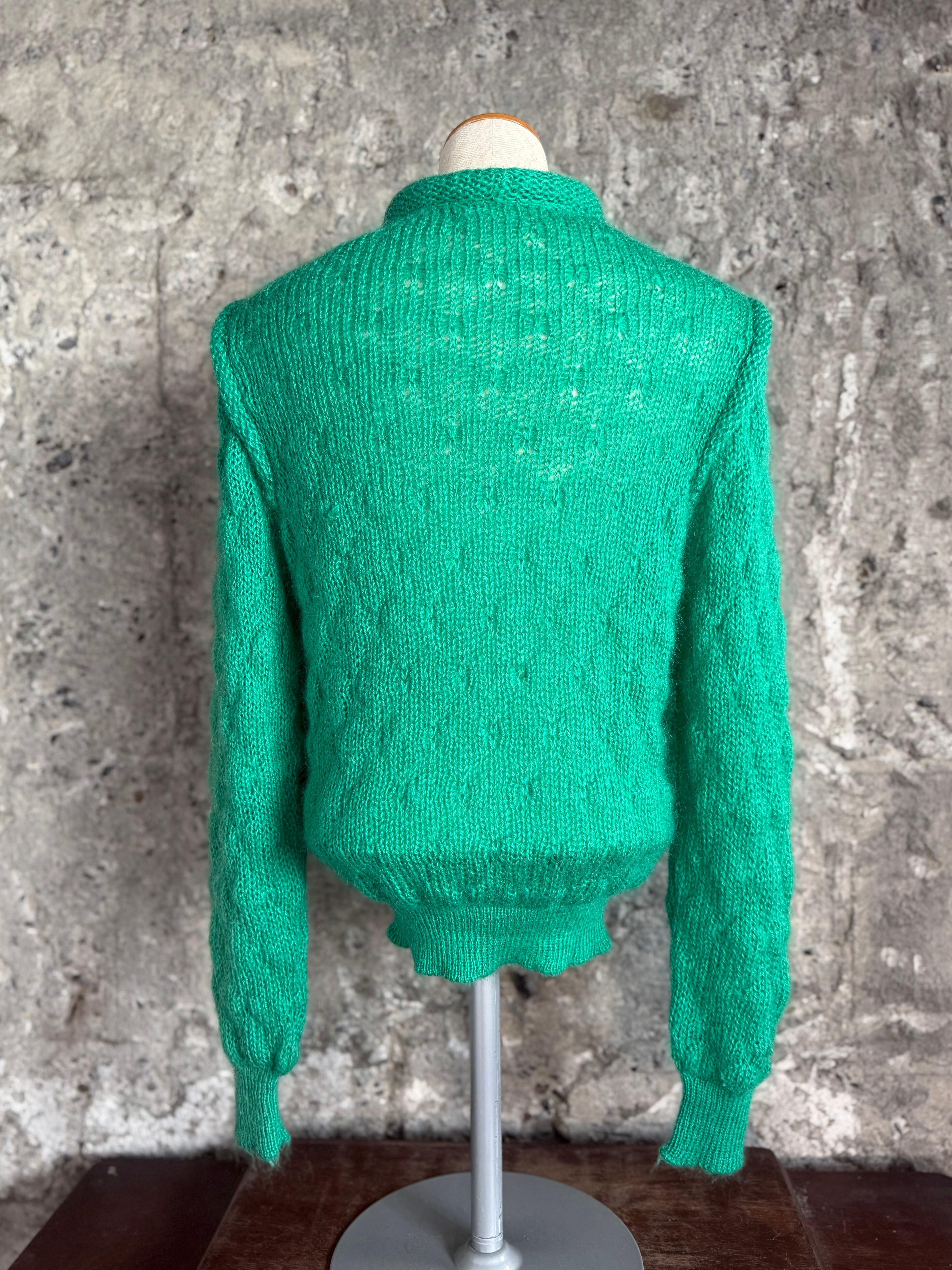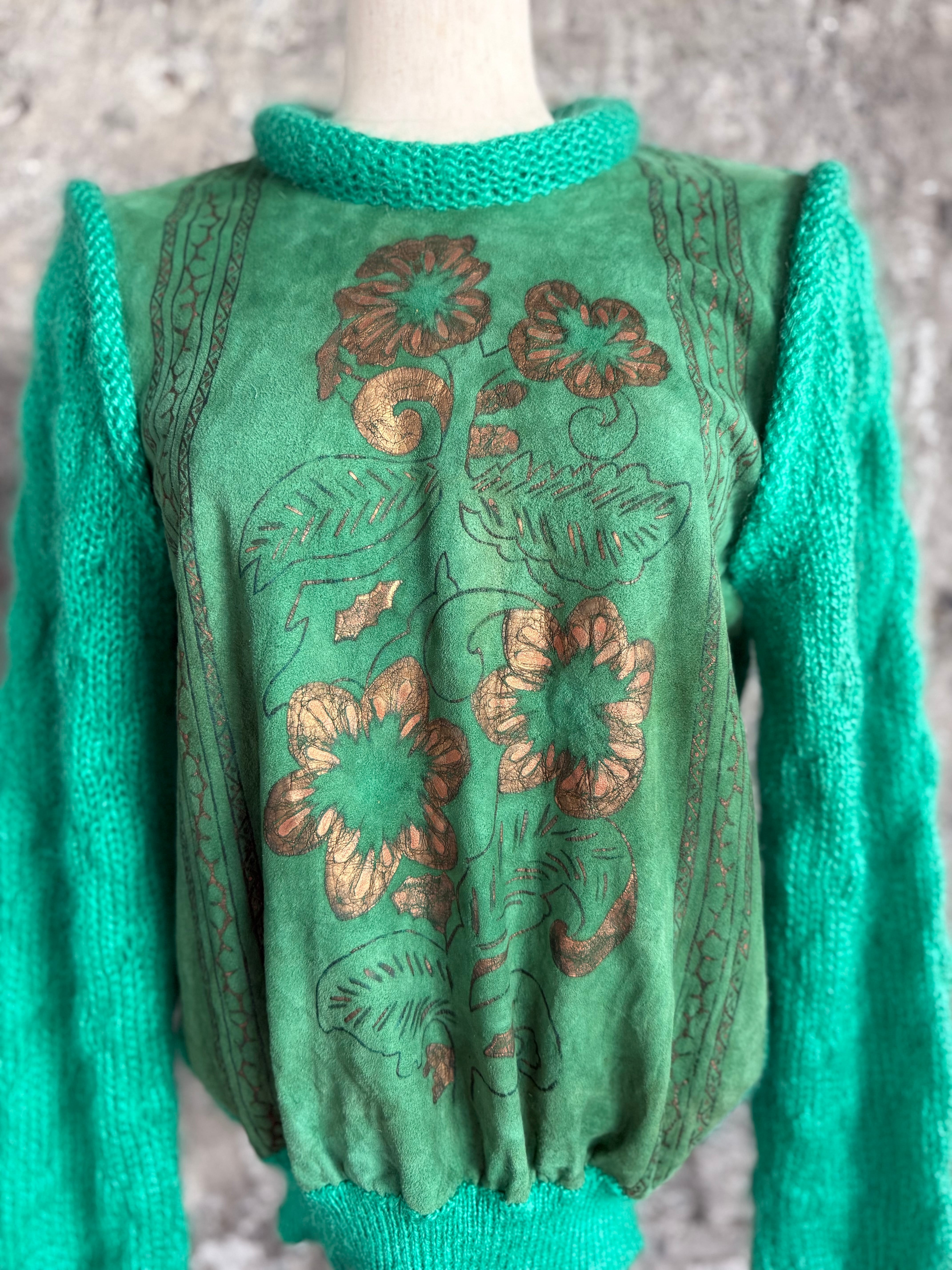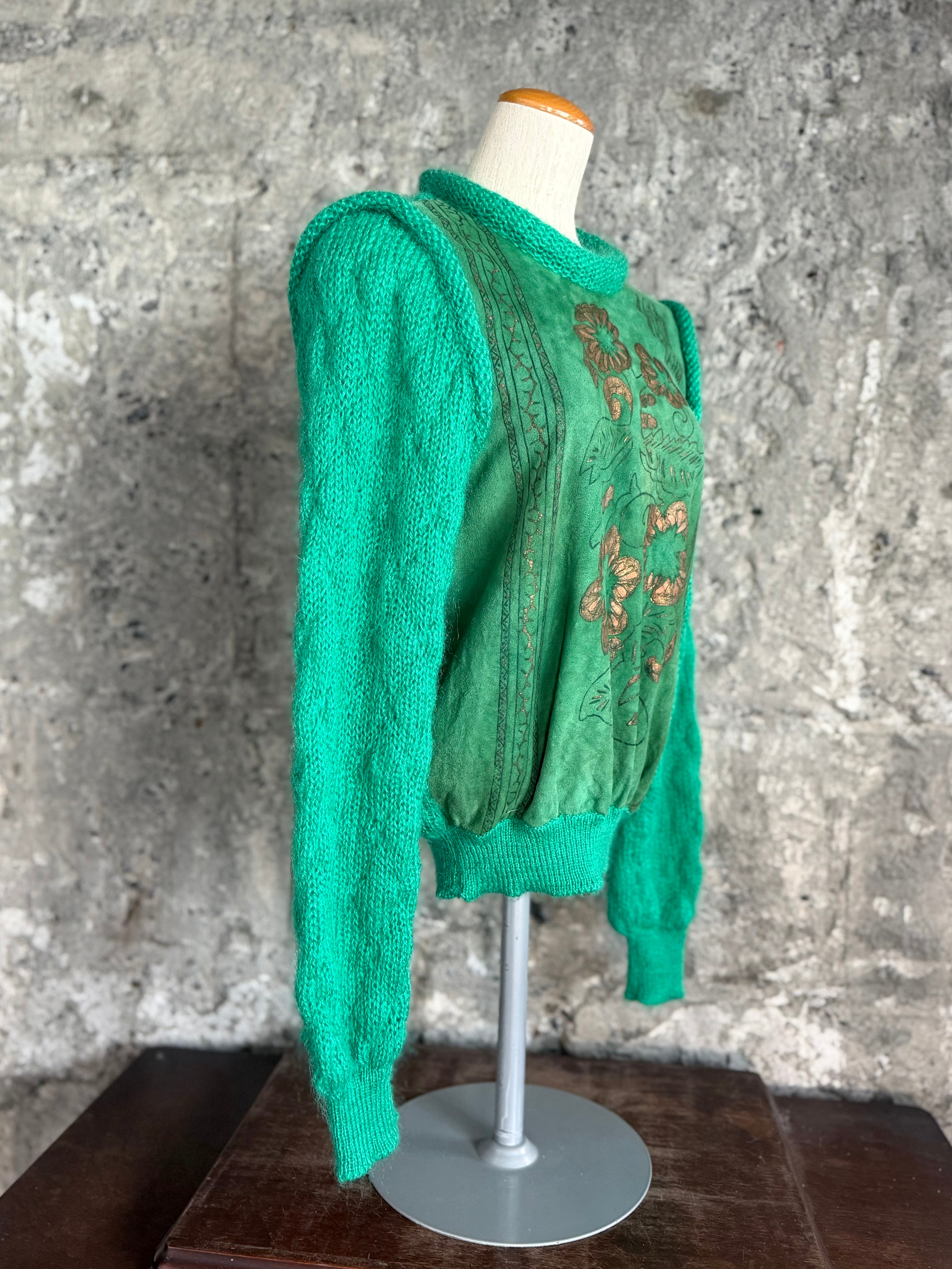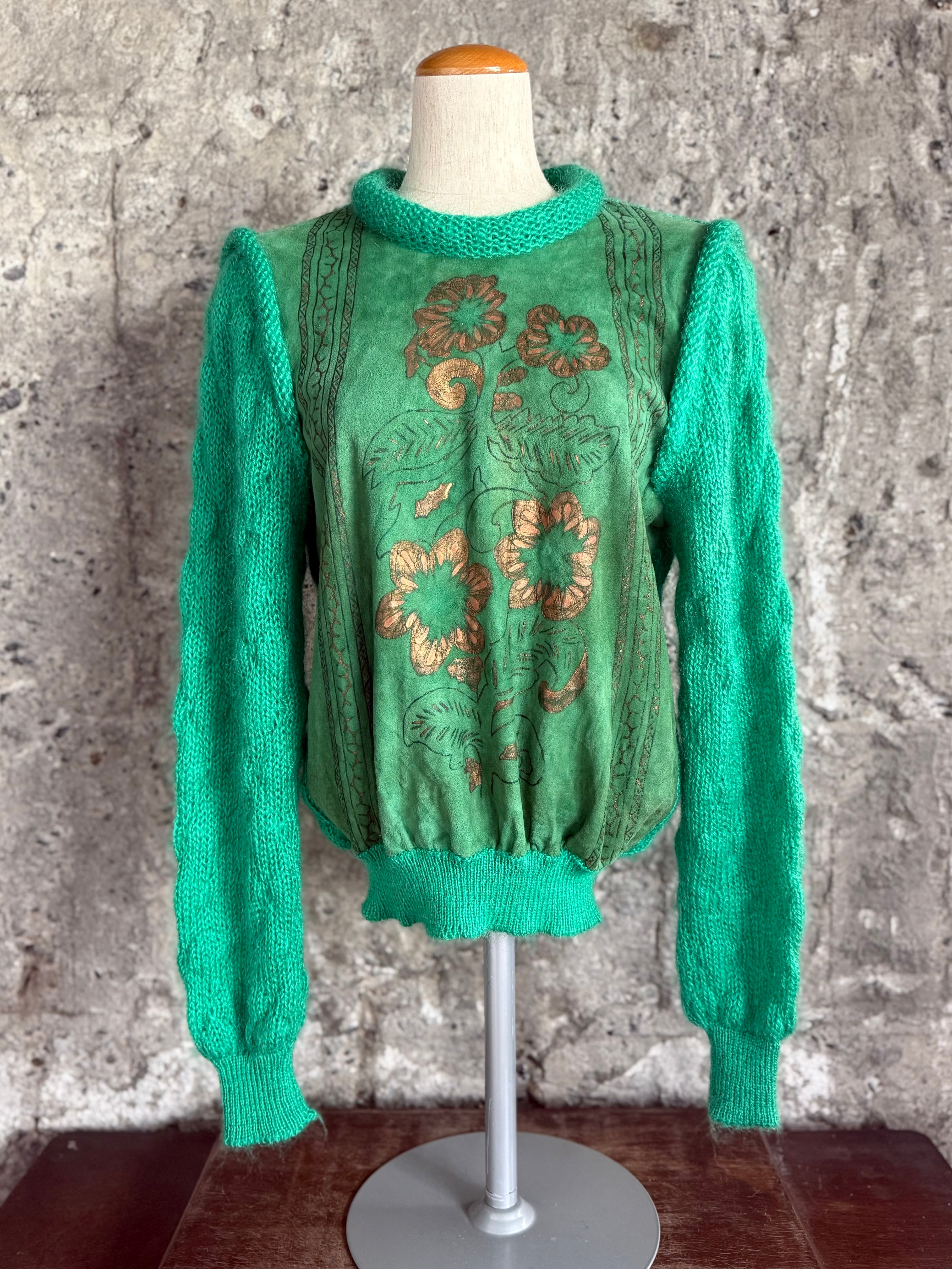 スウェード切り替え フラワーモチーフ モヘアミックス ニットプルオーバー
