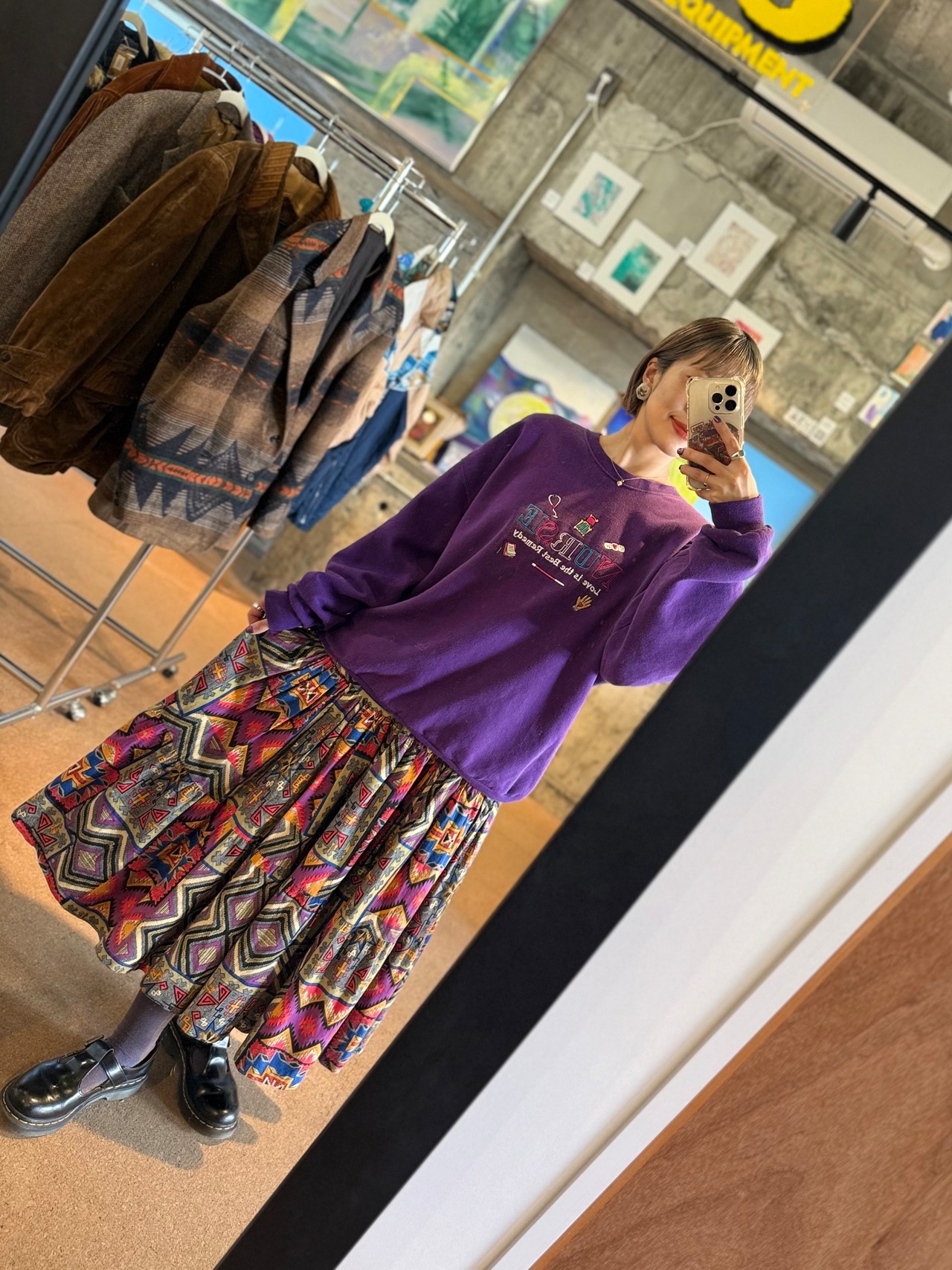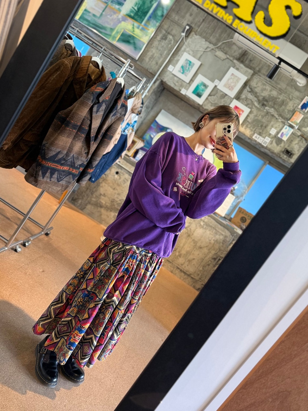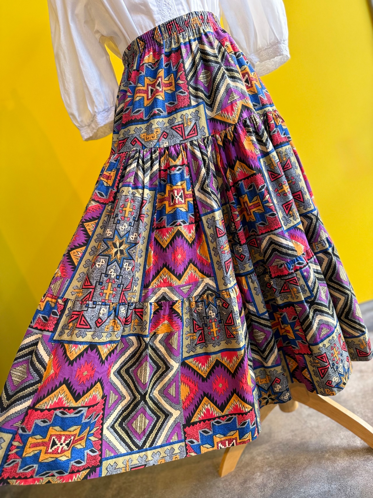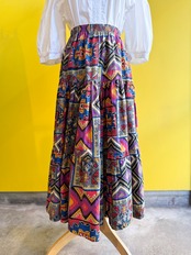 80s〜90sらしい色使いと大胆な“トライバル×ジオメトリック柄”が魅力のヴィンテージスカートです。