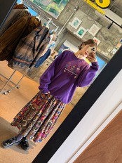 鮮やかなパープル・ピンク・ブルー・オレンジが重なり合ったパッチワークのような柄が、動くたびにふわりと広がり、存在感たっぷりの1枚。