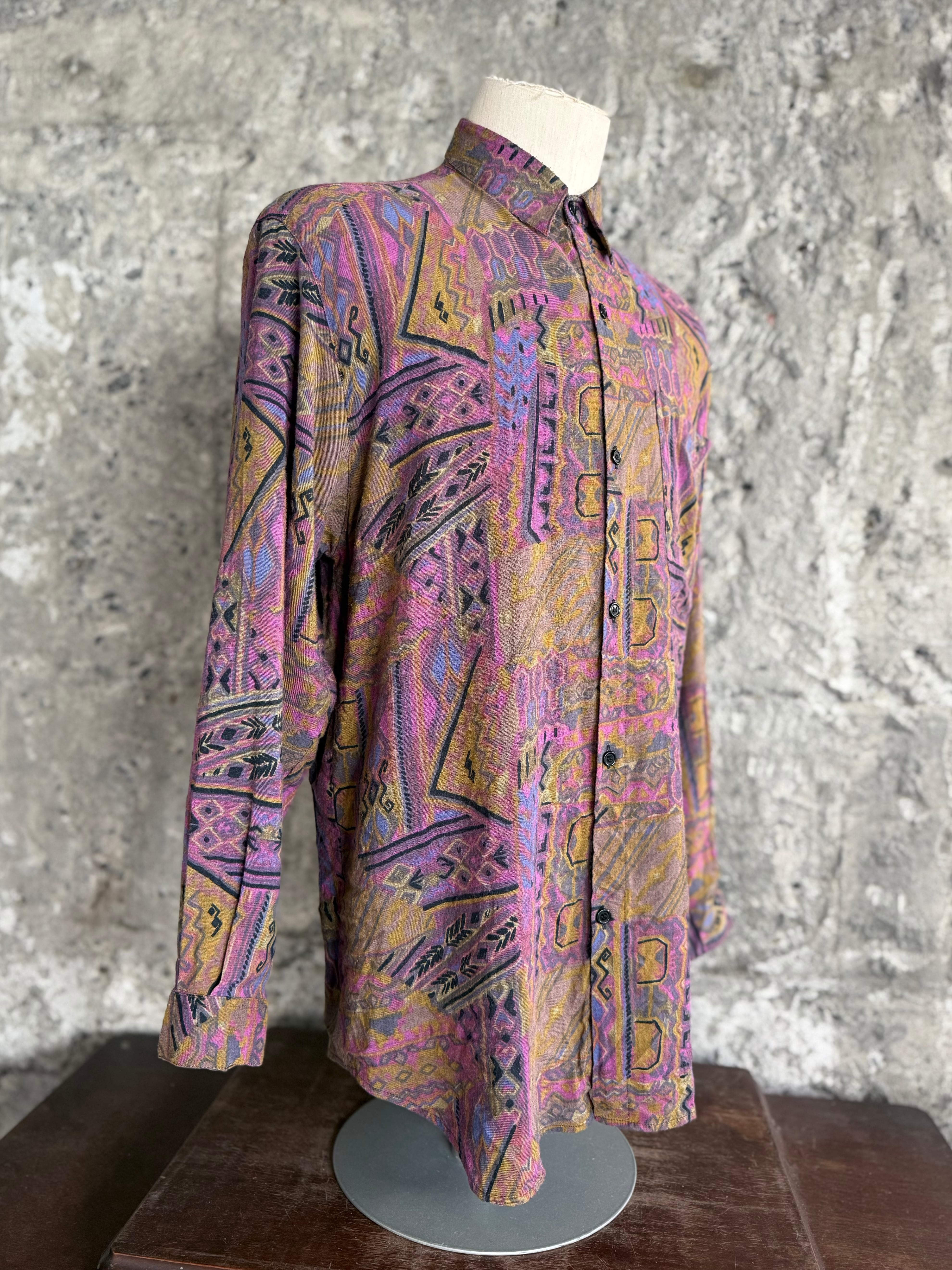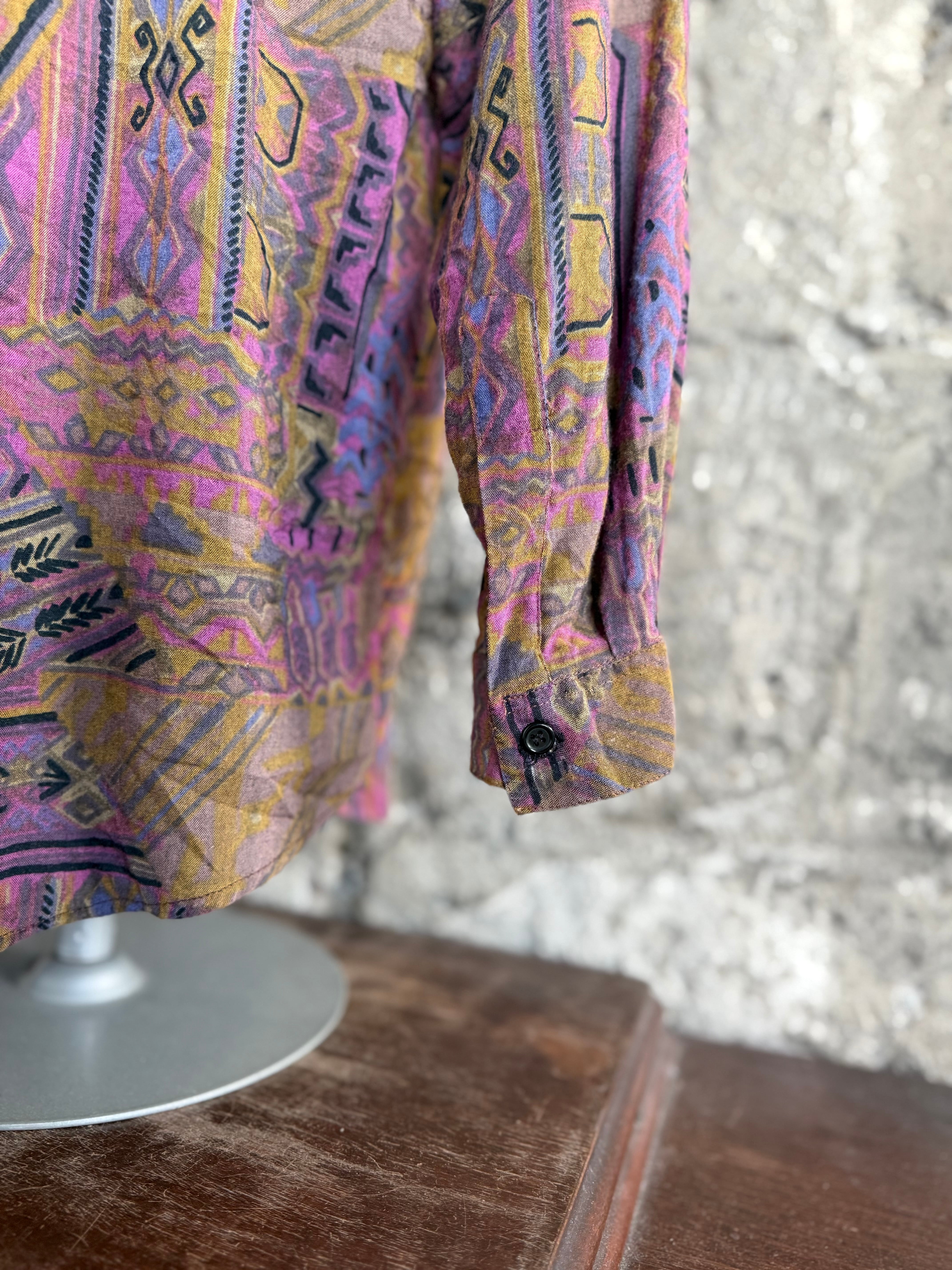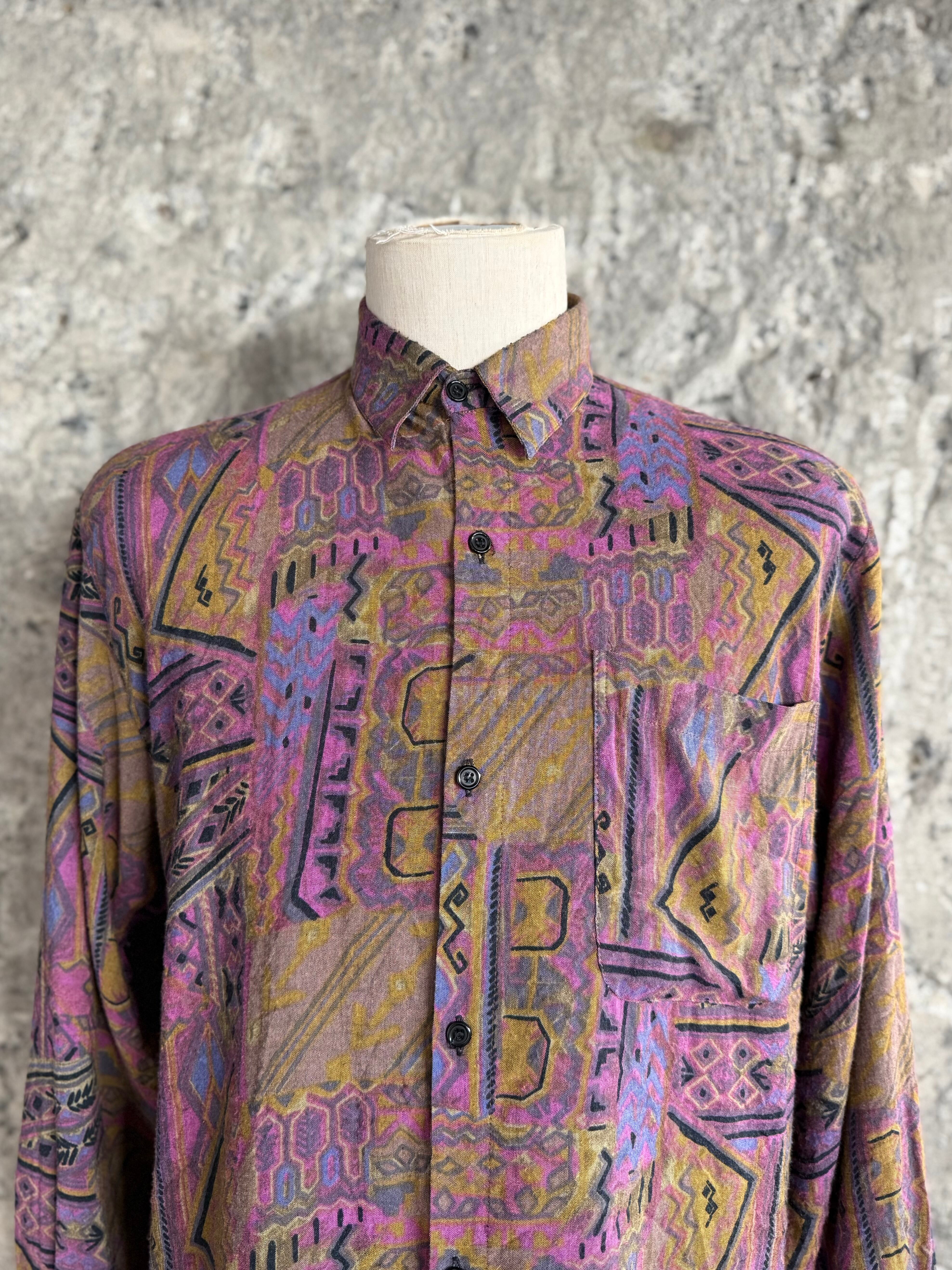 アブストラクト×エスニック要素が混ざり合った総柄デザインが魅力のヴィンテージシャツ。
