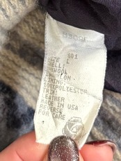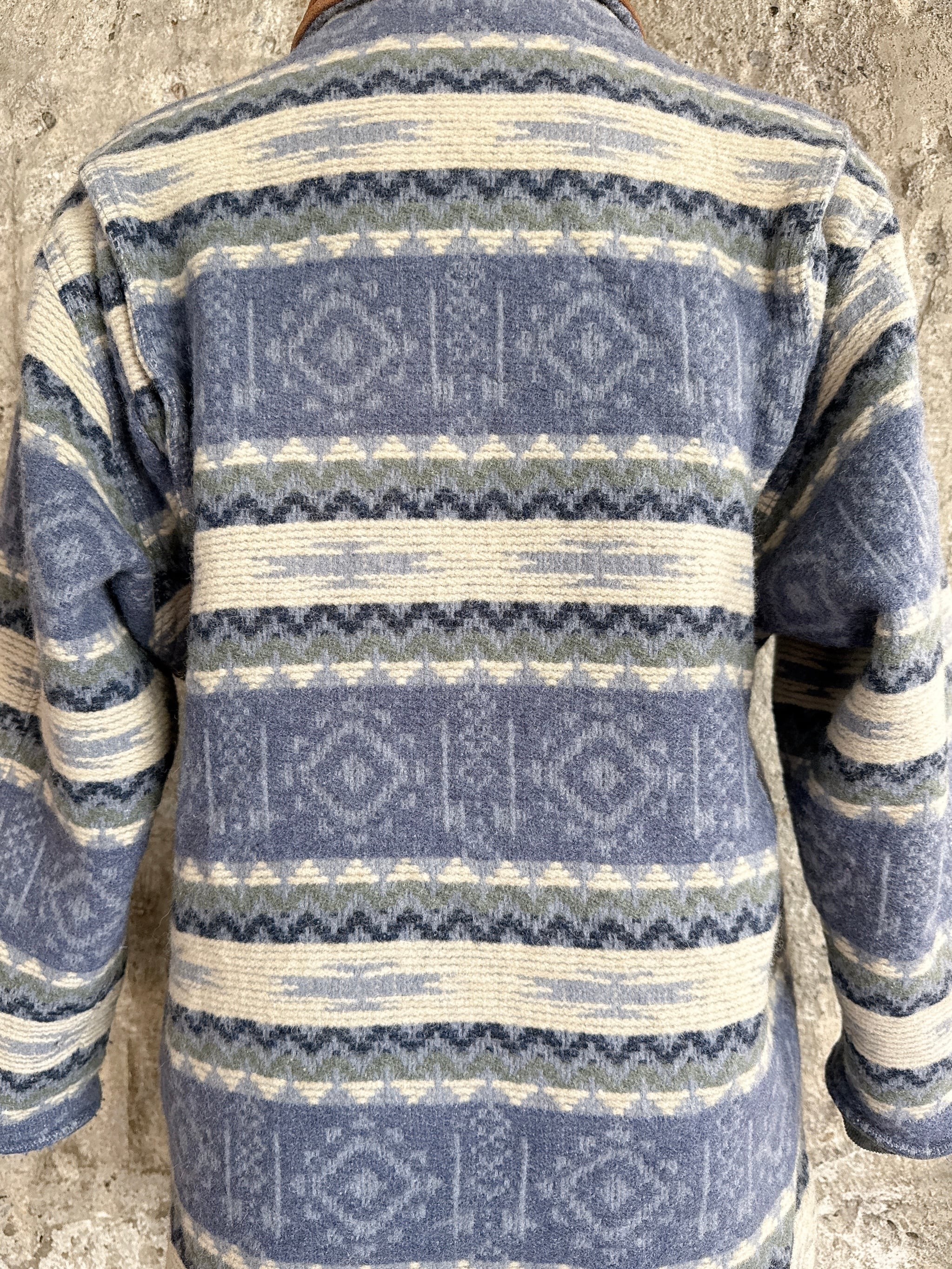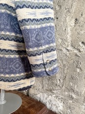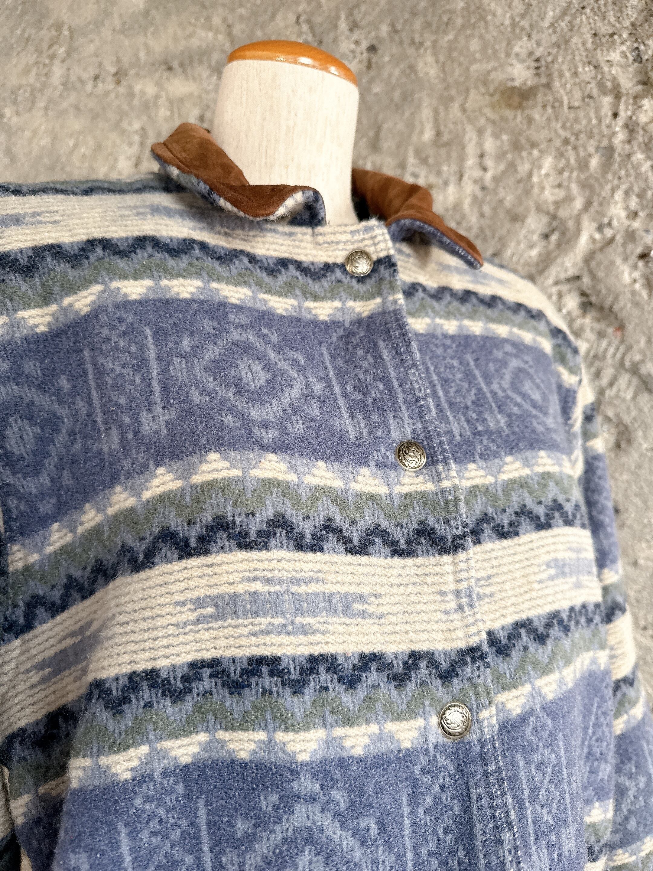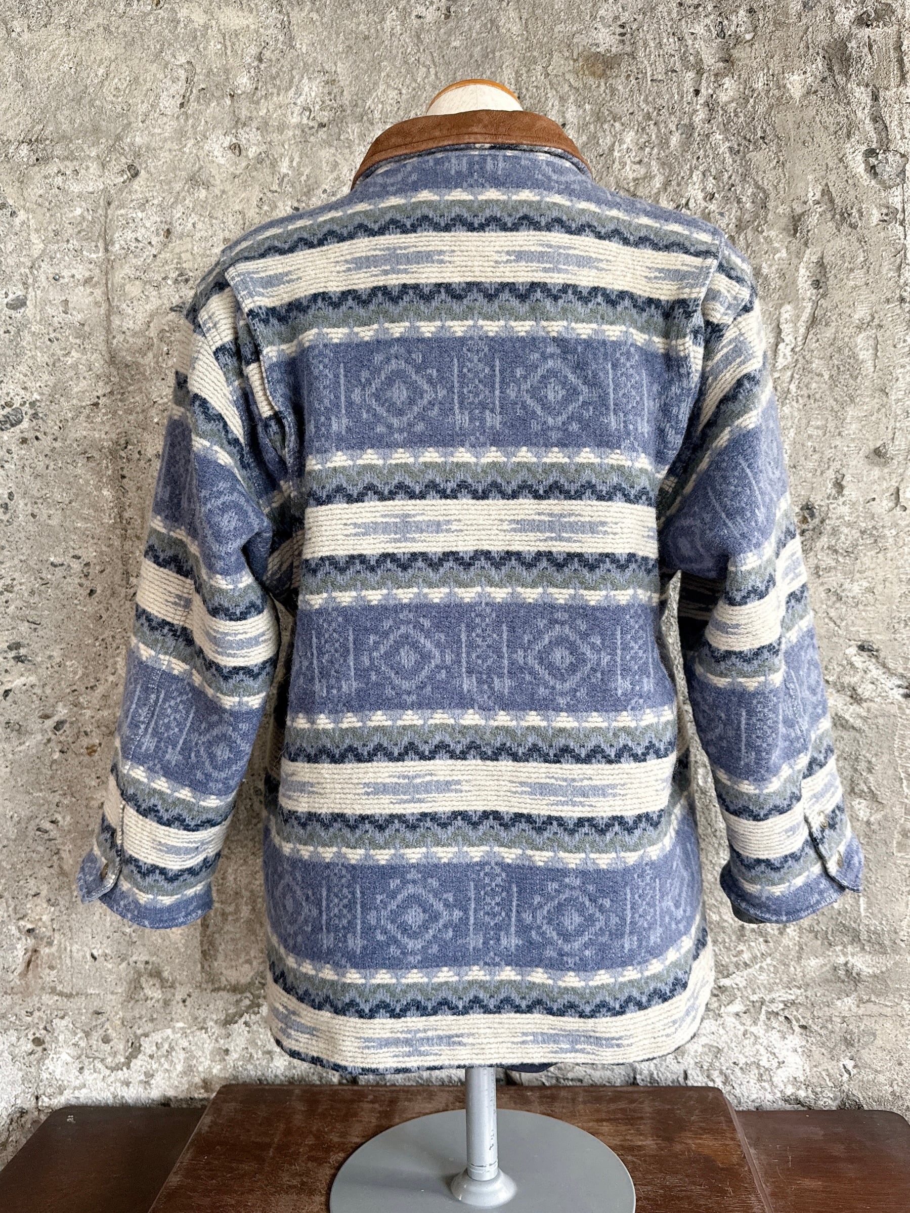 ネイティブ調の織り柄に、スエード調レザーの襟がアクセントになったクラシカルなデザインです。