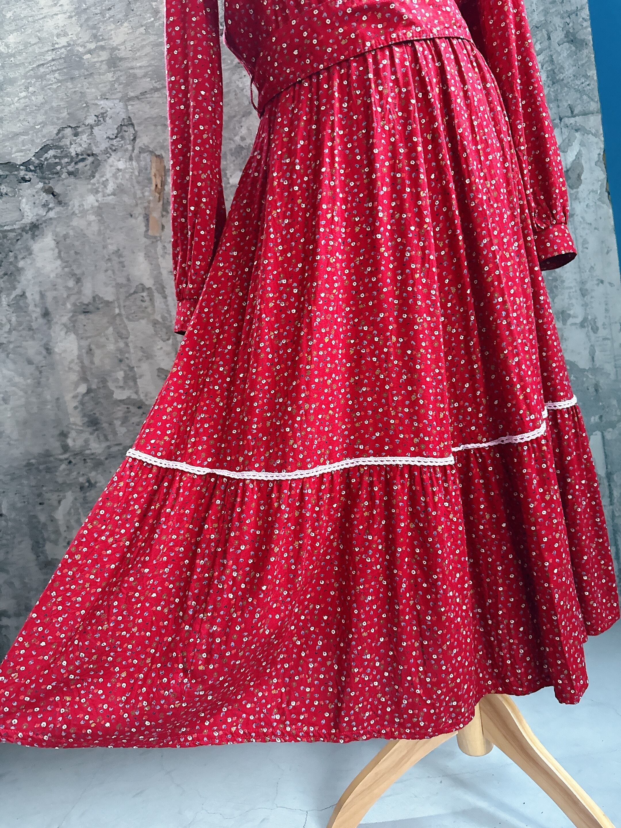 首元のさりげないフリルと、共布ベルトでウエストマークできるデザインが上品でやさしい雰囲気を演出してくれます。