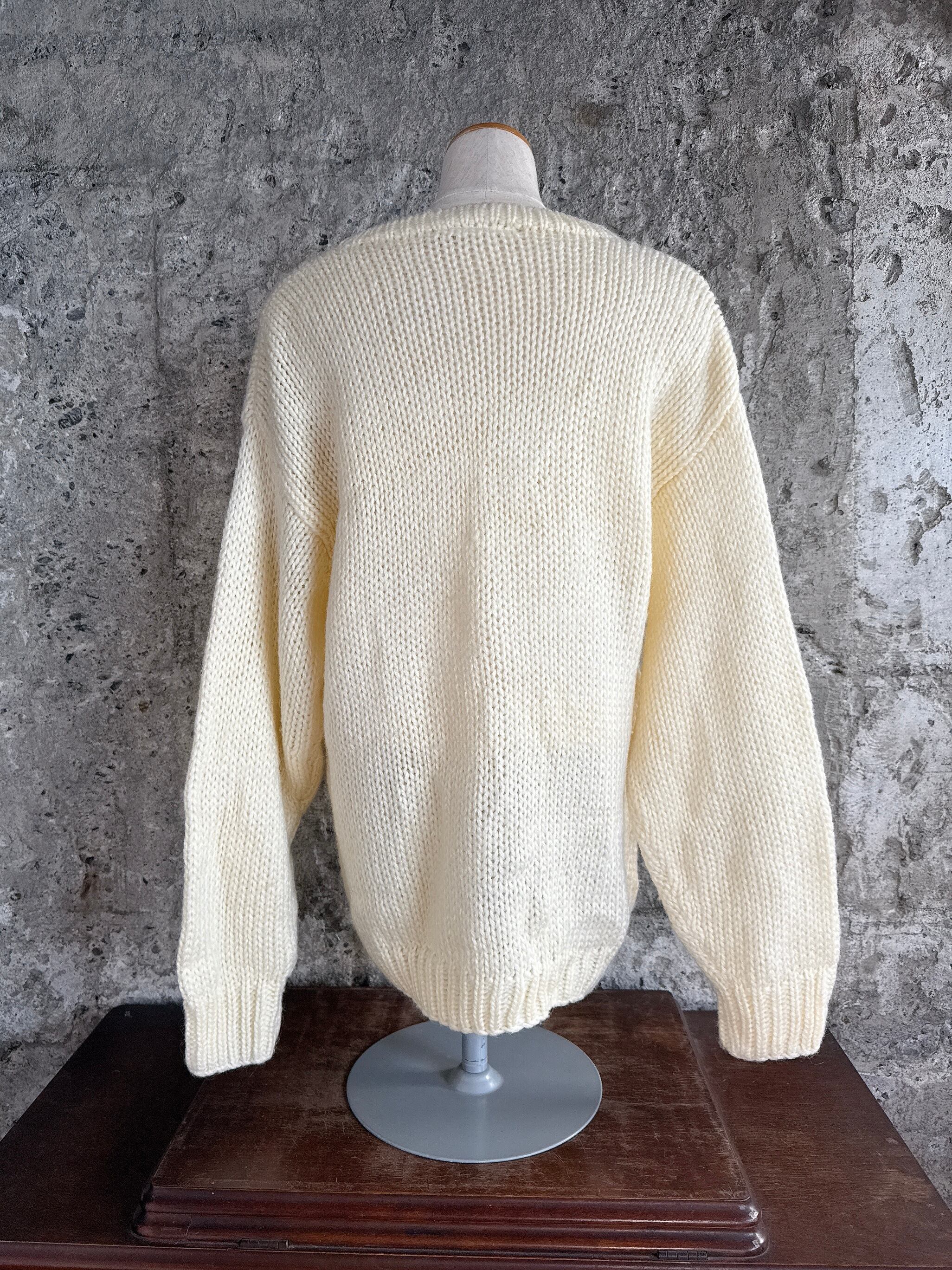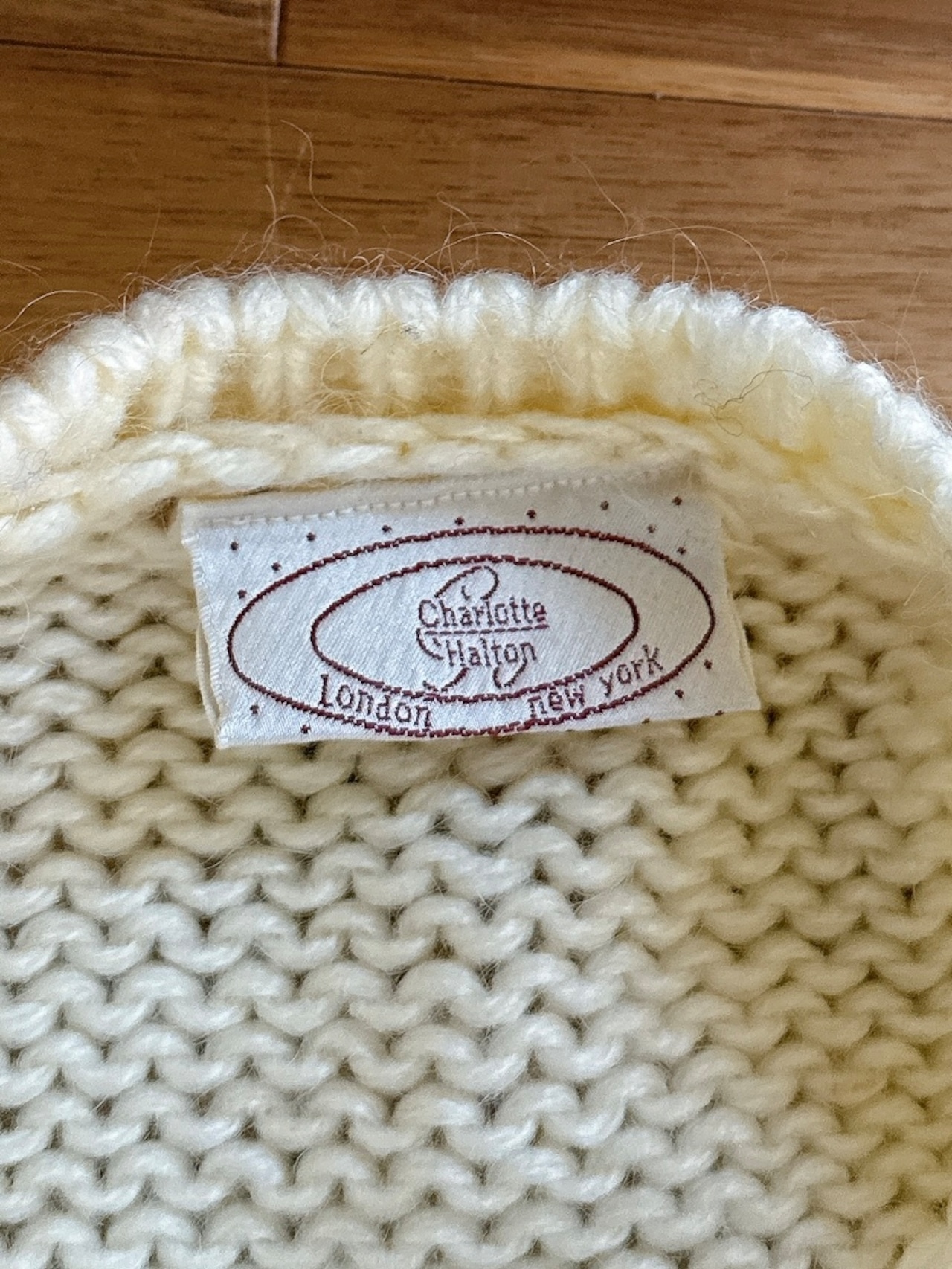 ざっくりと編まれたハンドニットならではの風合いと、ところどころに施された立体感のある編み柄がシンプルながらも表情のある一枚です。