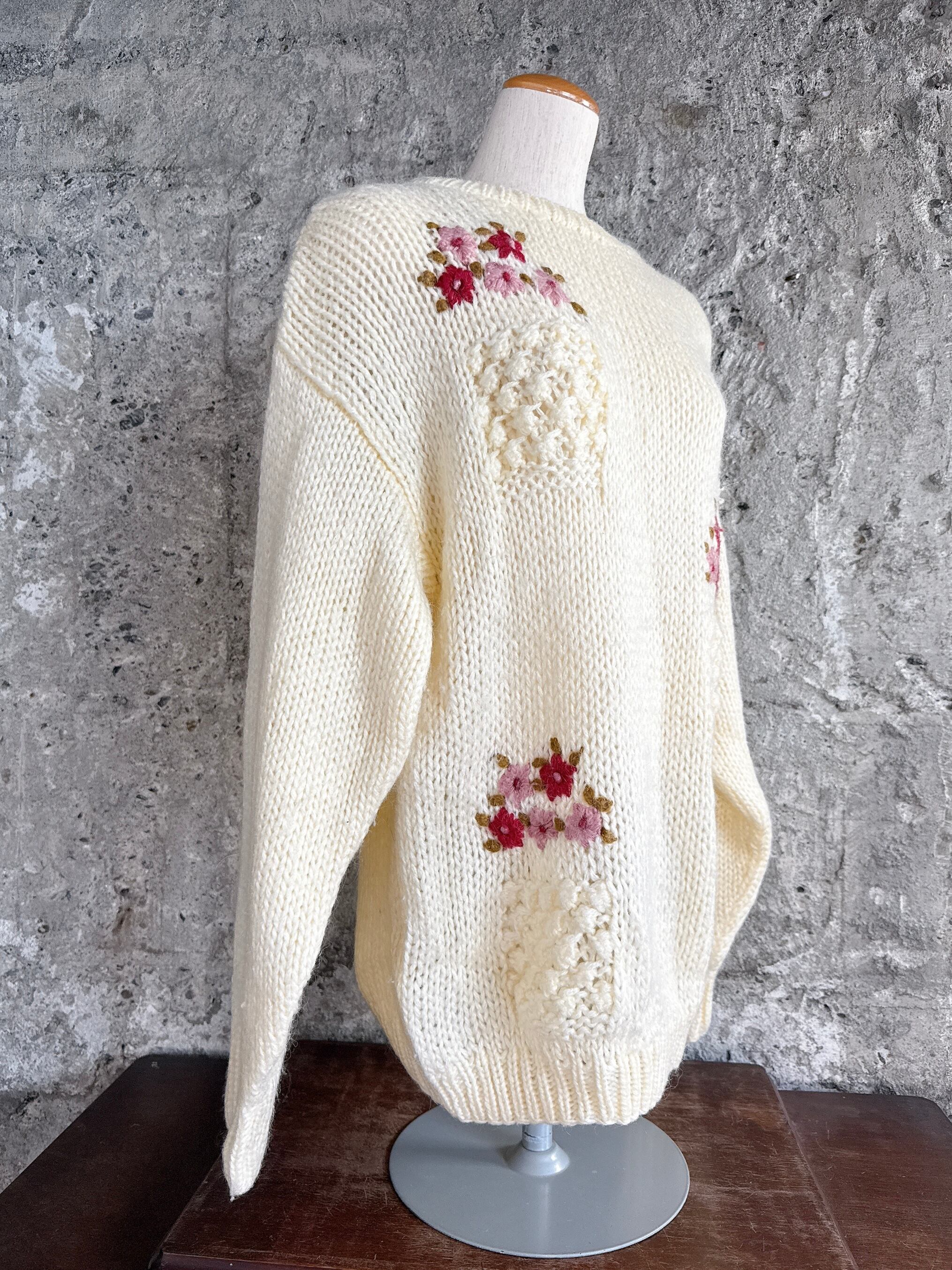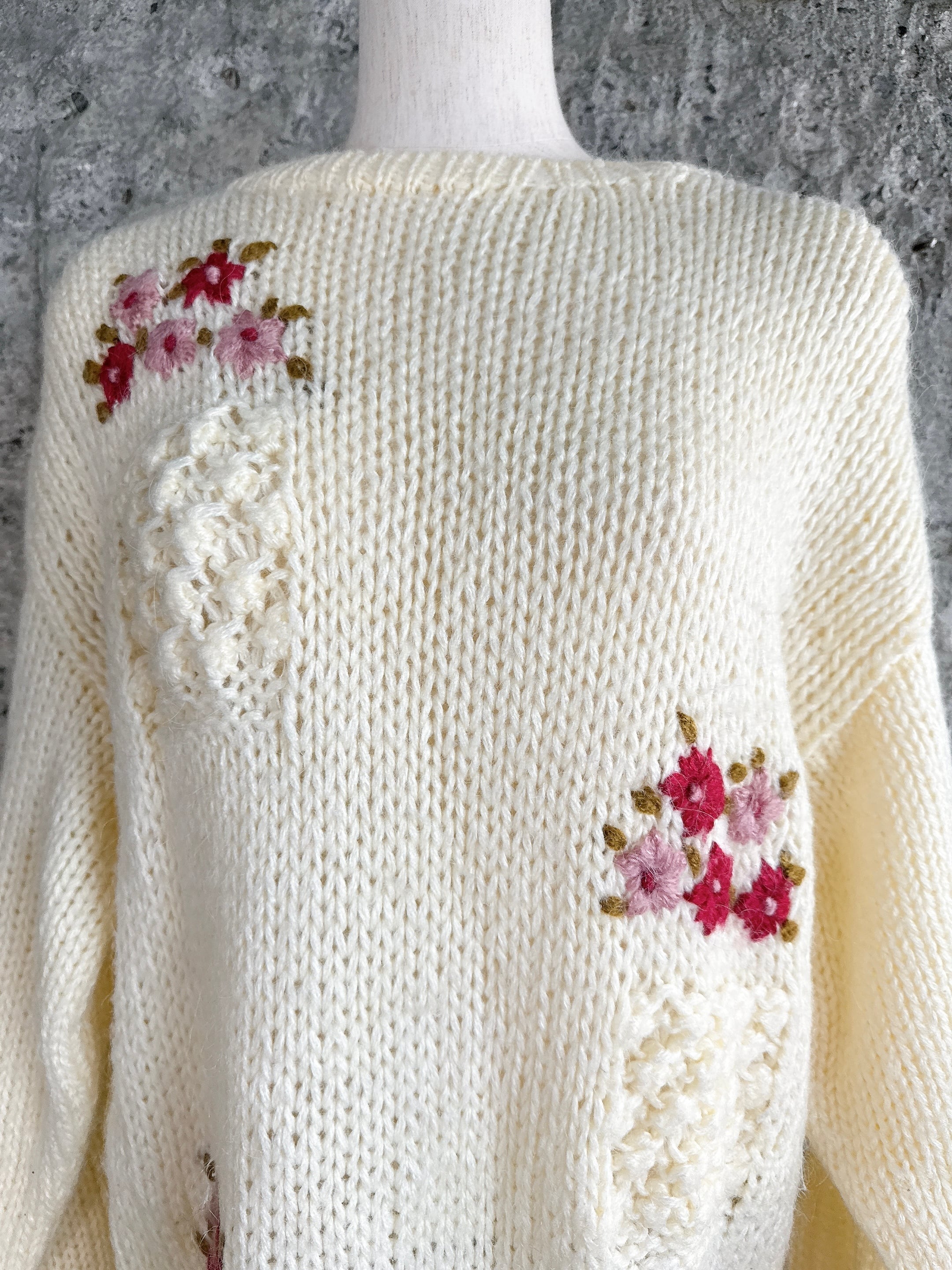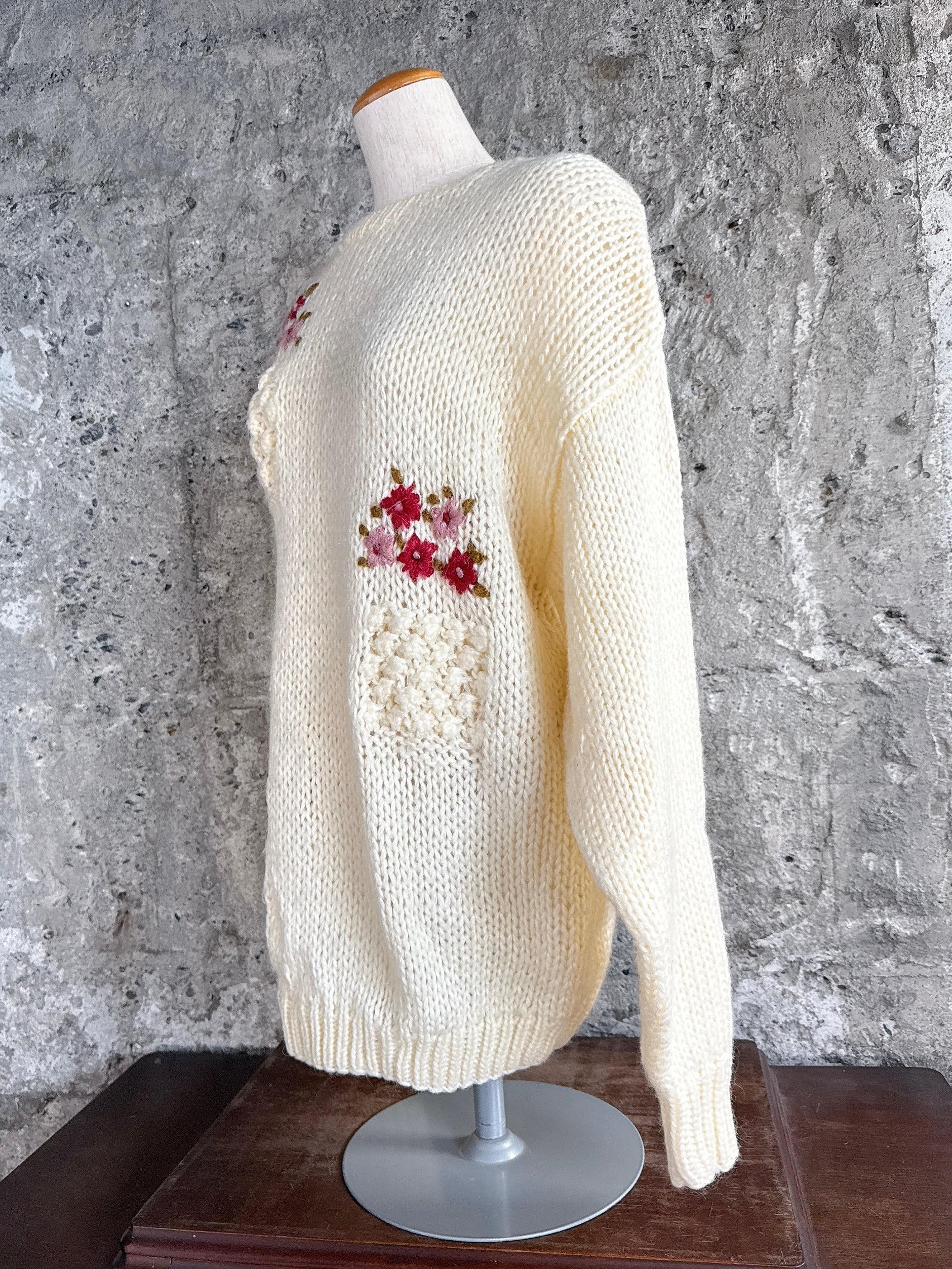 手刺繍のようなフラワーモチーフが散りばめられたあたたかみのあるニットプルオーバー。
