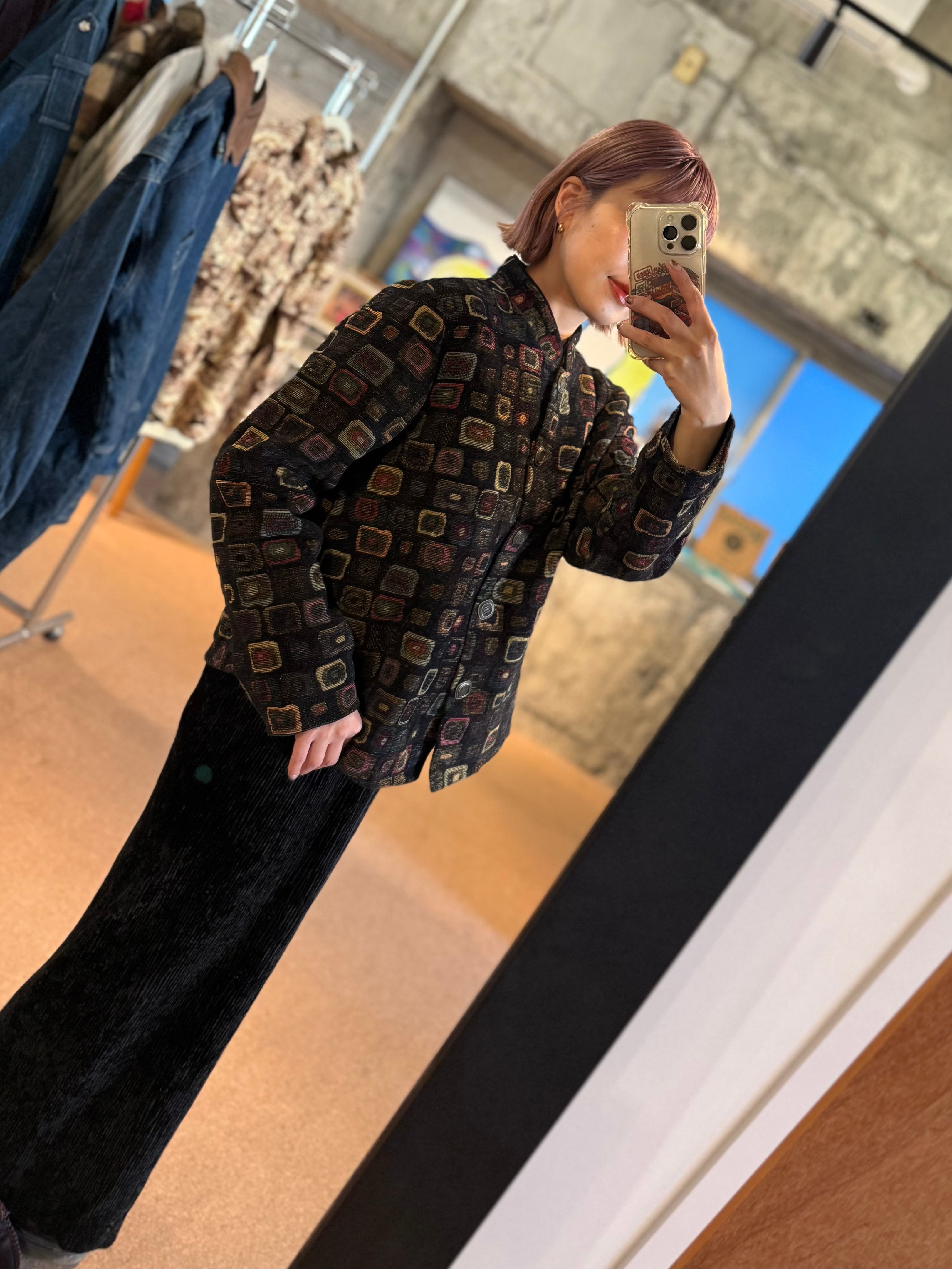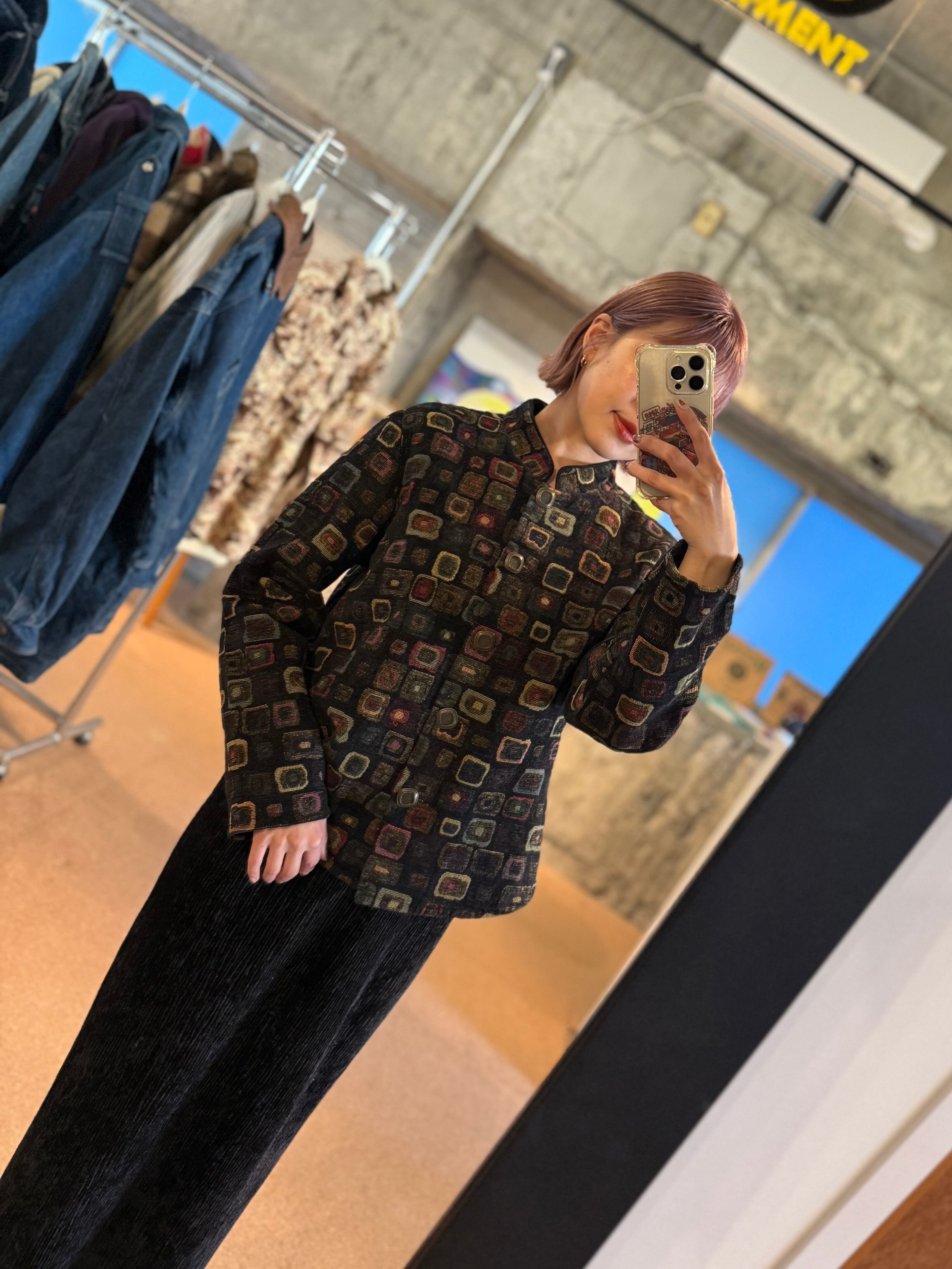 プリントではなく、糸の重なりで柄を描く“ゴブラン織り”ならではの、立体感と奥行きのある表情が魅力の一着です。