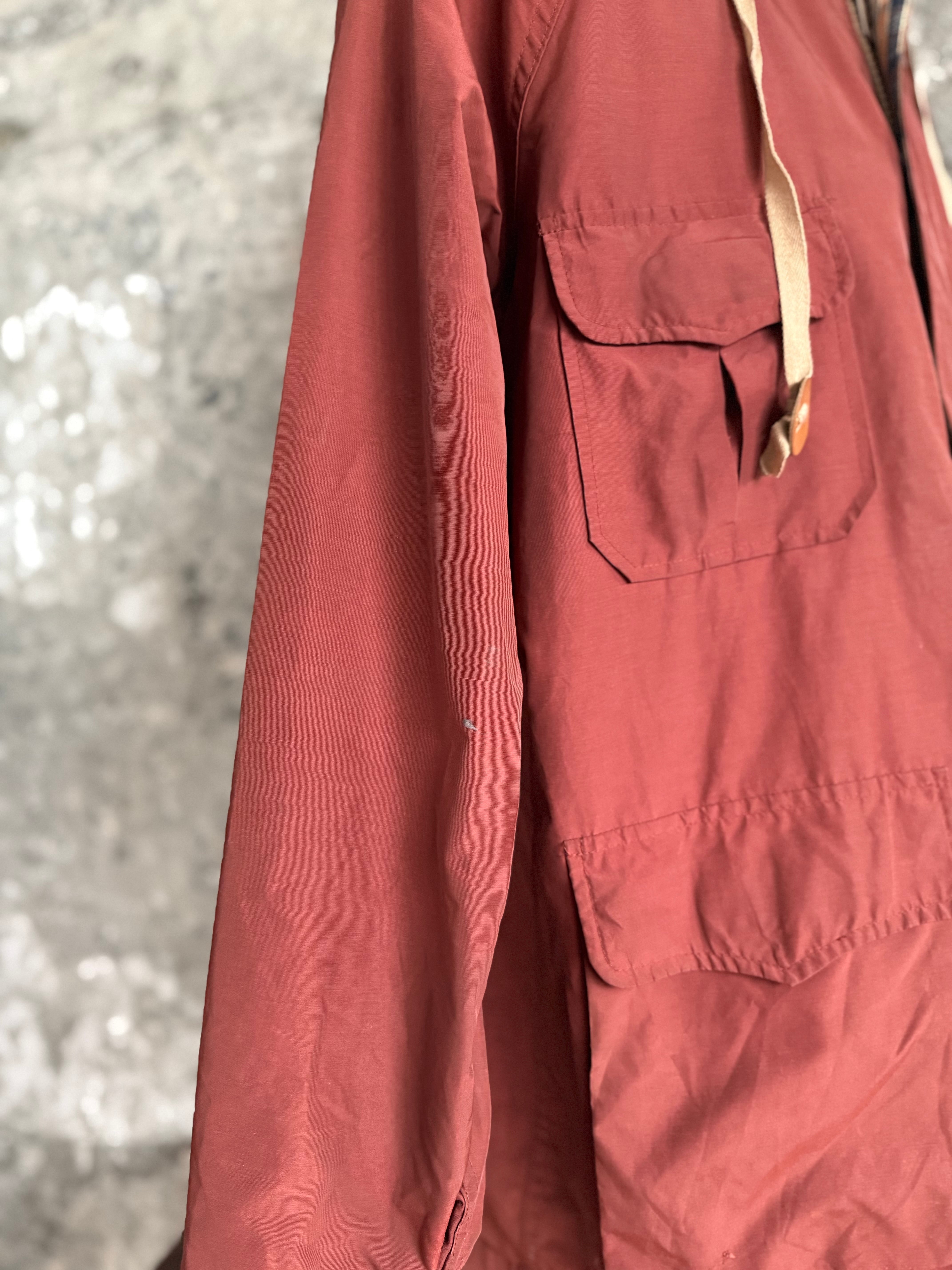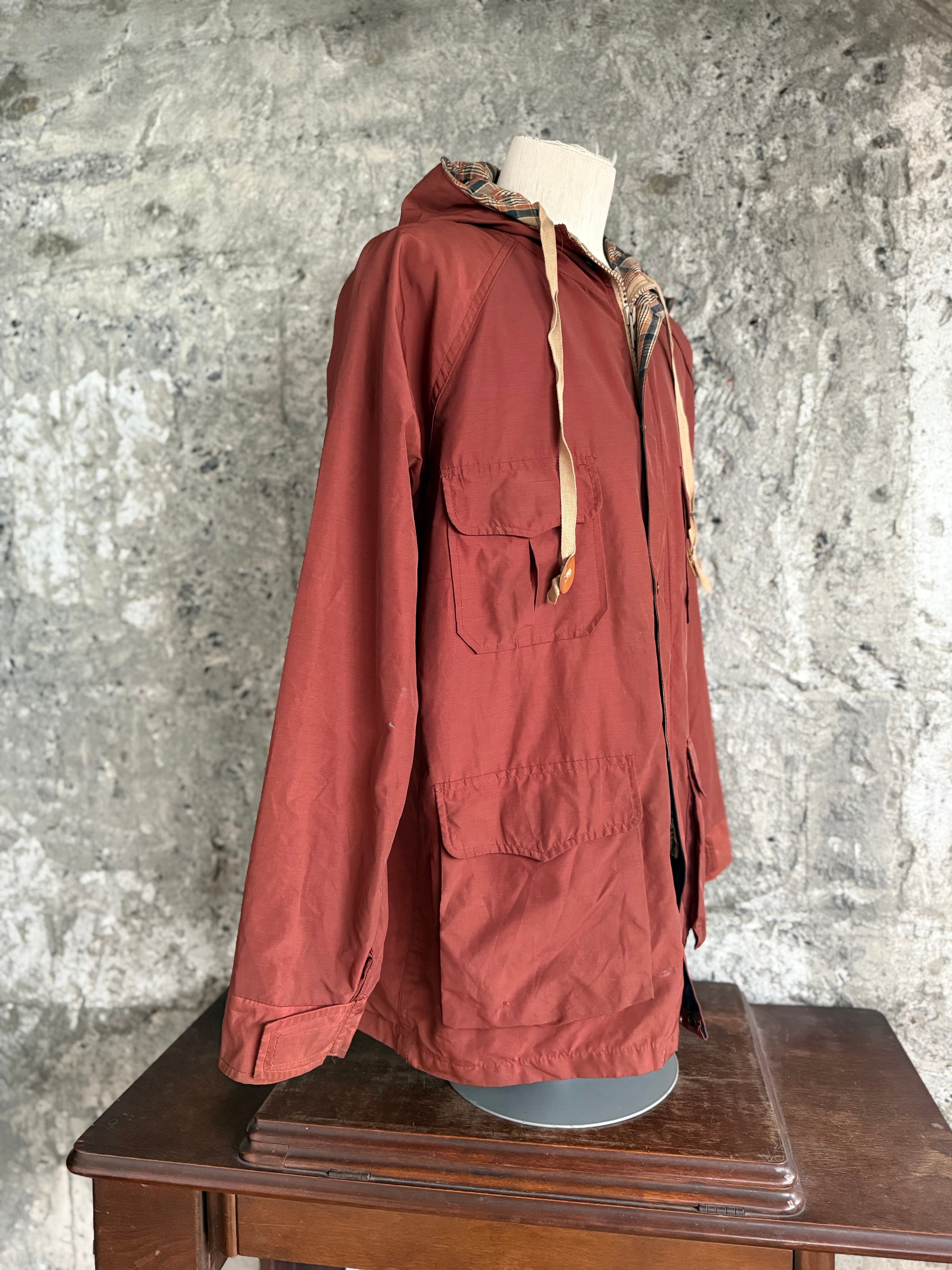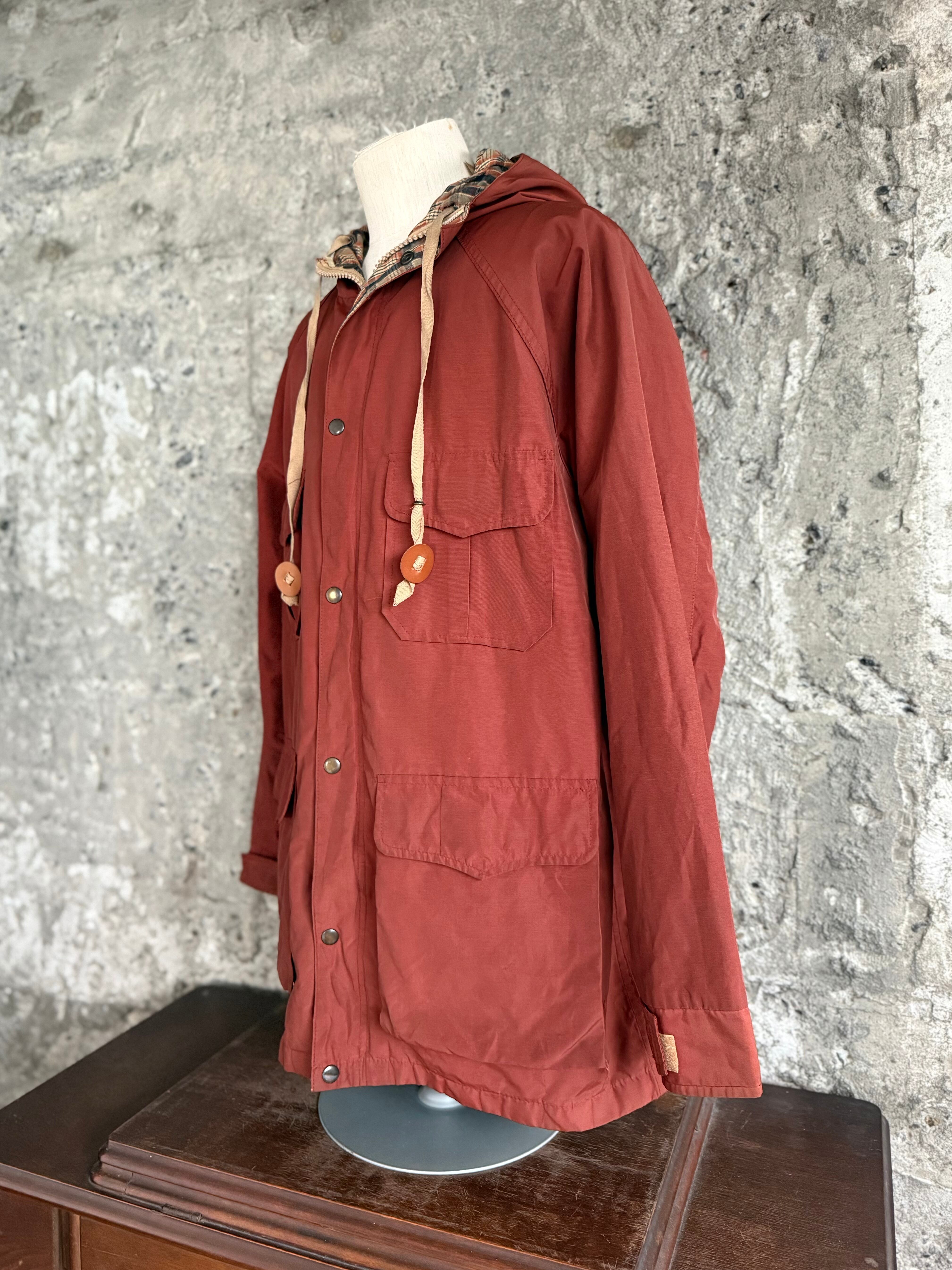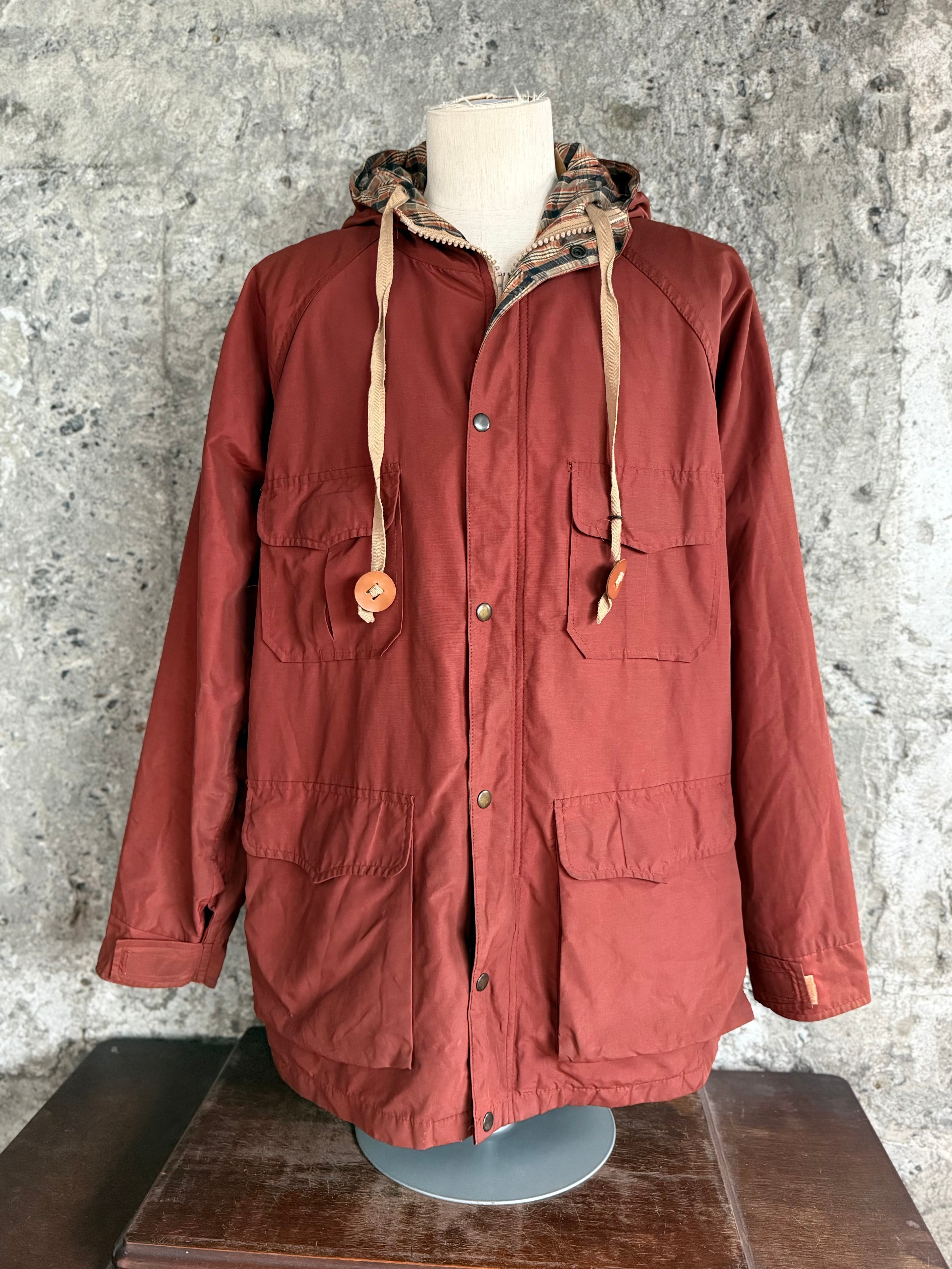 落ち着いたレンガカラーのボディに、フードと内側はチェック柄ライナー。