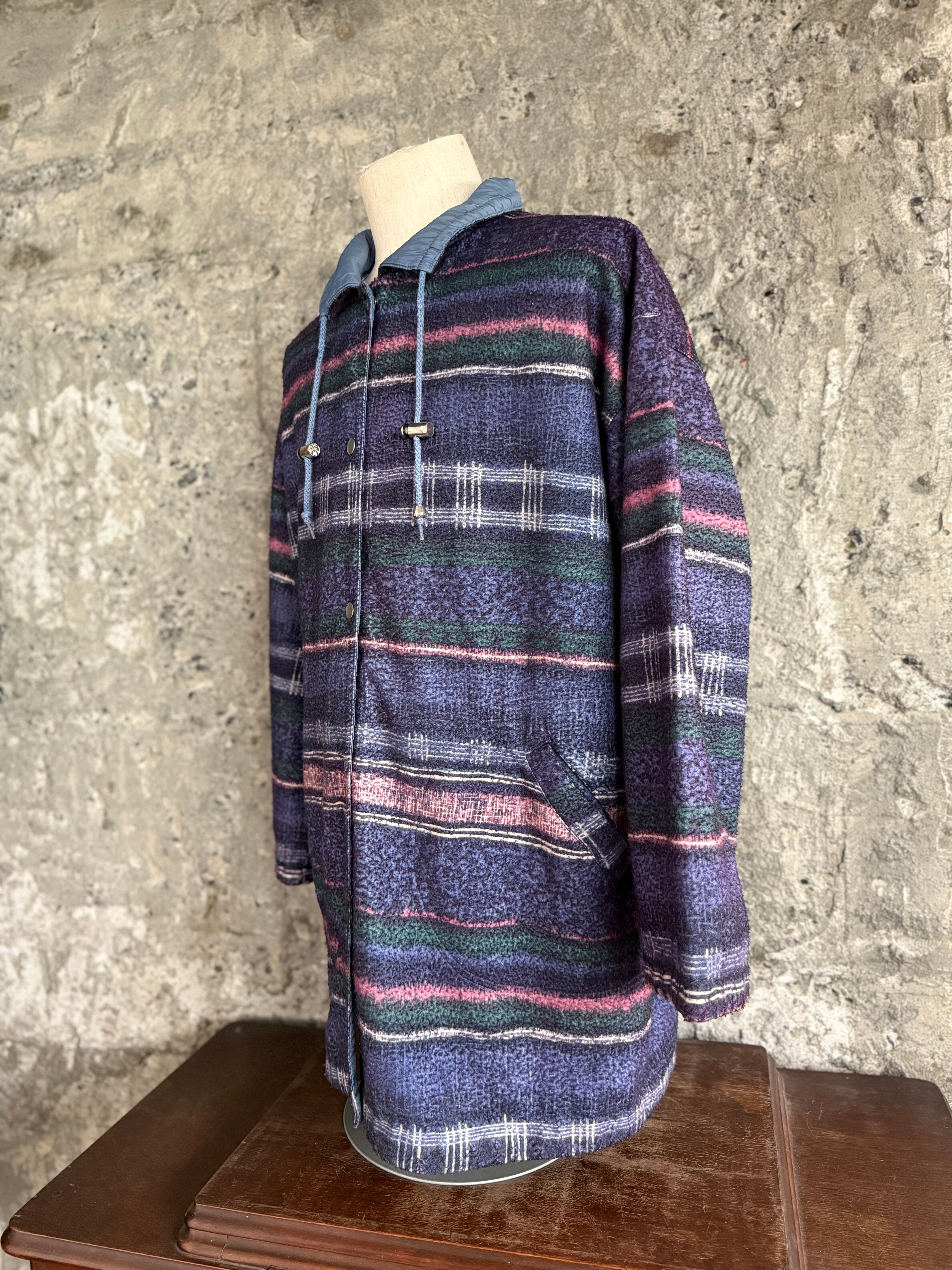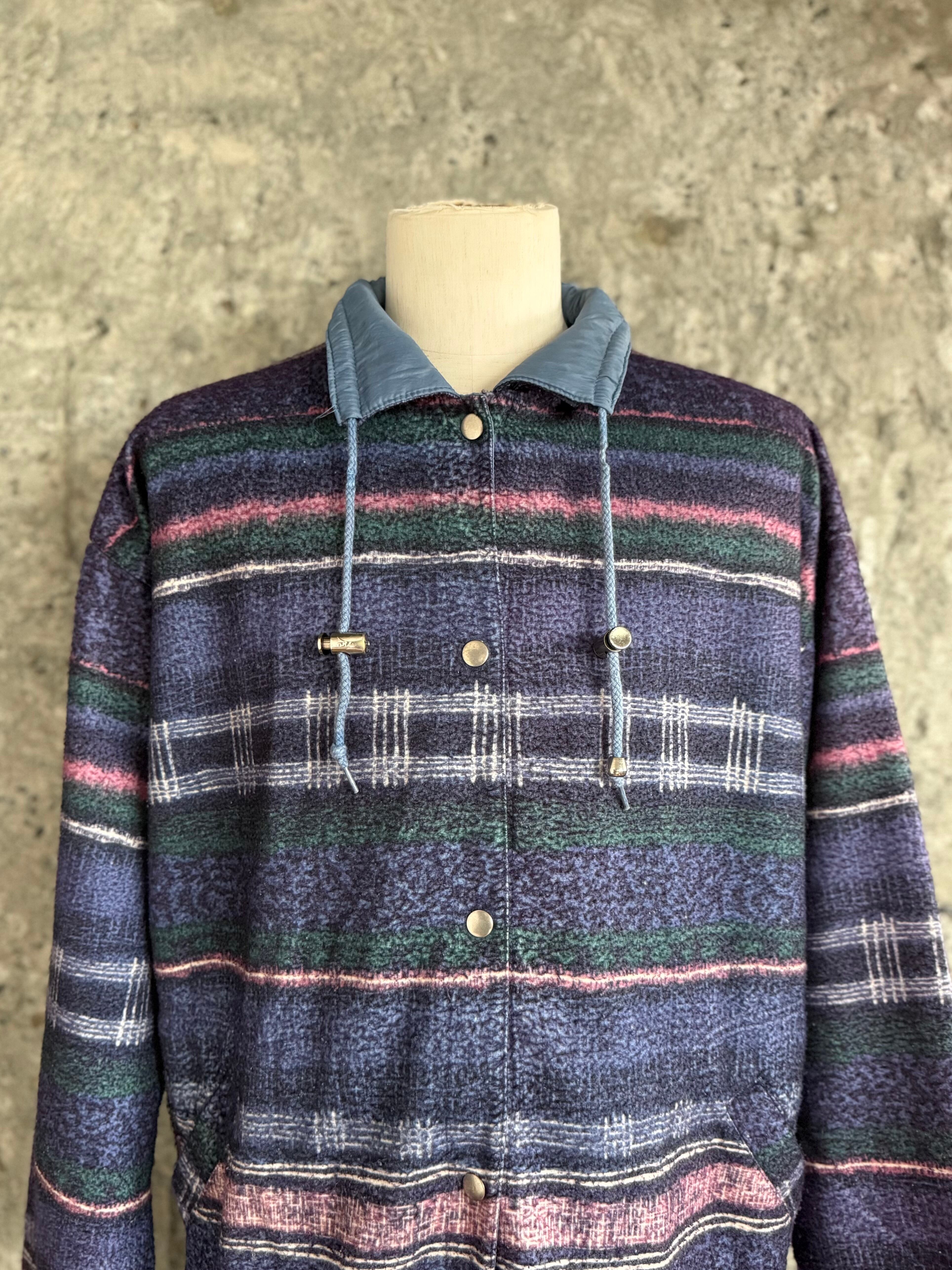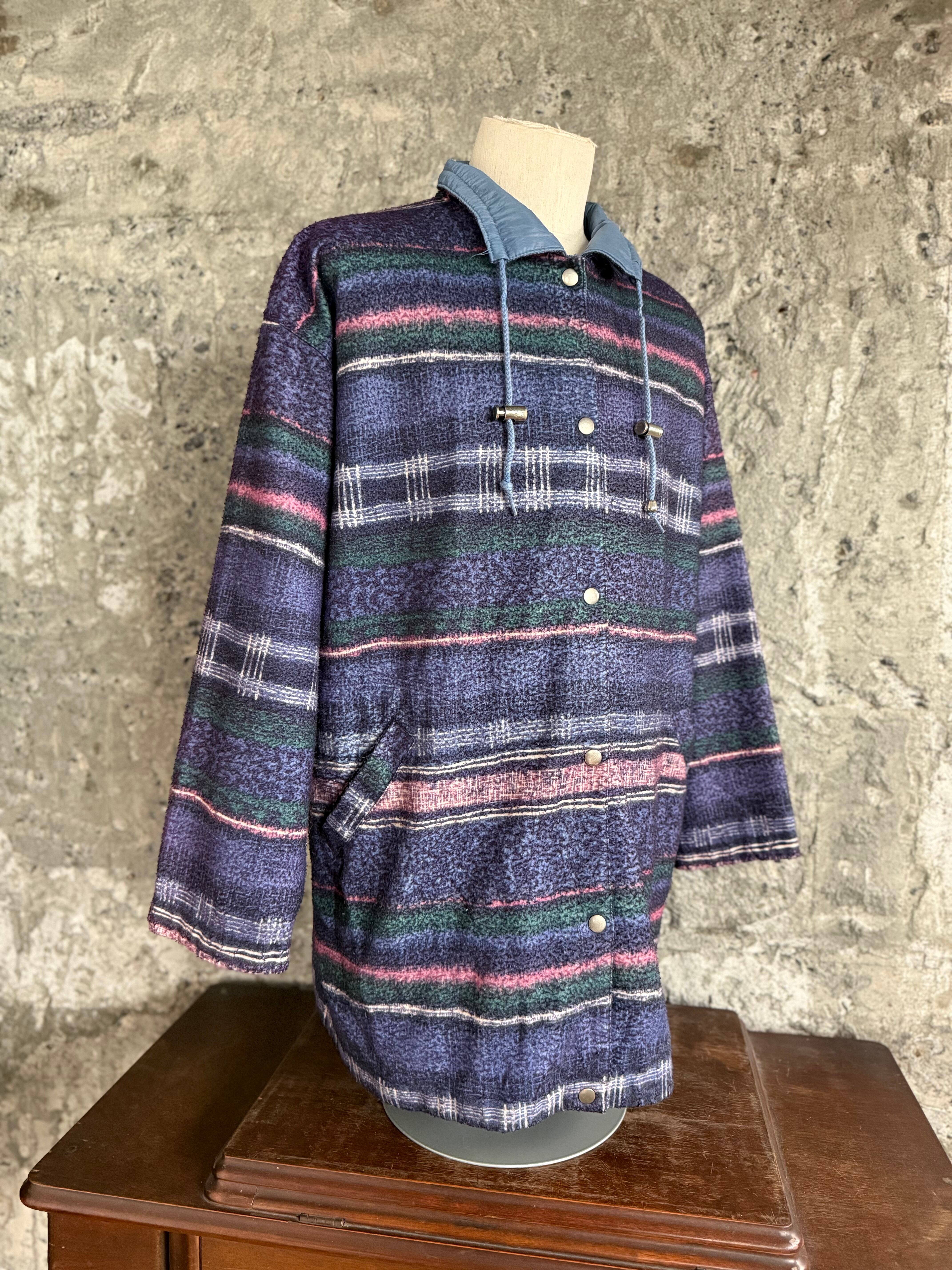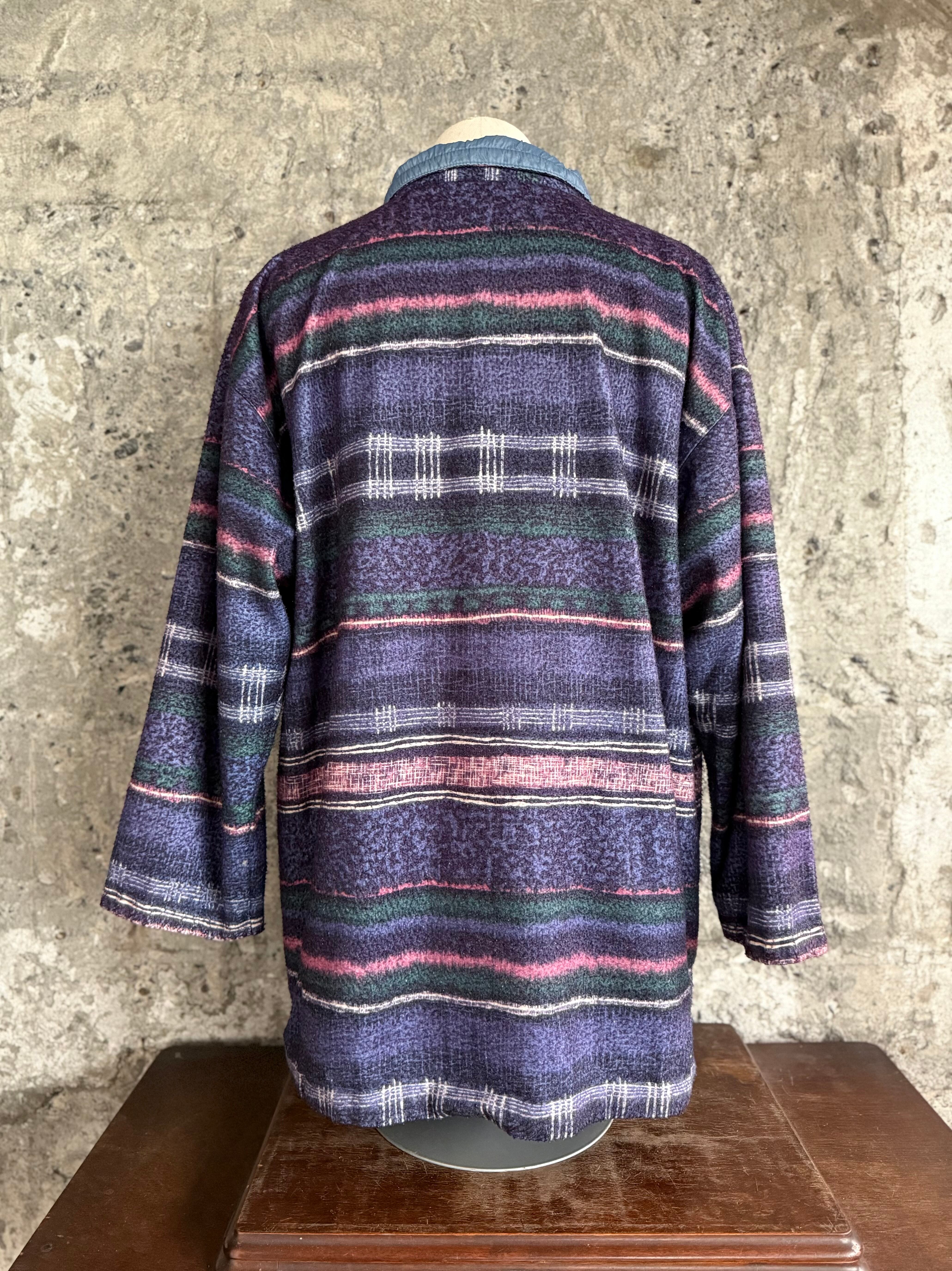 フリース面は、ネイビーをベースにピンクやグリーンが織り交ぜられた奥行きのある配色で、