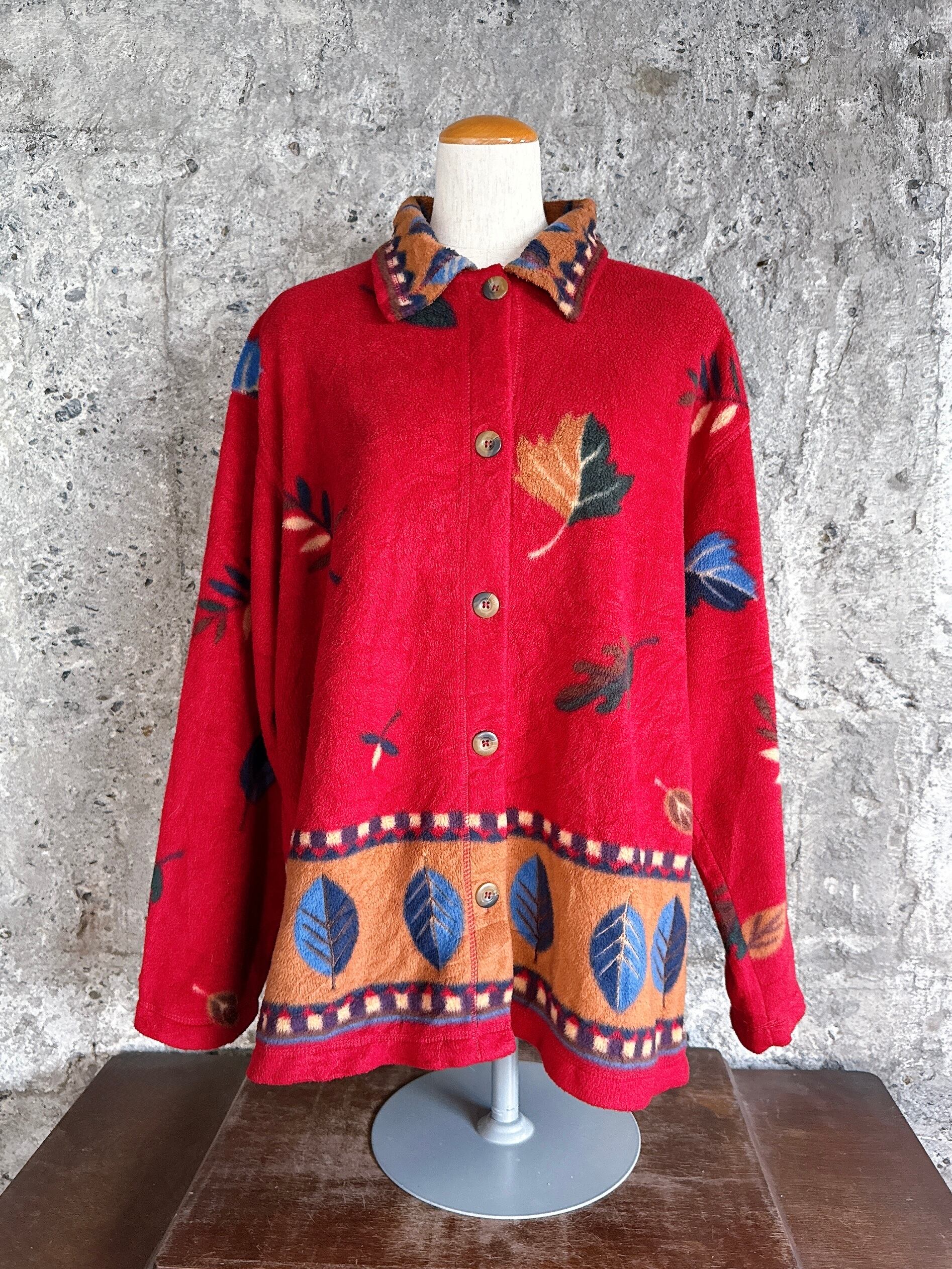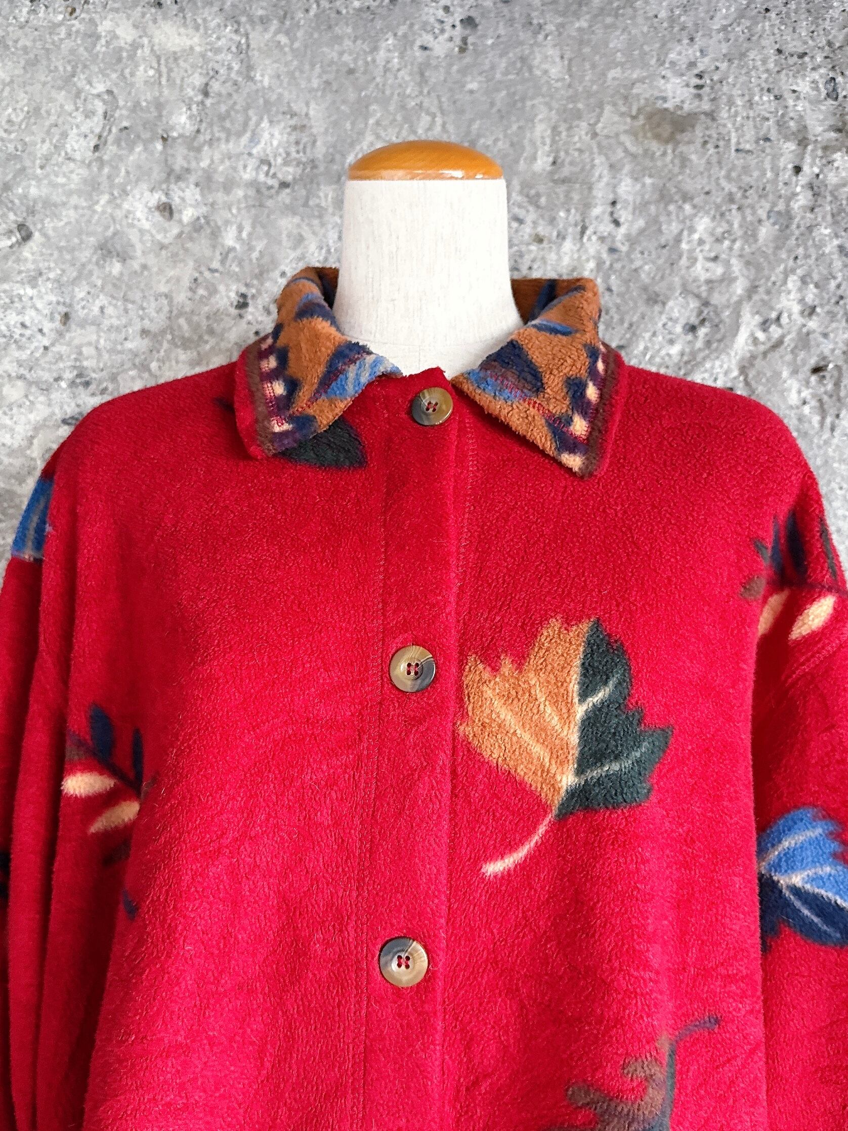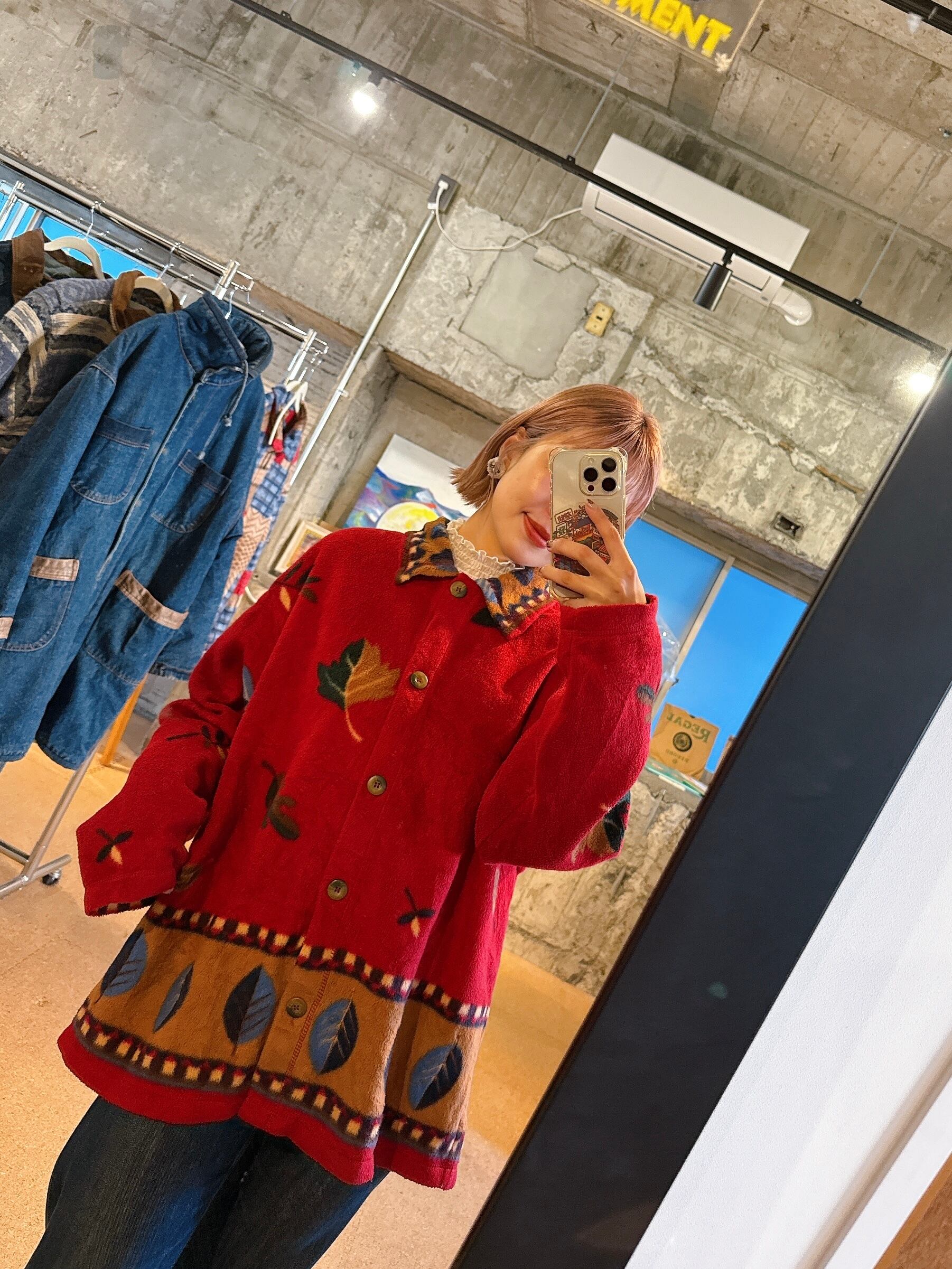 深みのあるレッドカラーに、落ち葉モチーフの総柄が映える一枚。