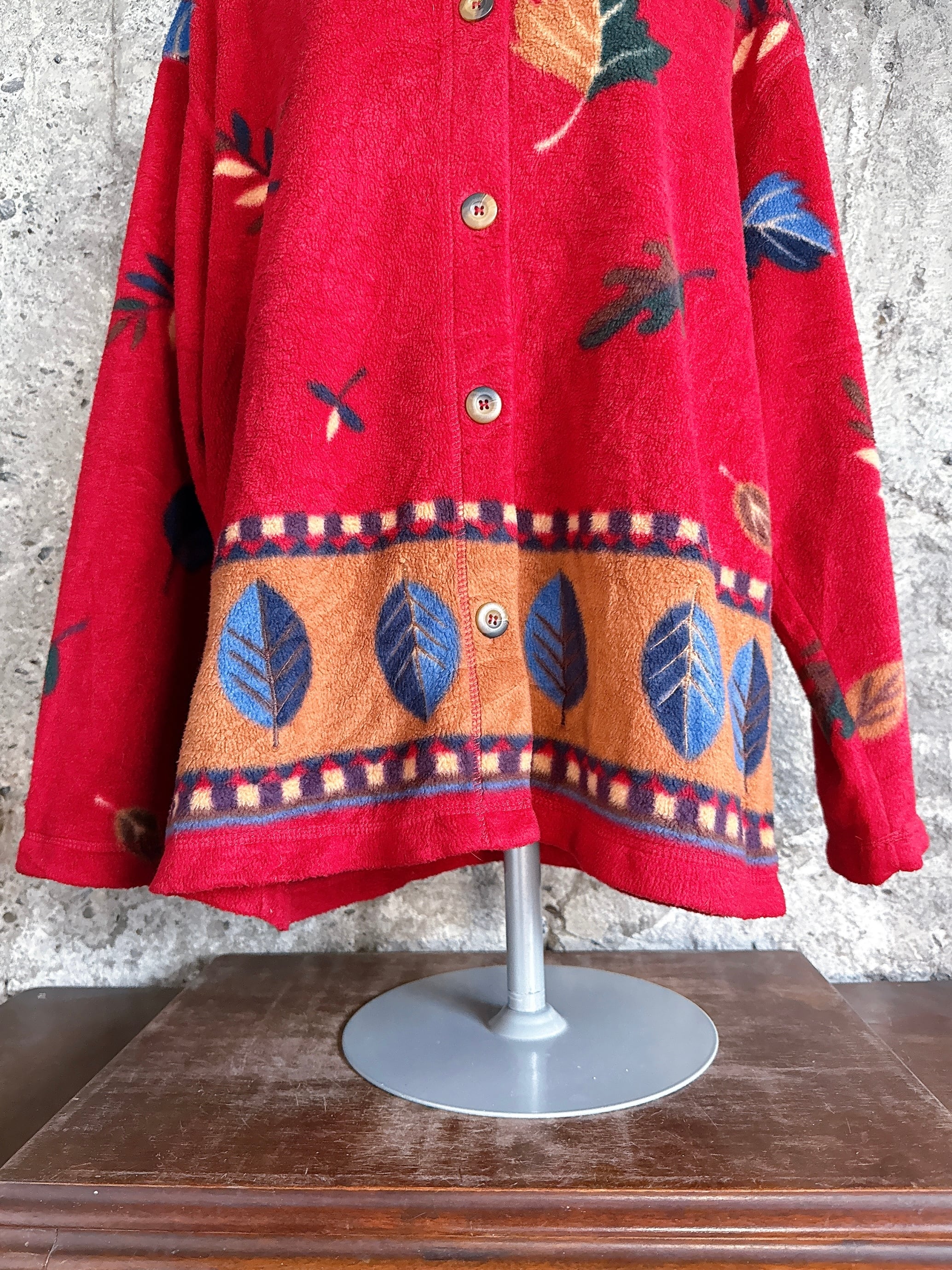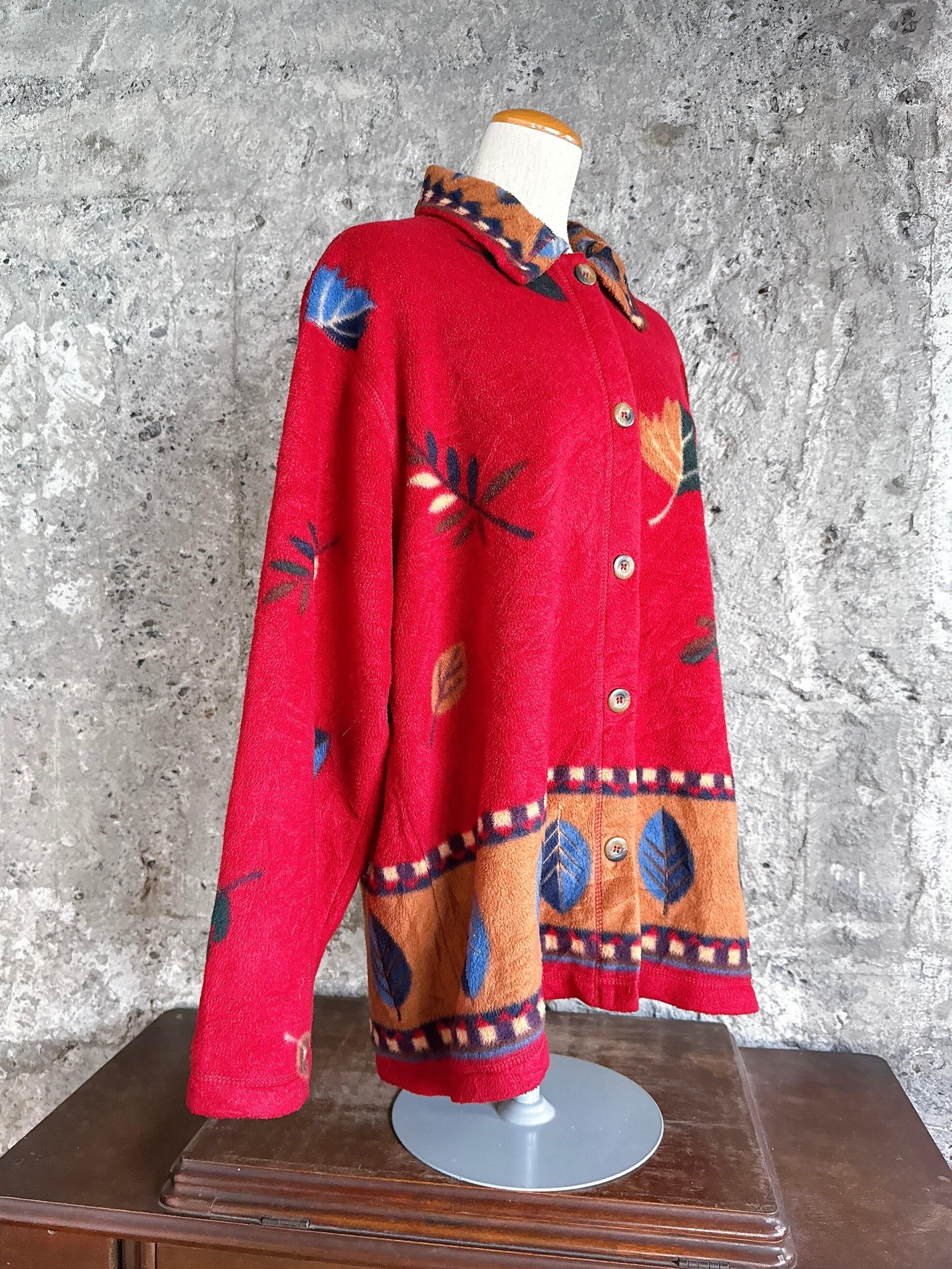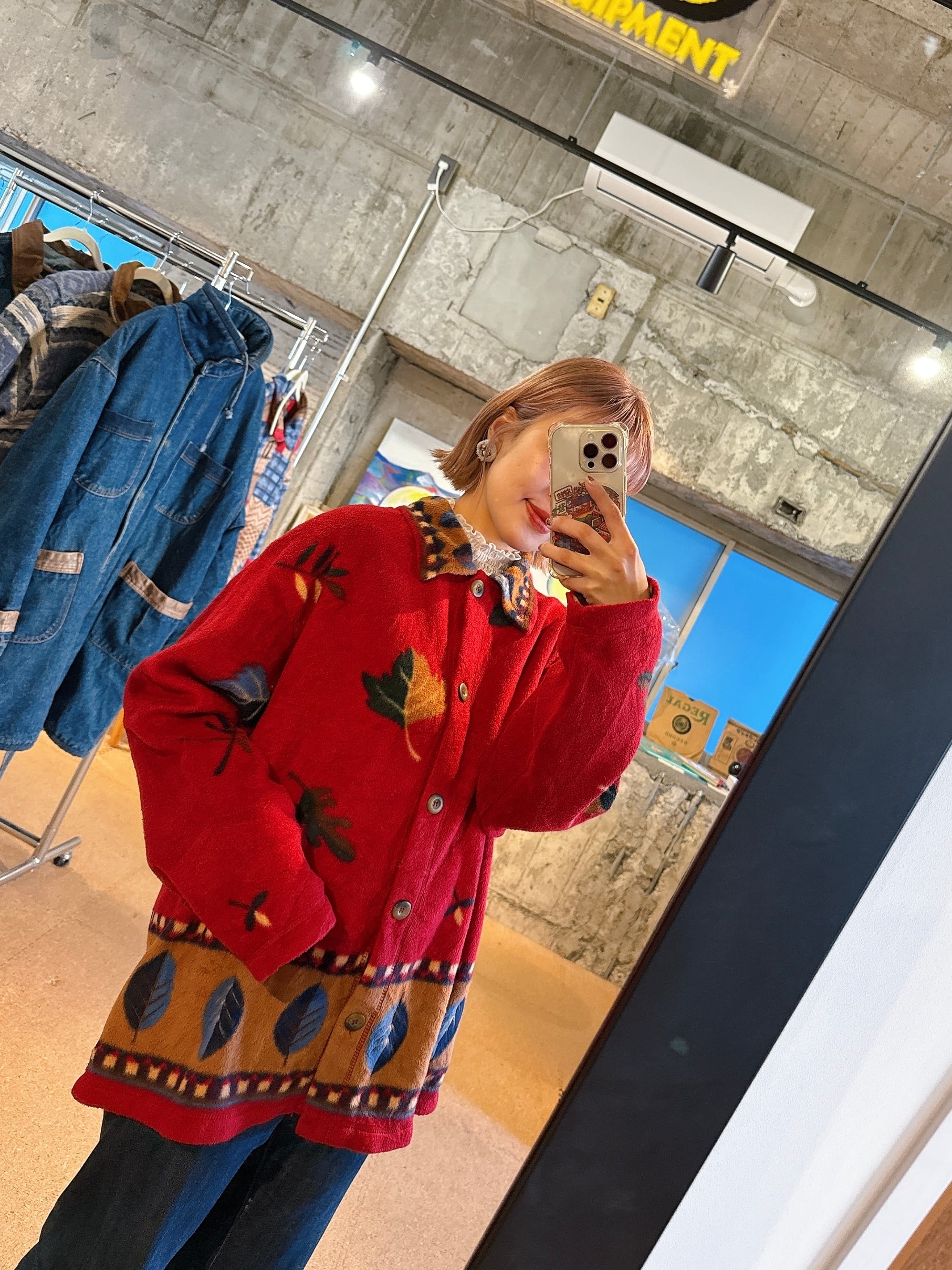 深みのあるレッドカラーに、落ち葉モチーフの総柄が映える一枚。