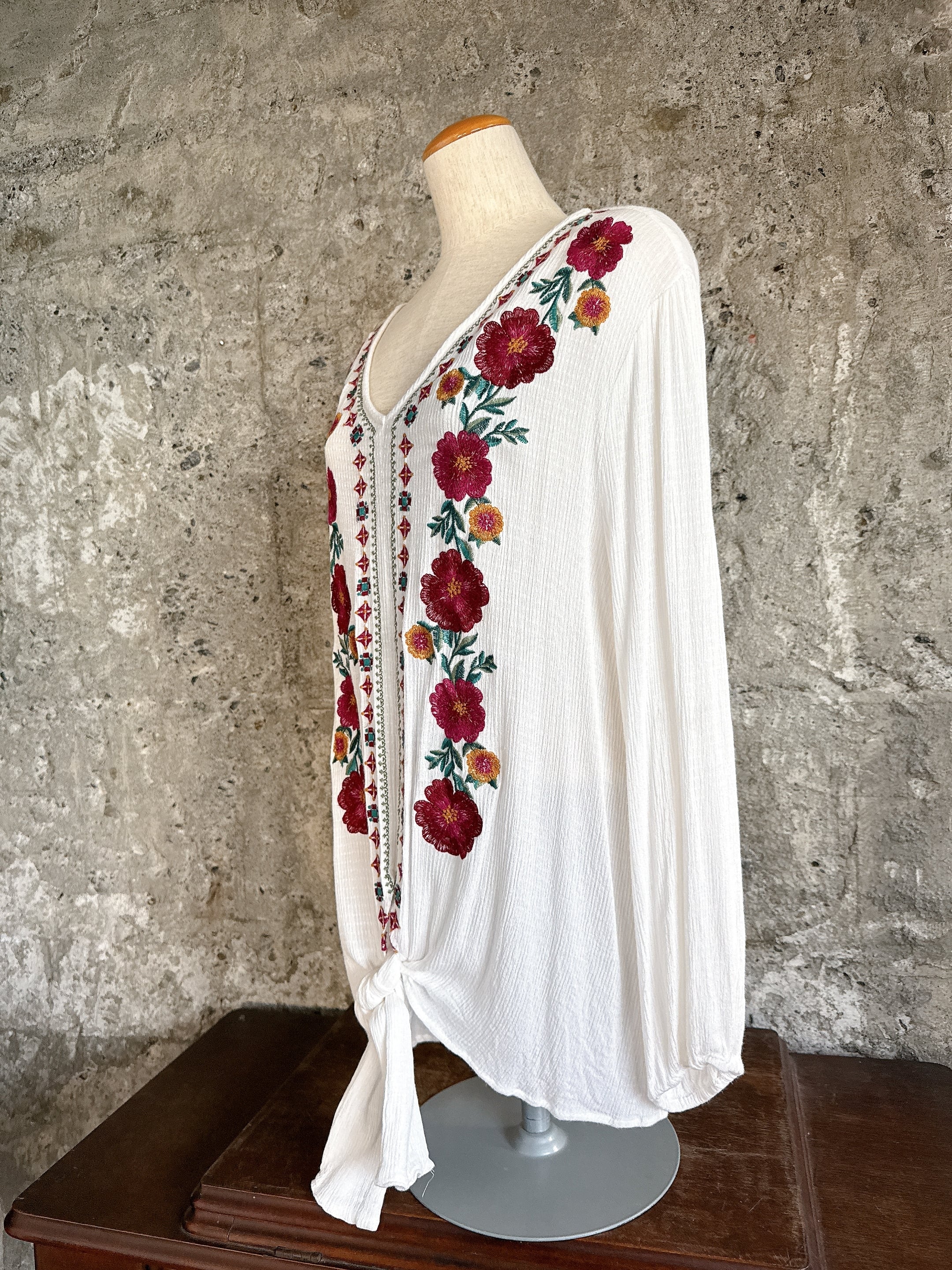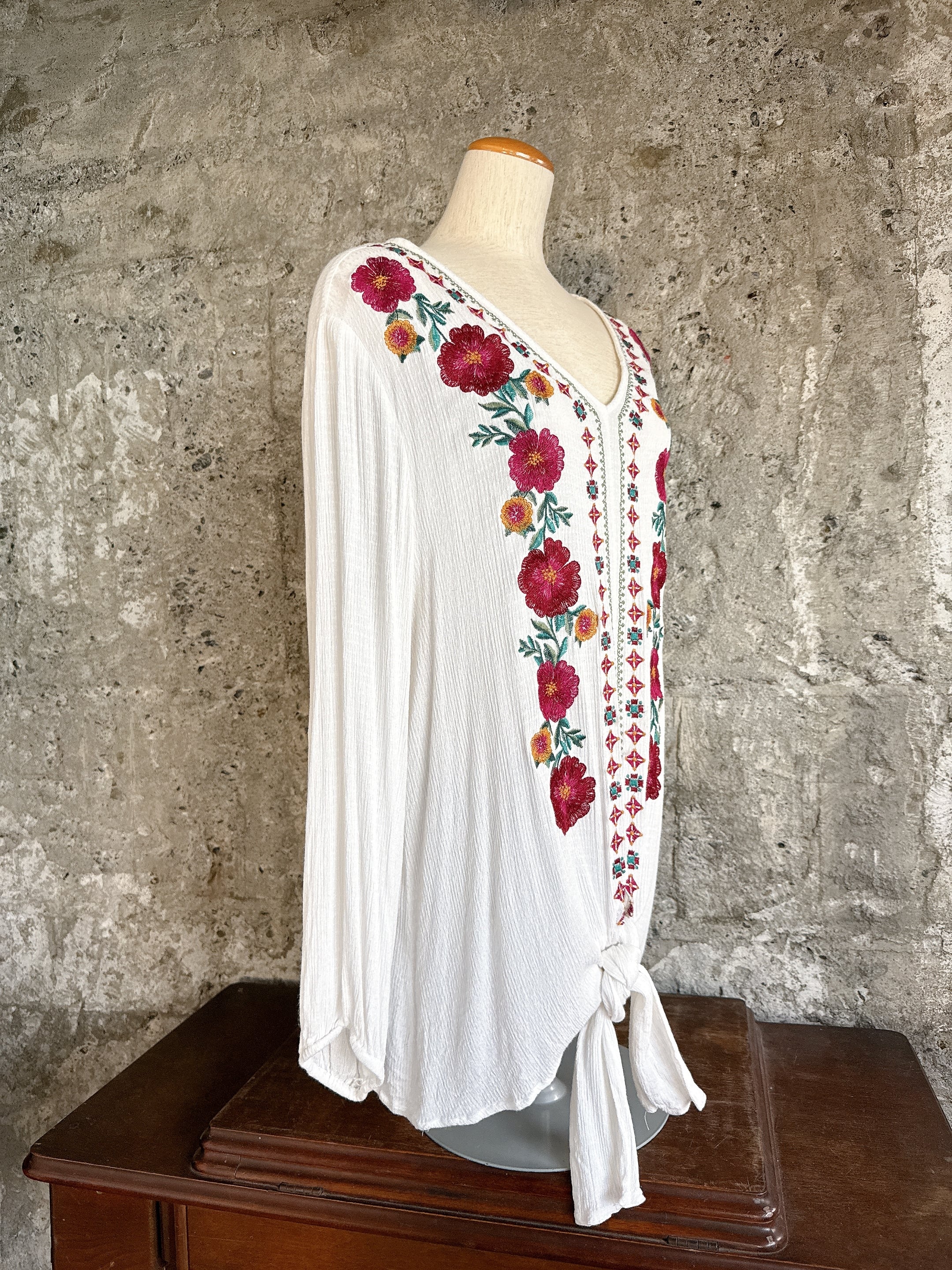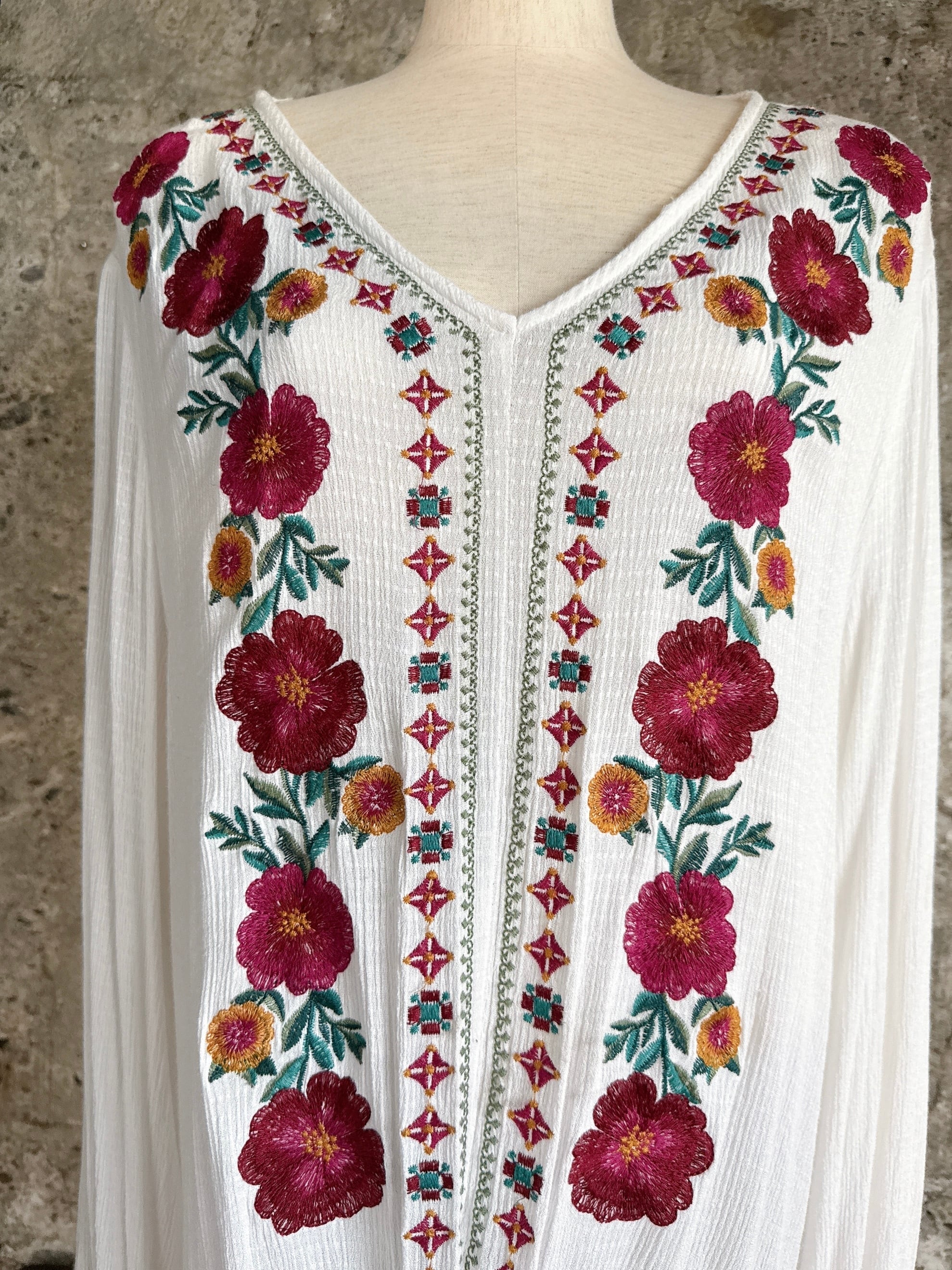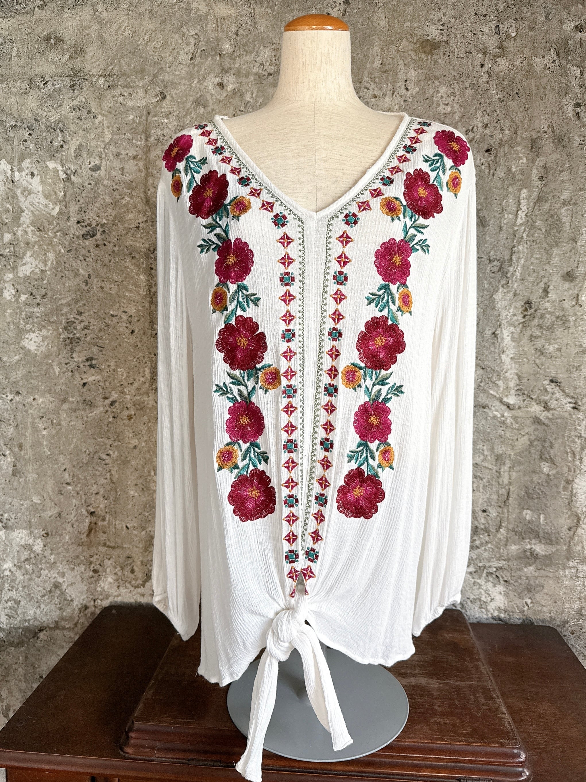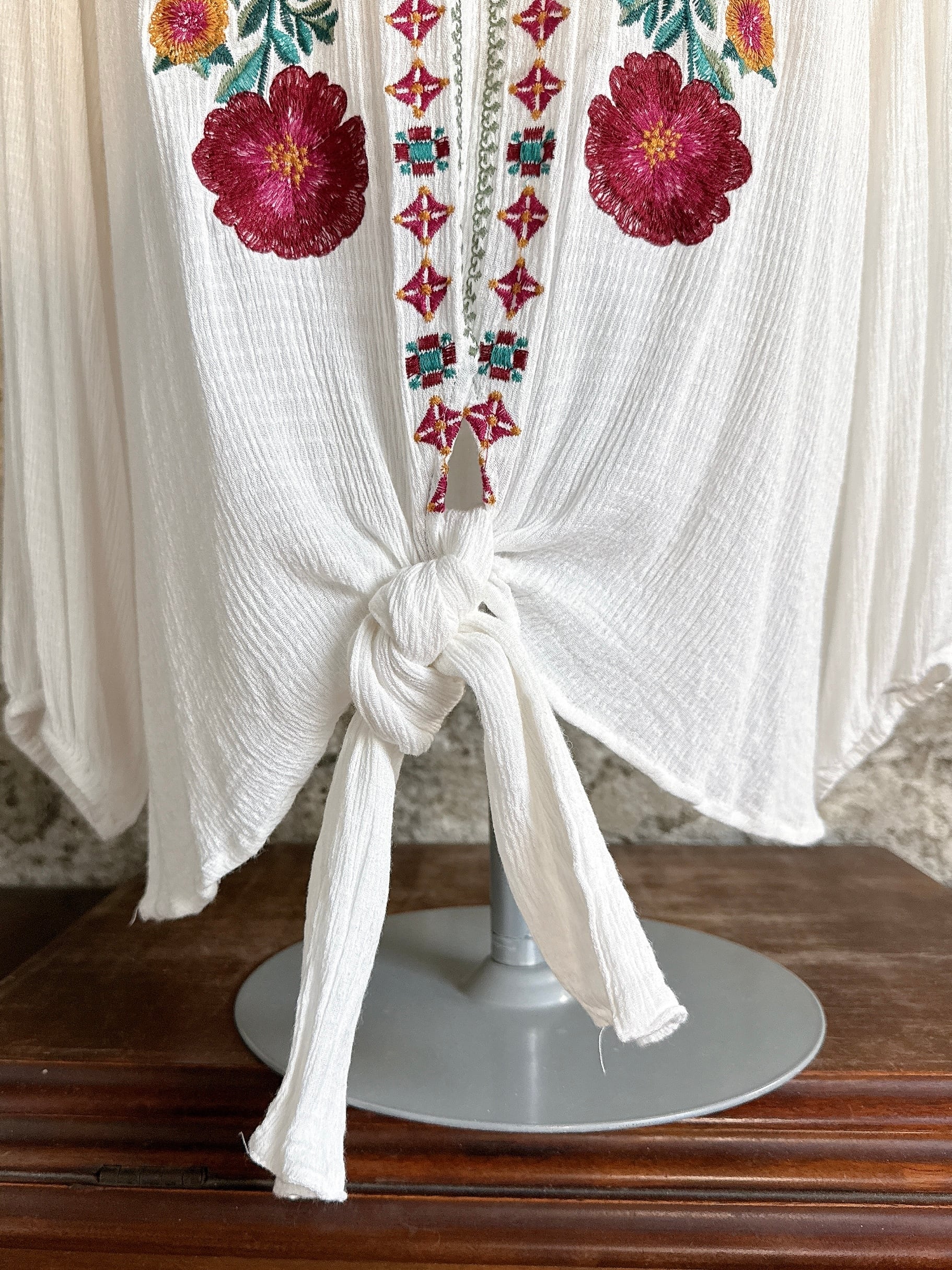 胸元には赤をベースにしたカラフルな花刺繍が施され、