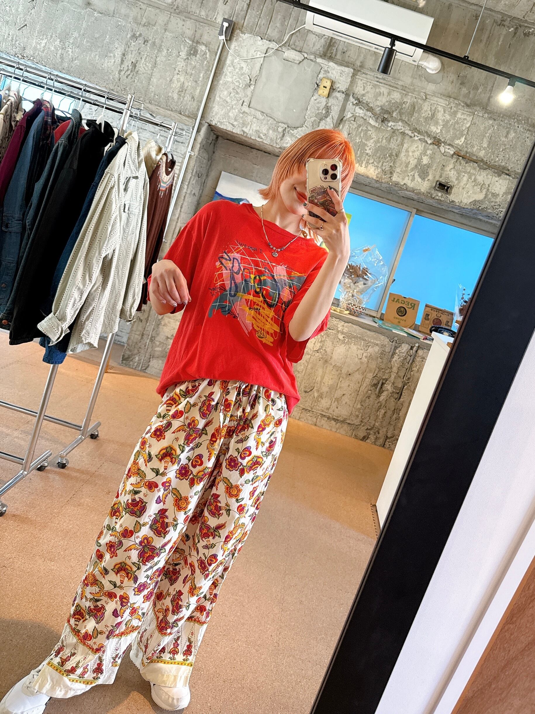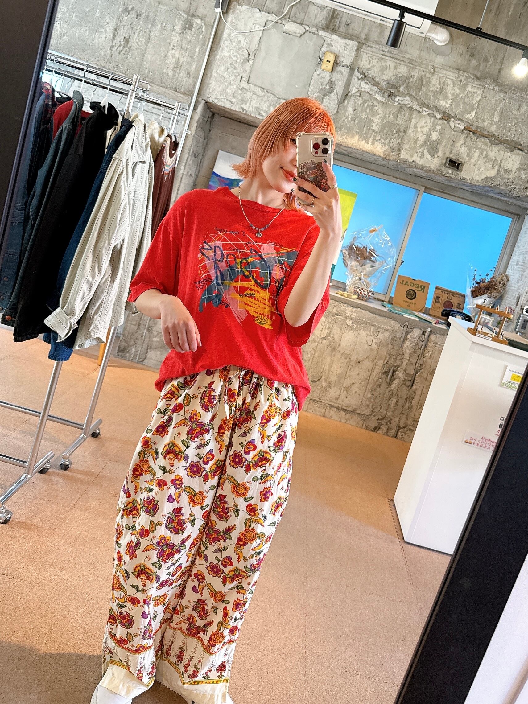 鮮やかなレッドに、アートのようなグラフィックが映えるプリントT。