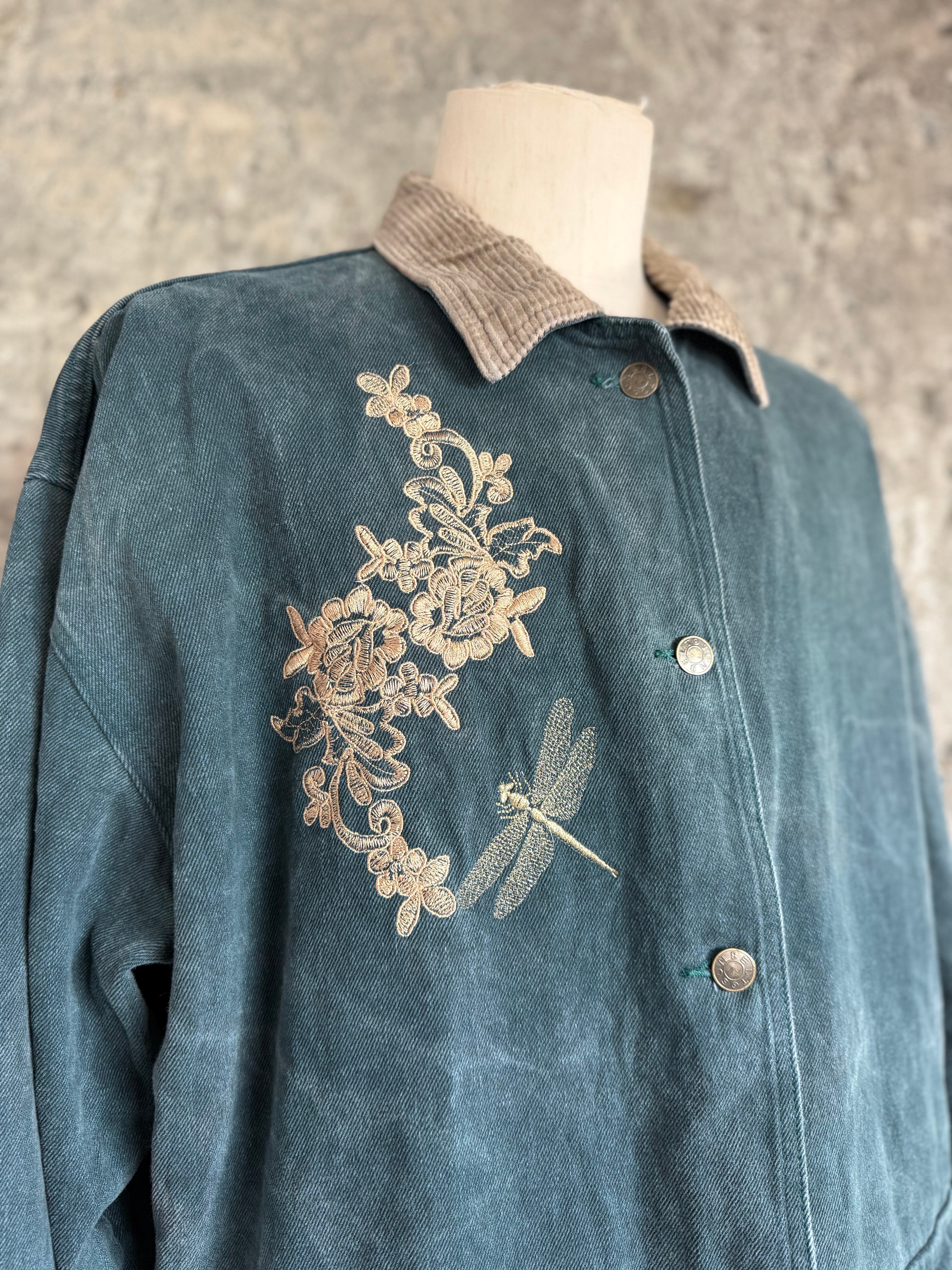 フラワー&トンボ刺繍 カラーデニムジャケット ブルーグリーン