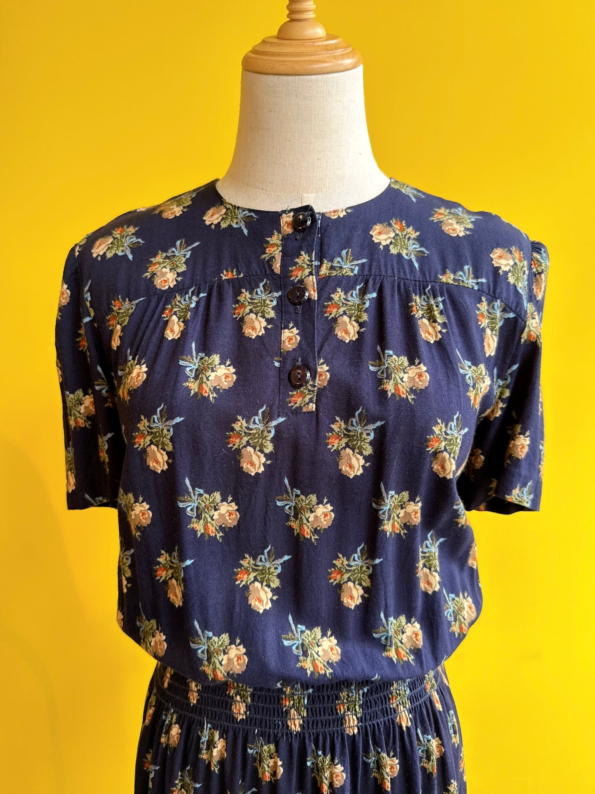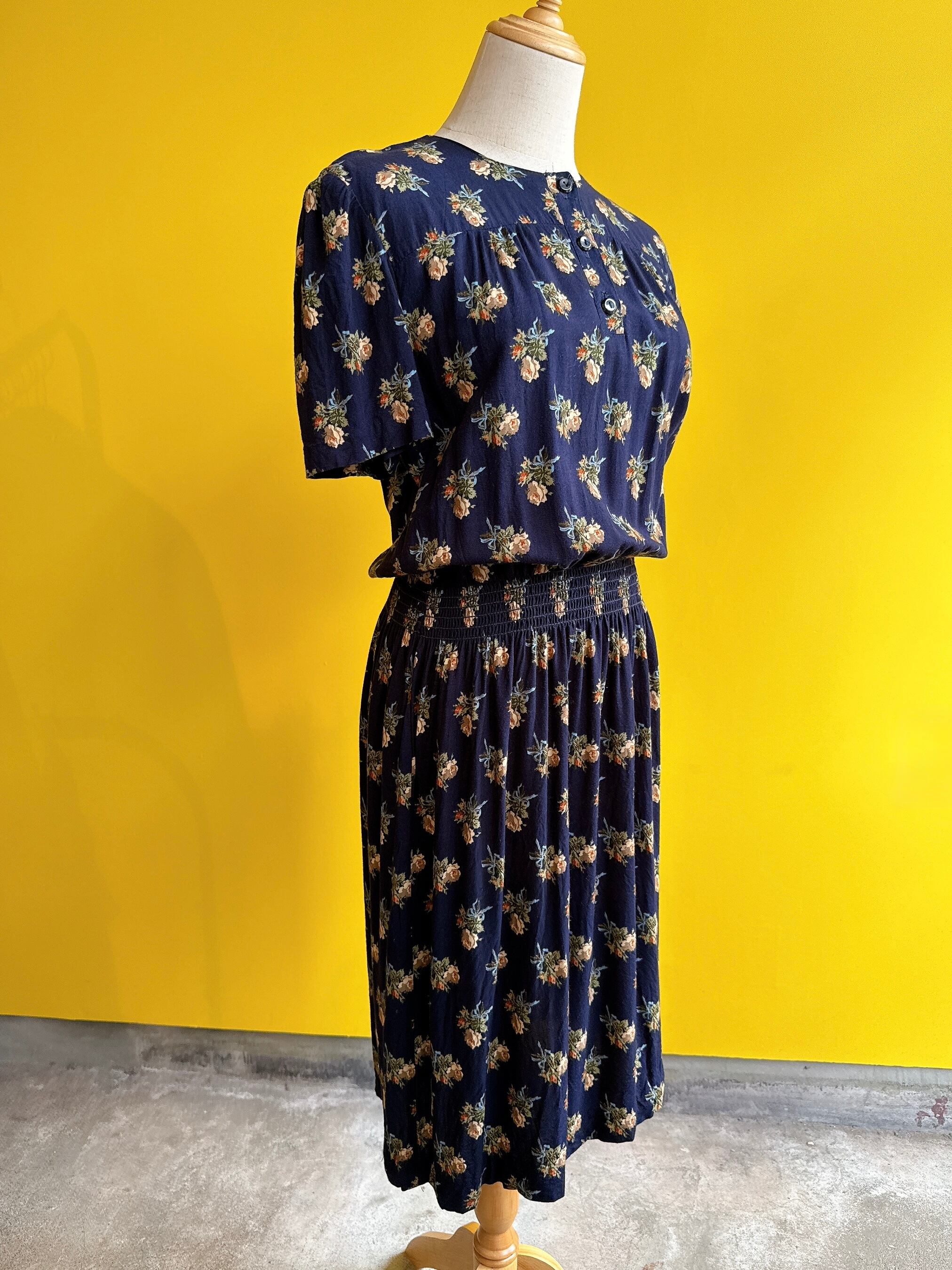 落ち着いたネイビーに、小ぶりの花柄がやさしく映えるヴィンテージワンピース。