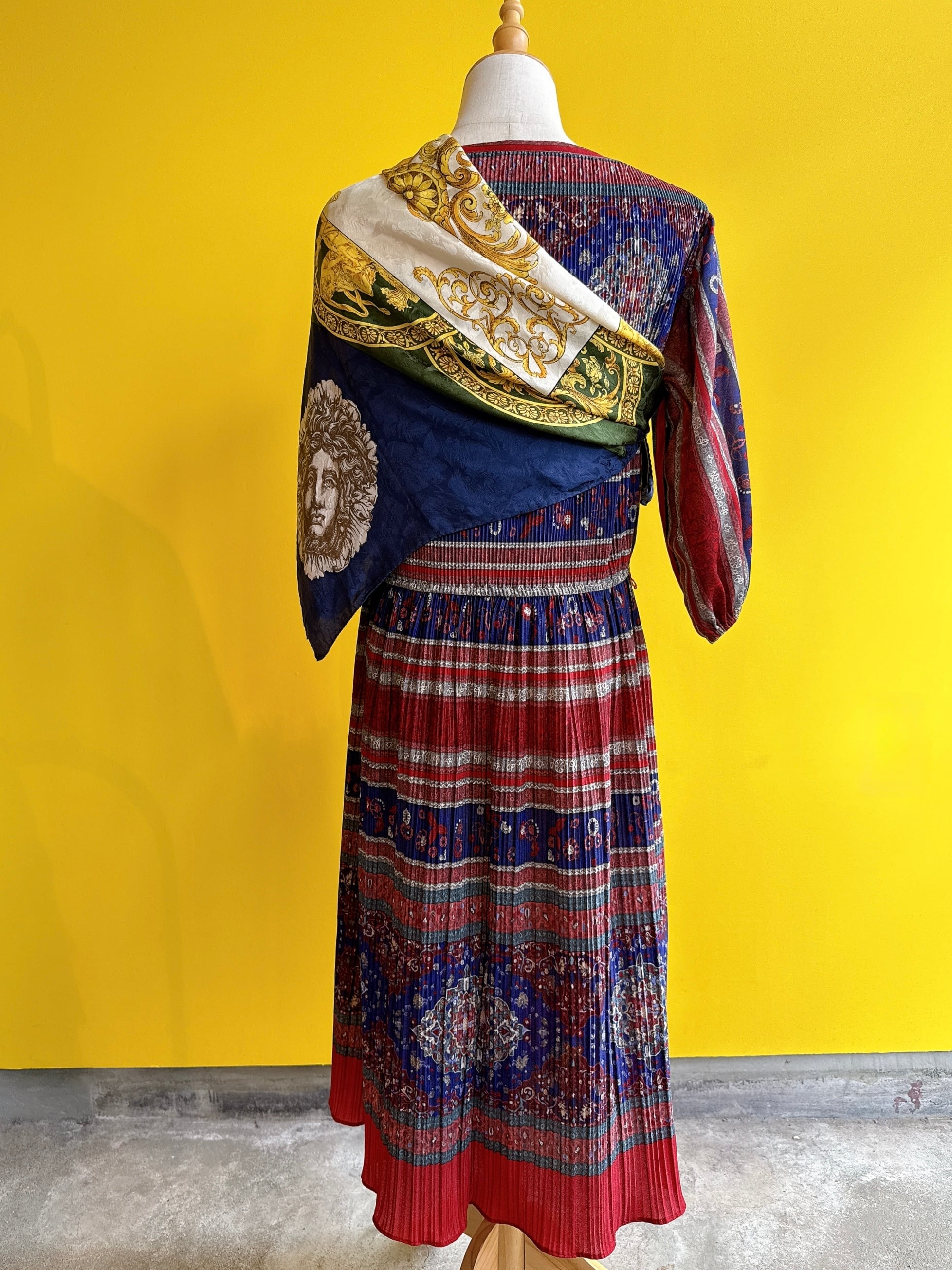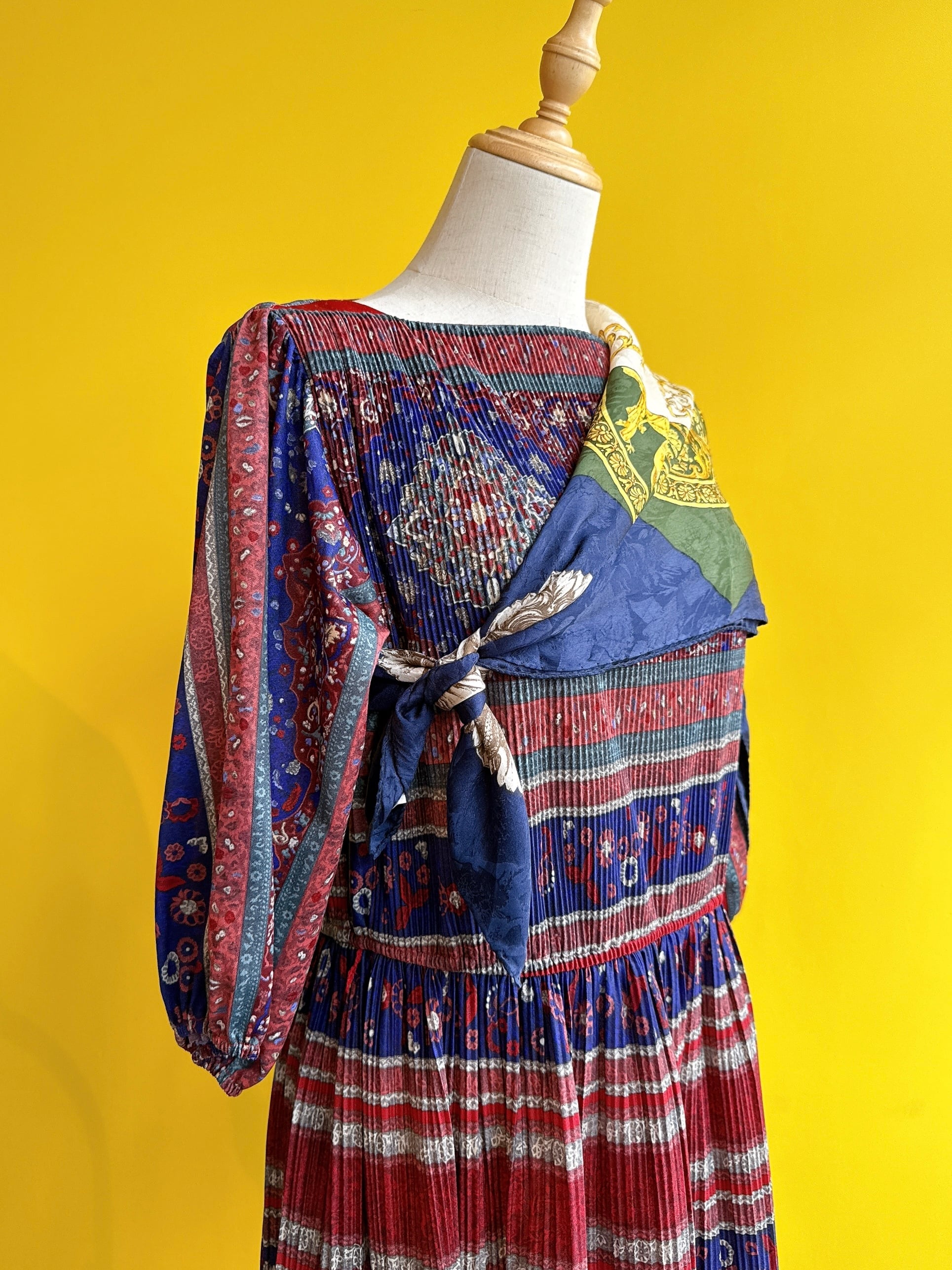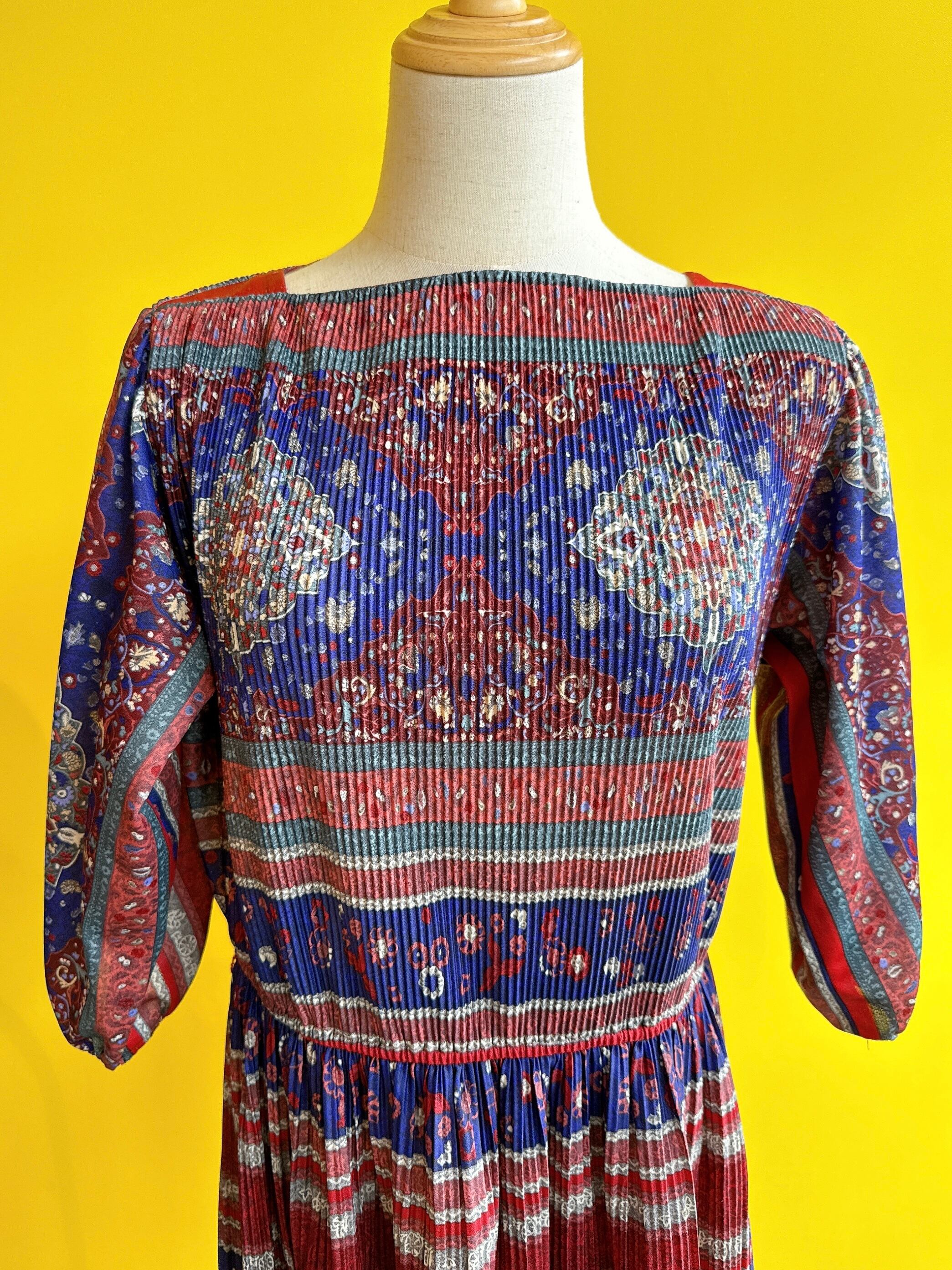 ボルドーとブルーを基調にした、印象的なパネル柄が目を惹くヴィンテージワンピース。