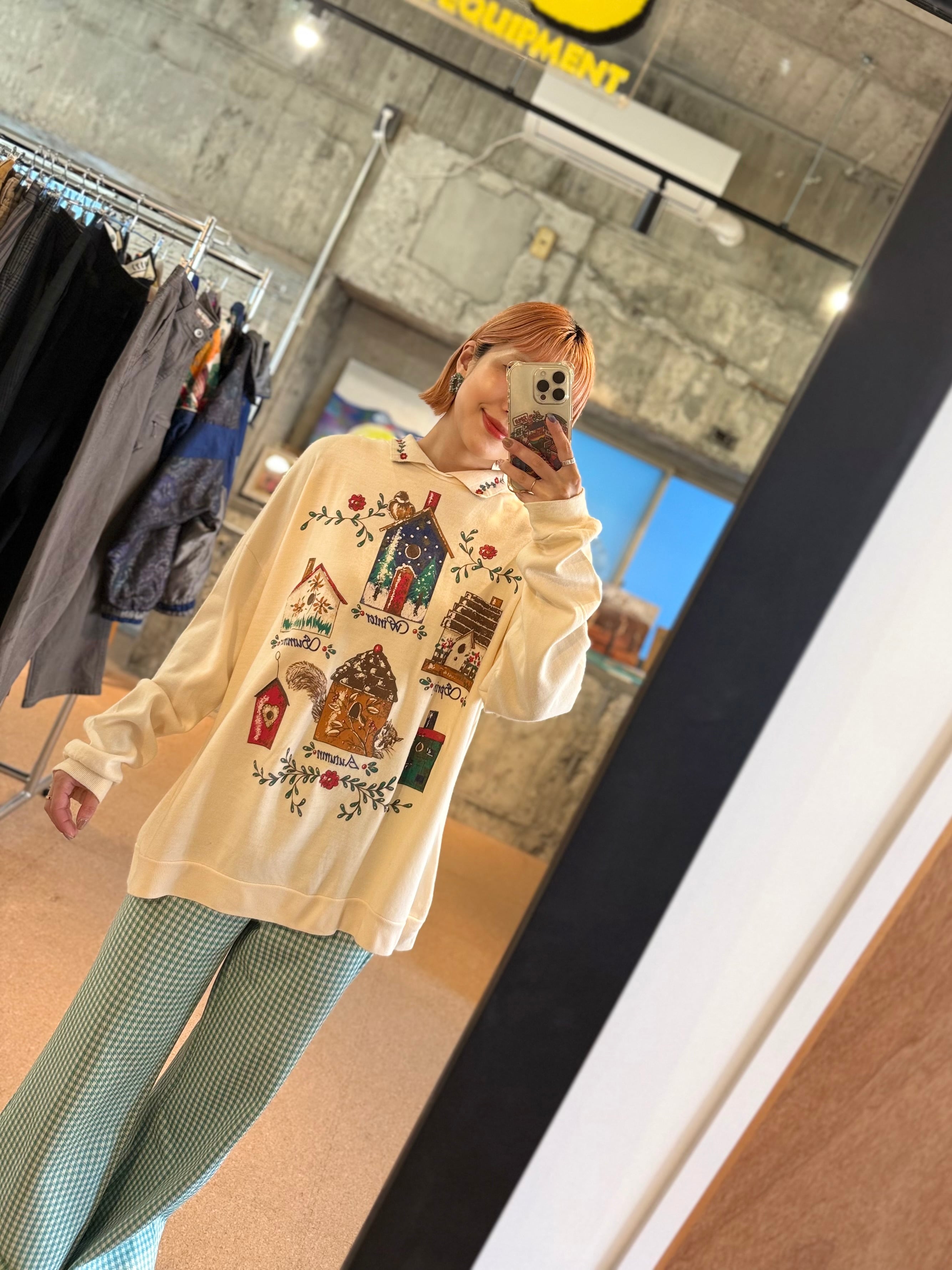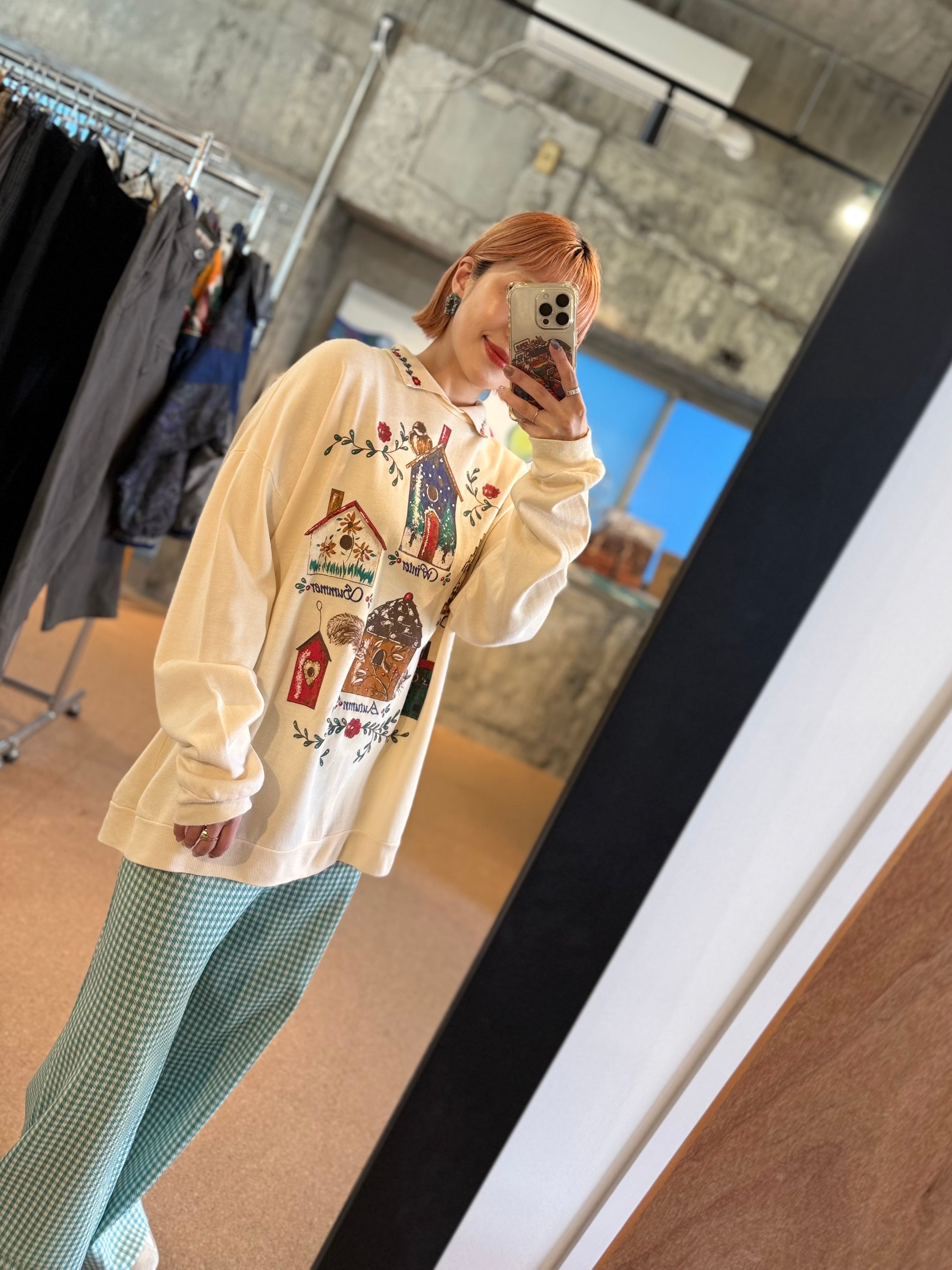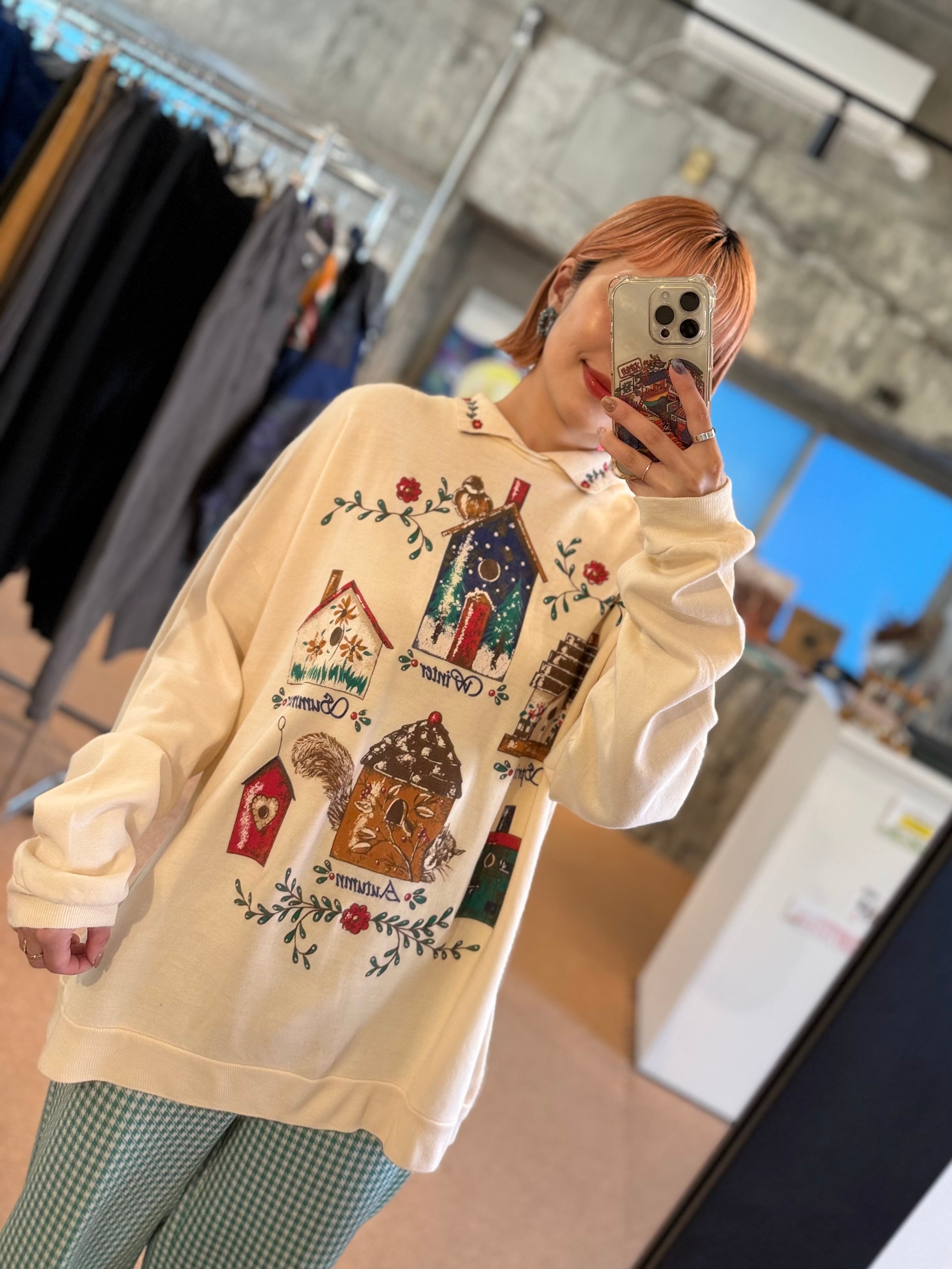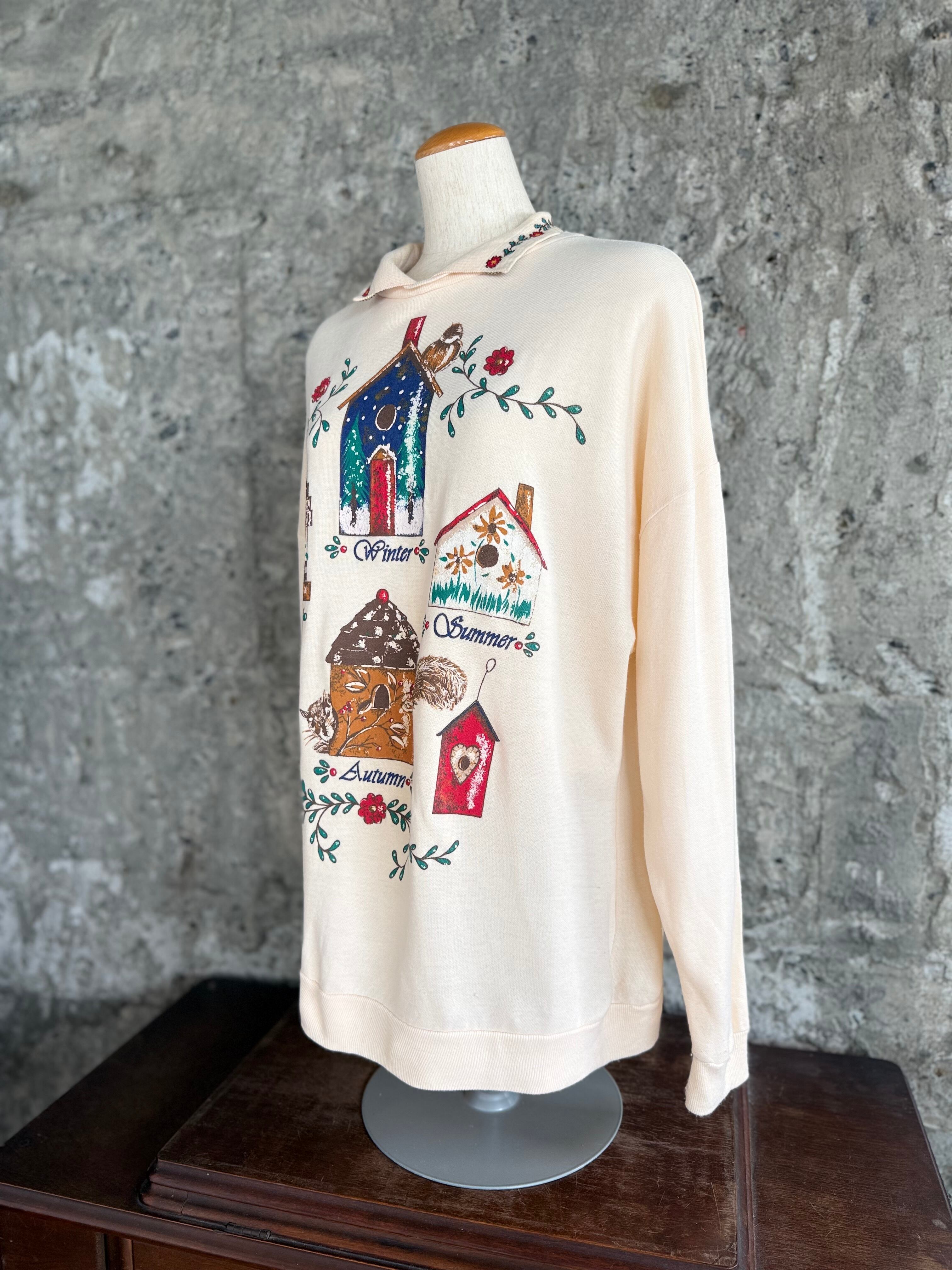 やわらかなアイボリーカラーに、四季をイメージしたバードハウスモチーフが描かれた襟付きプルオーバー。