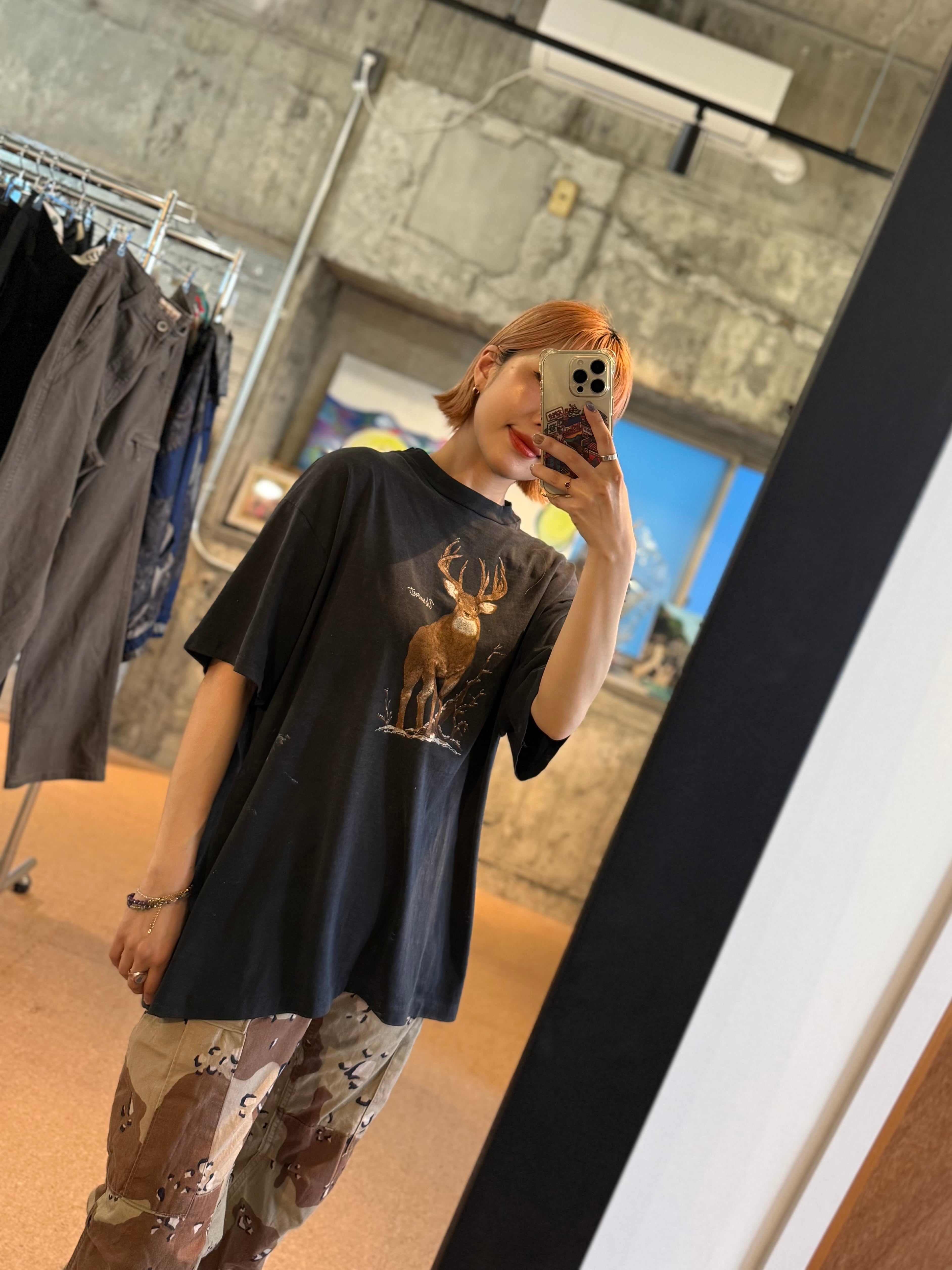 落ち着いたブラックボディに、存在感のある鹿モチーフが映えるプリントTシャツ。