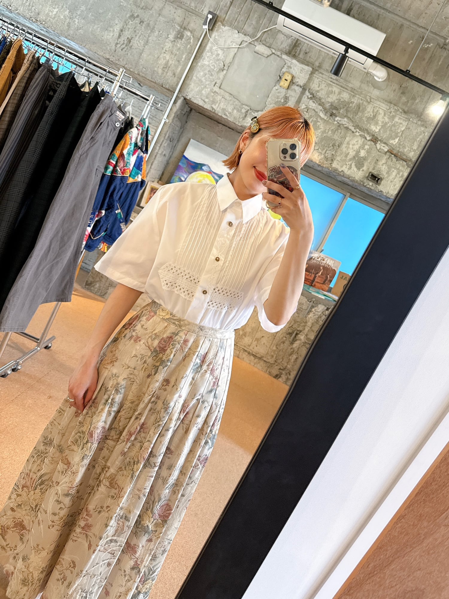 淡いベージュをベースに、くすみピンクやイエロー、グリーンの花柄がやさしく映えるロングスカート。